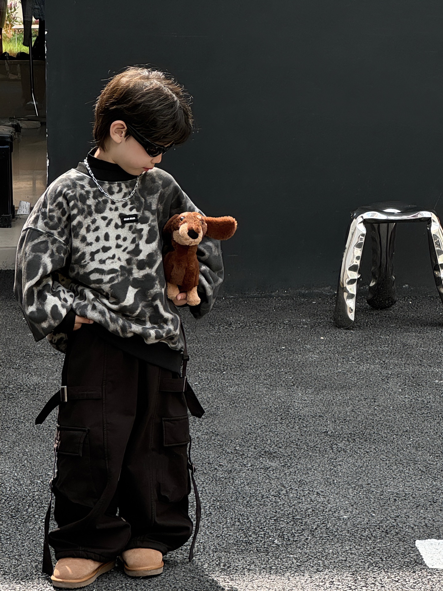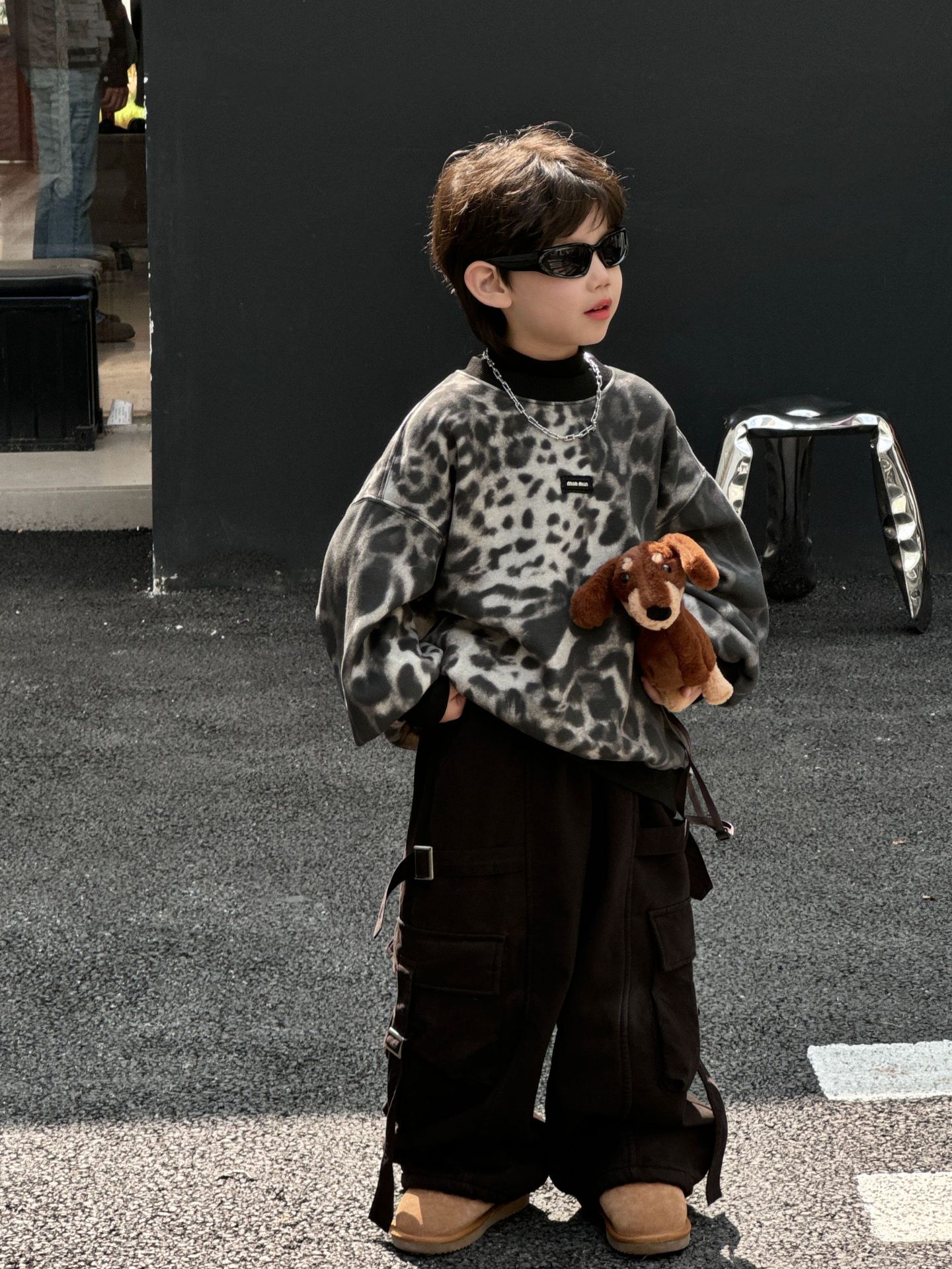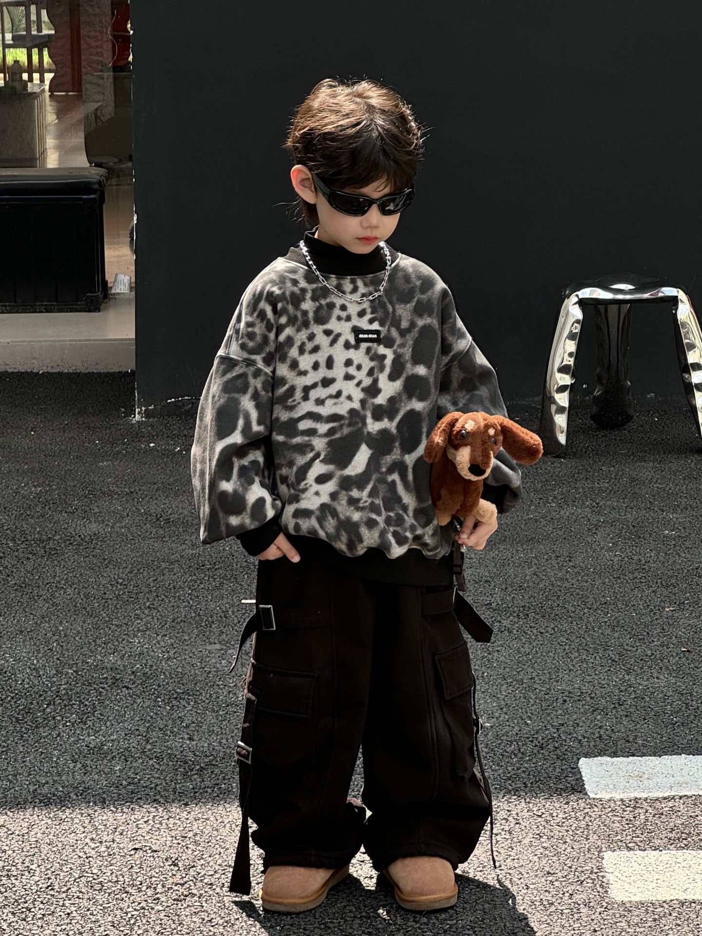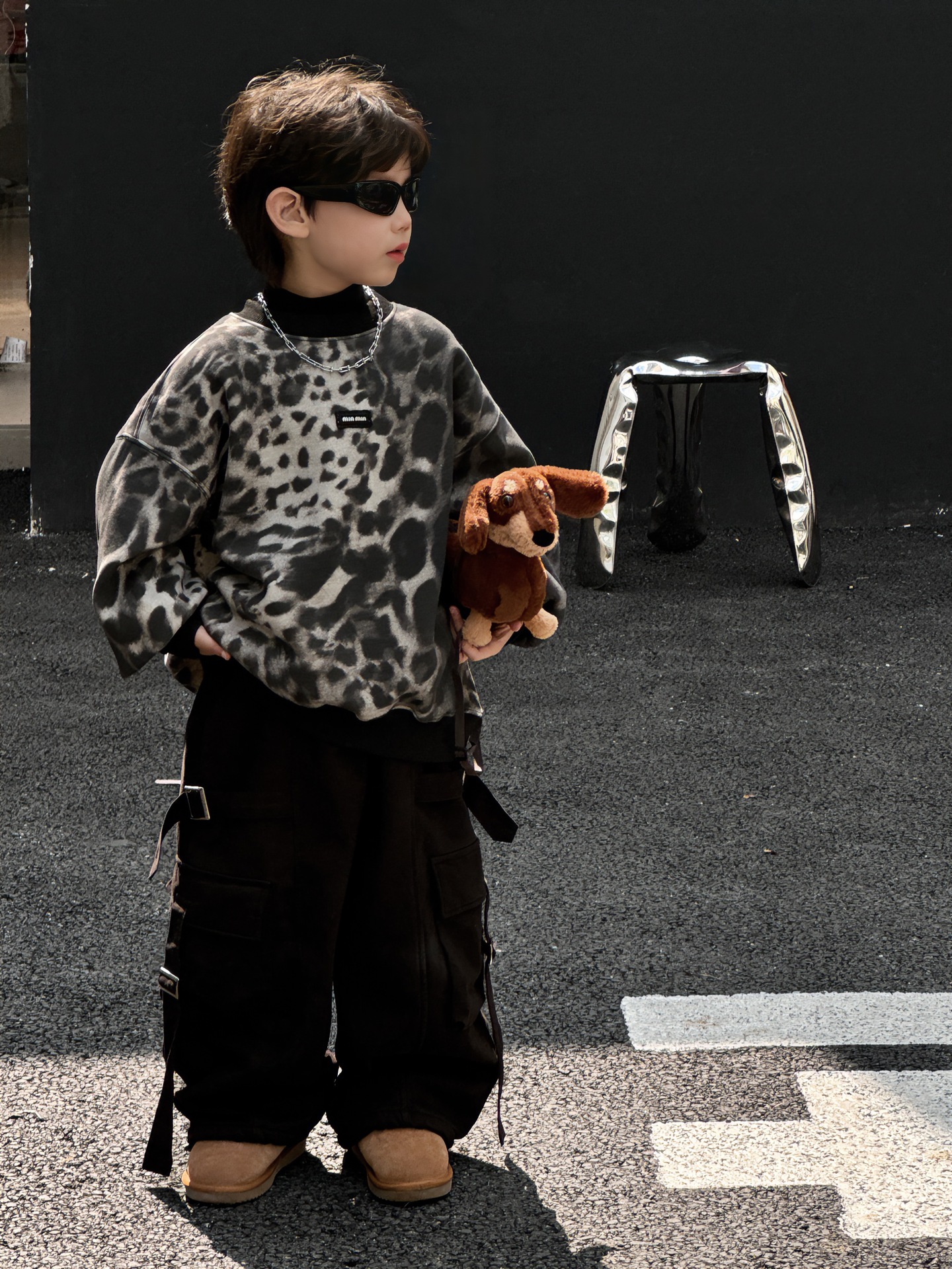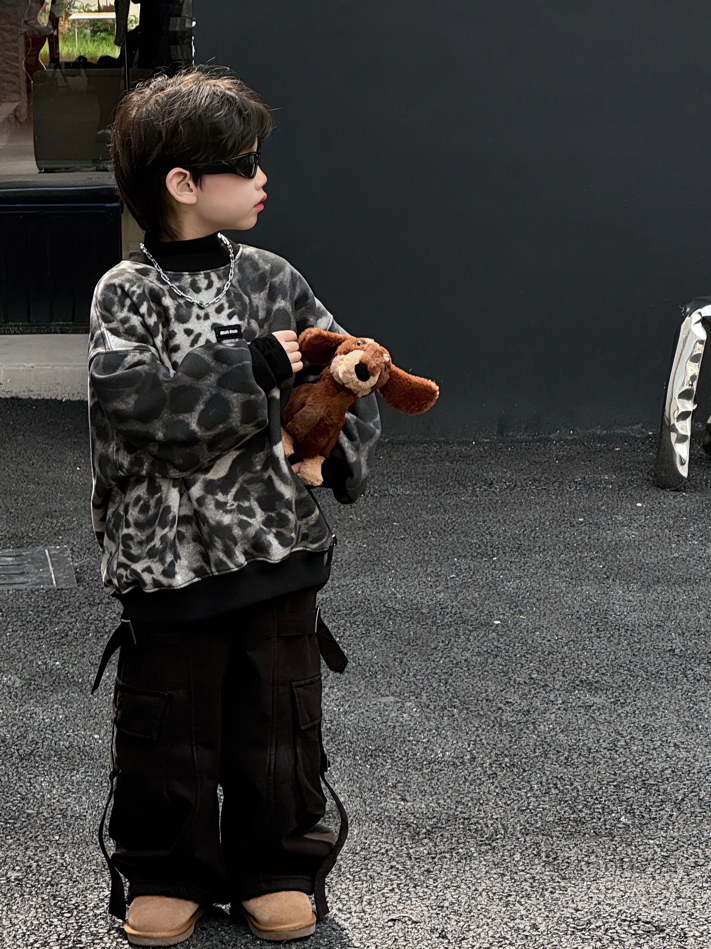 泰如2024冬季新款韩版男童时尚百搭加绒加厚套头美式豹纹卫衣儿童