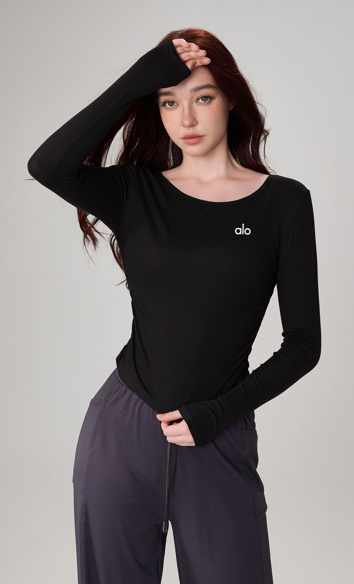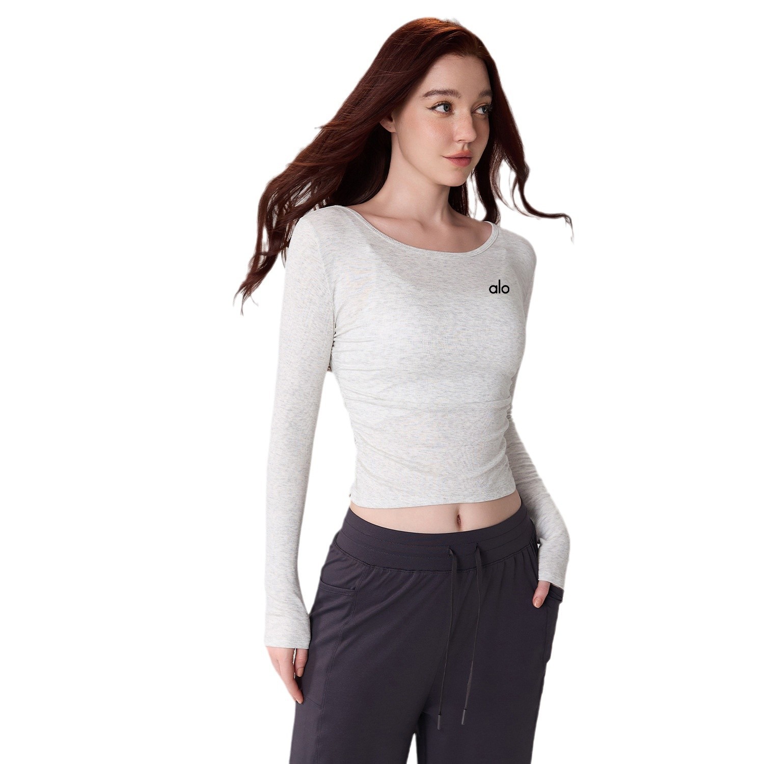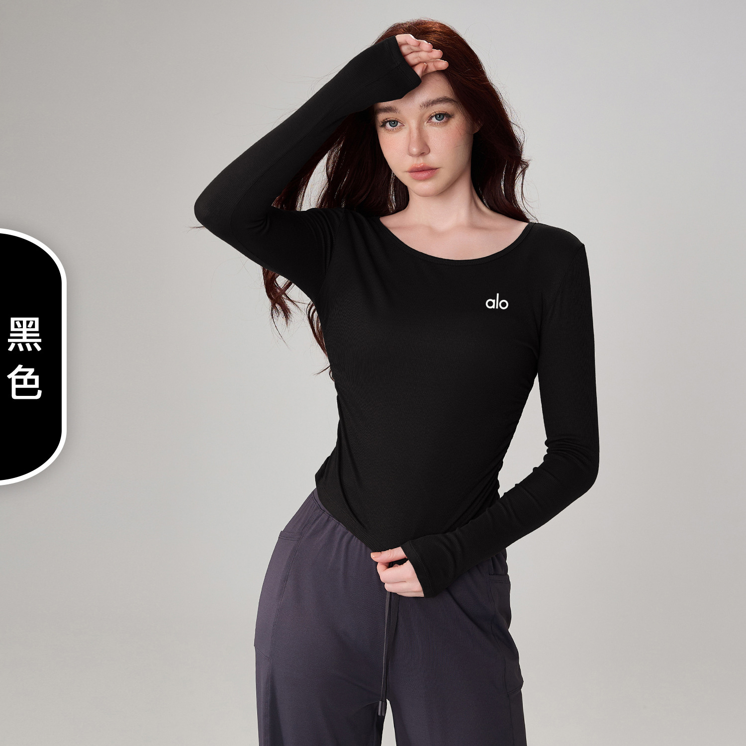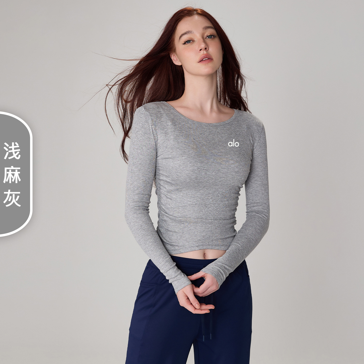 alo瑜伽服yoga秋冬裸感罗纹褶皱修身圆领运动女健身运动长袖上衣