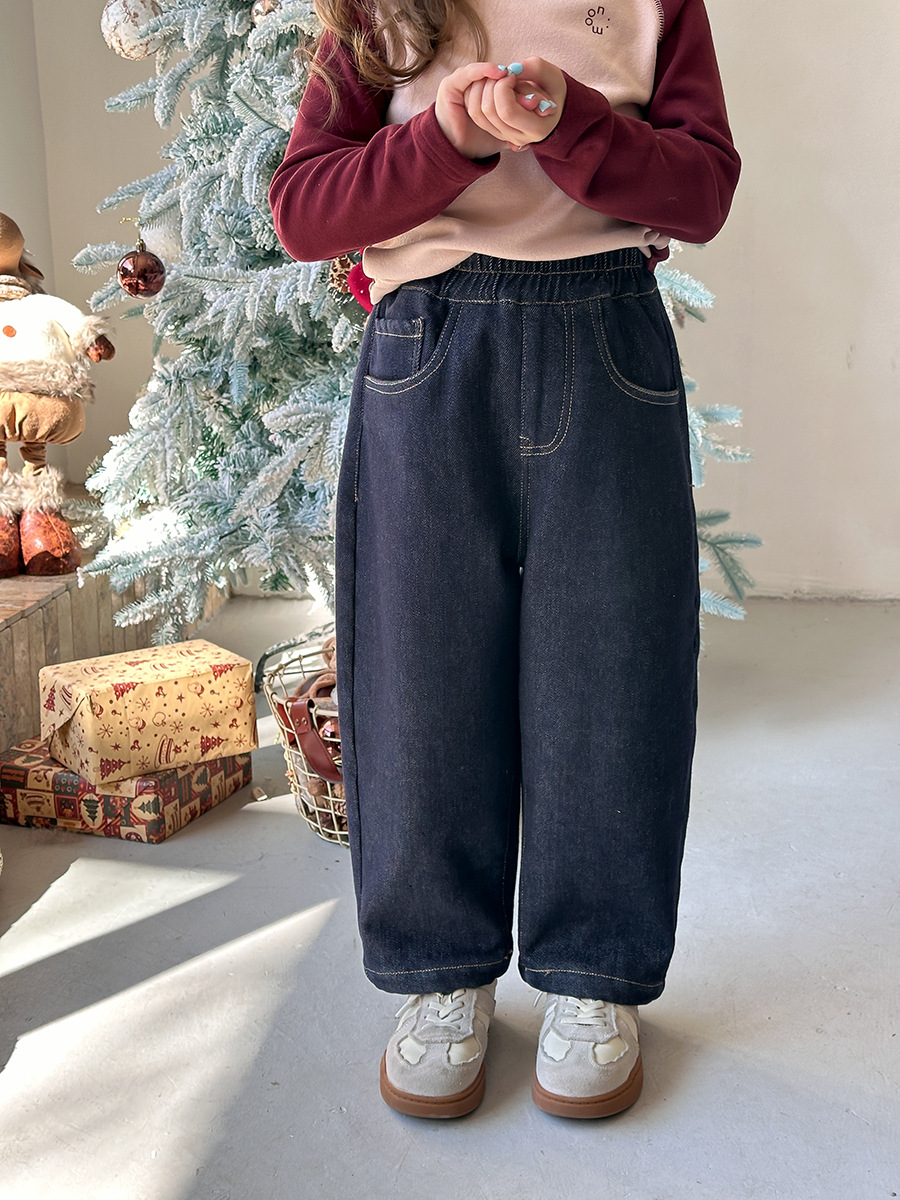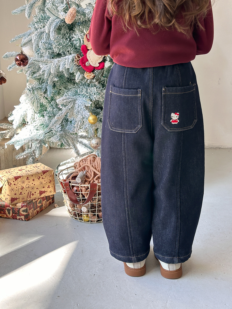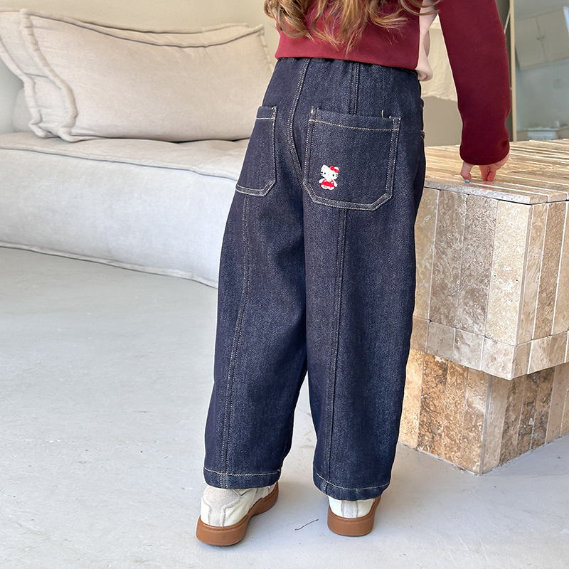 【加绒】艾摩贝贝女童时髦款环保防褪色后背拼接设计感猫咪牛仔裤