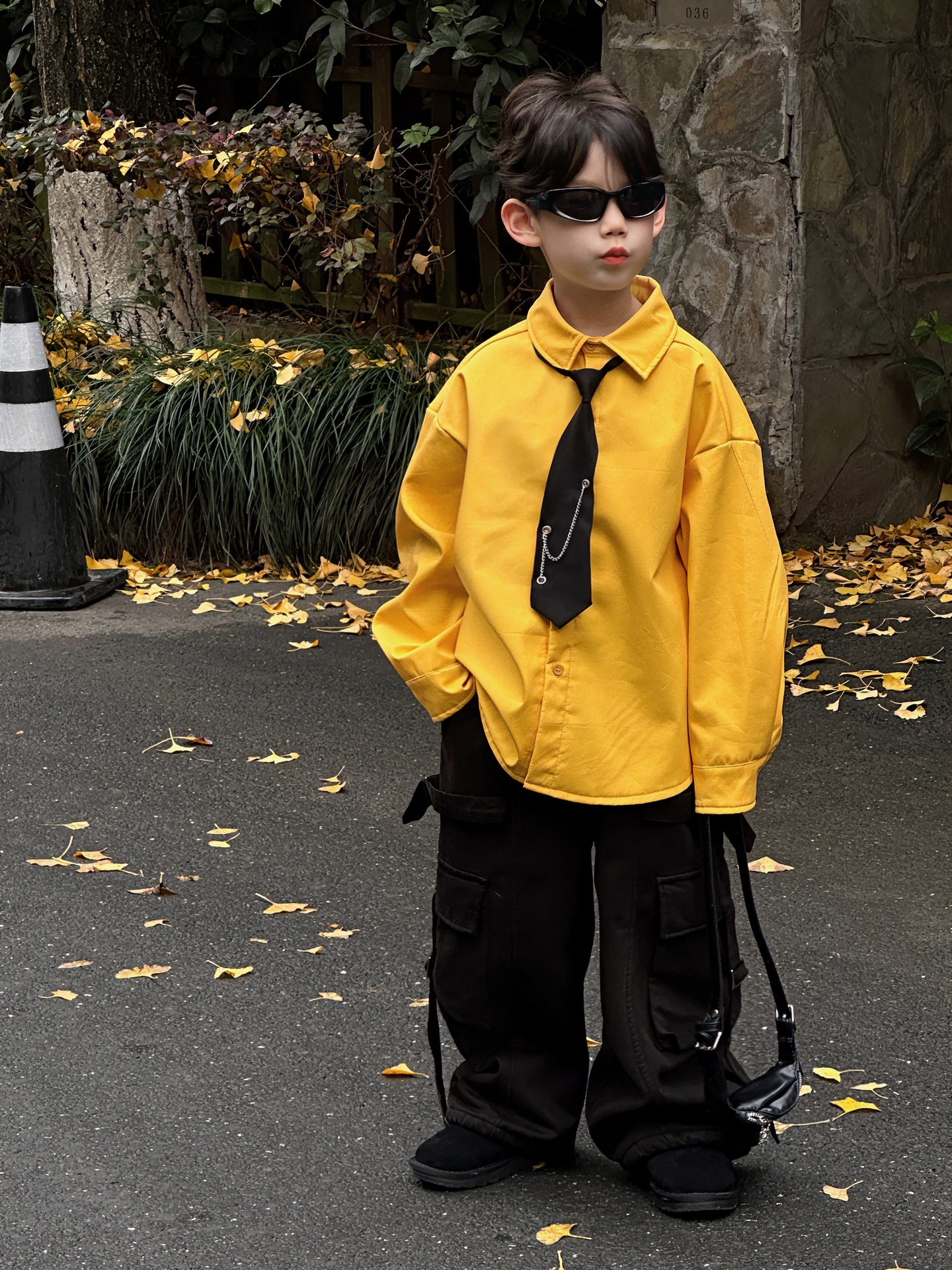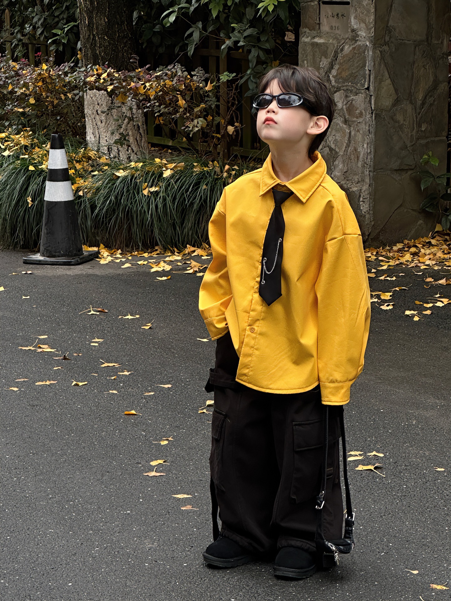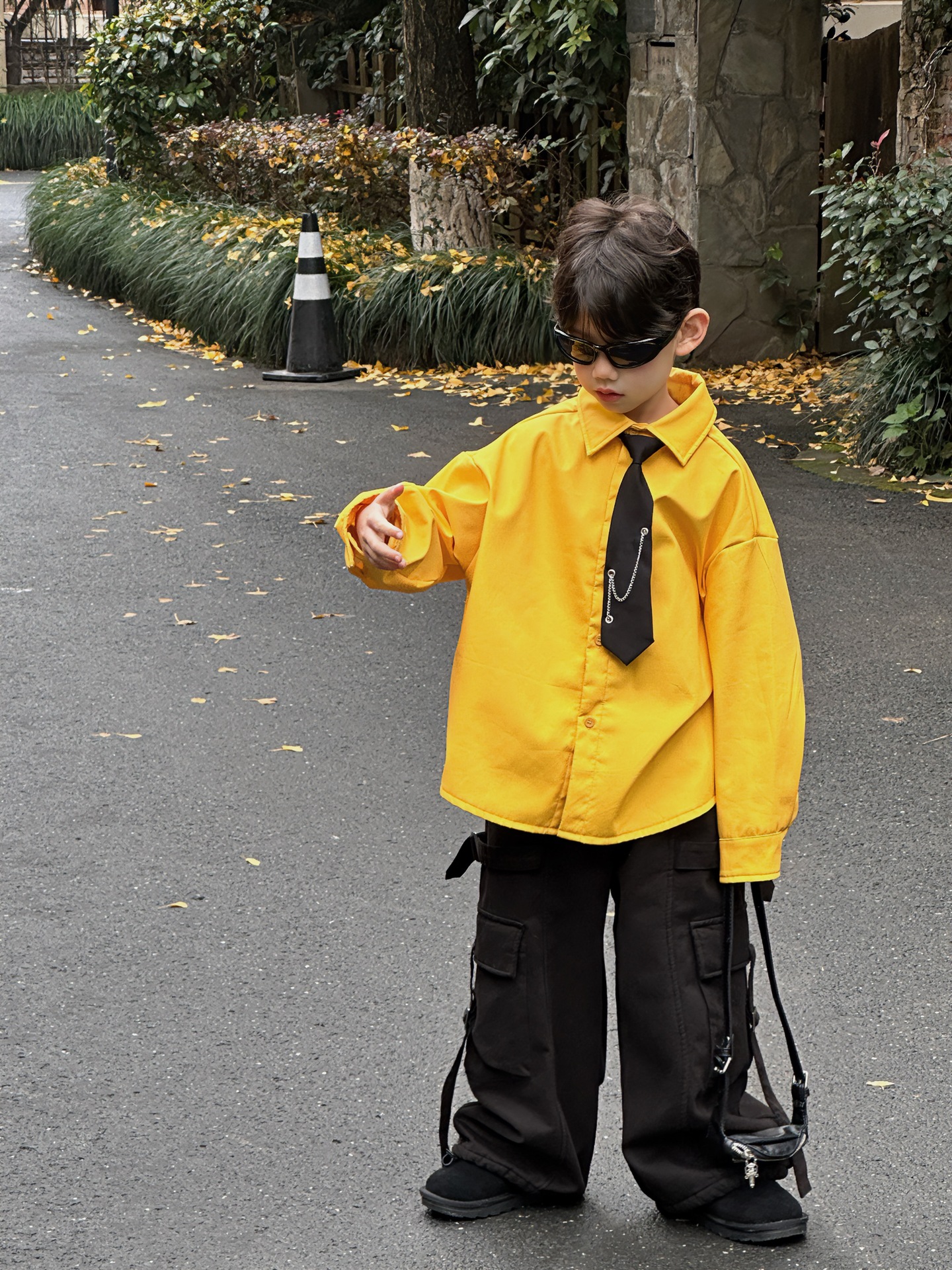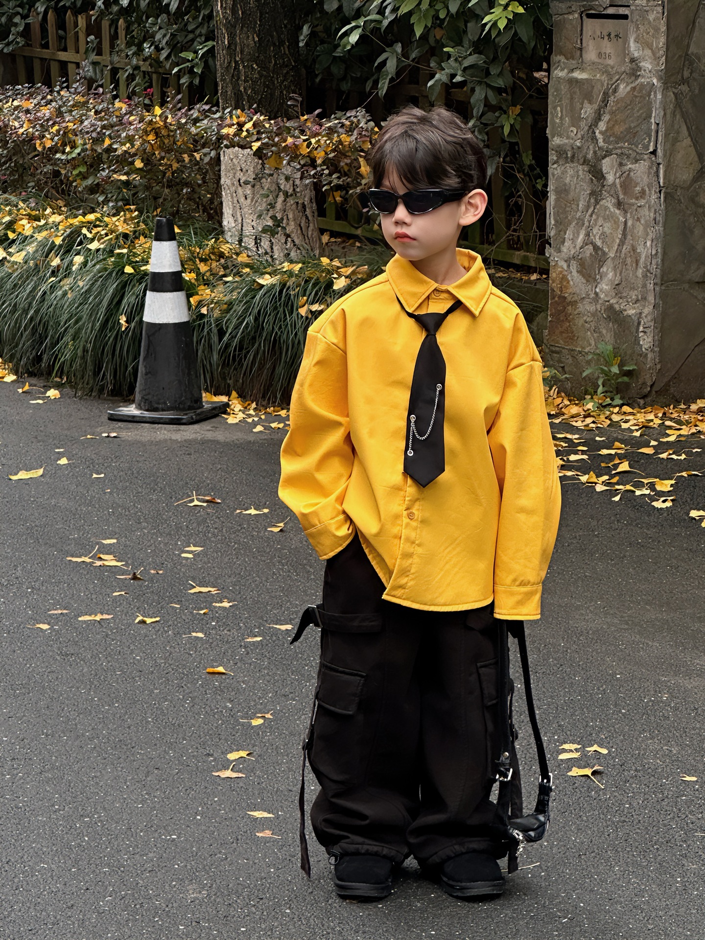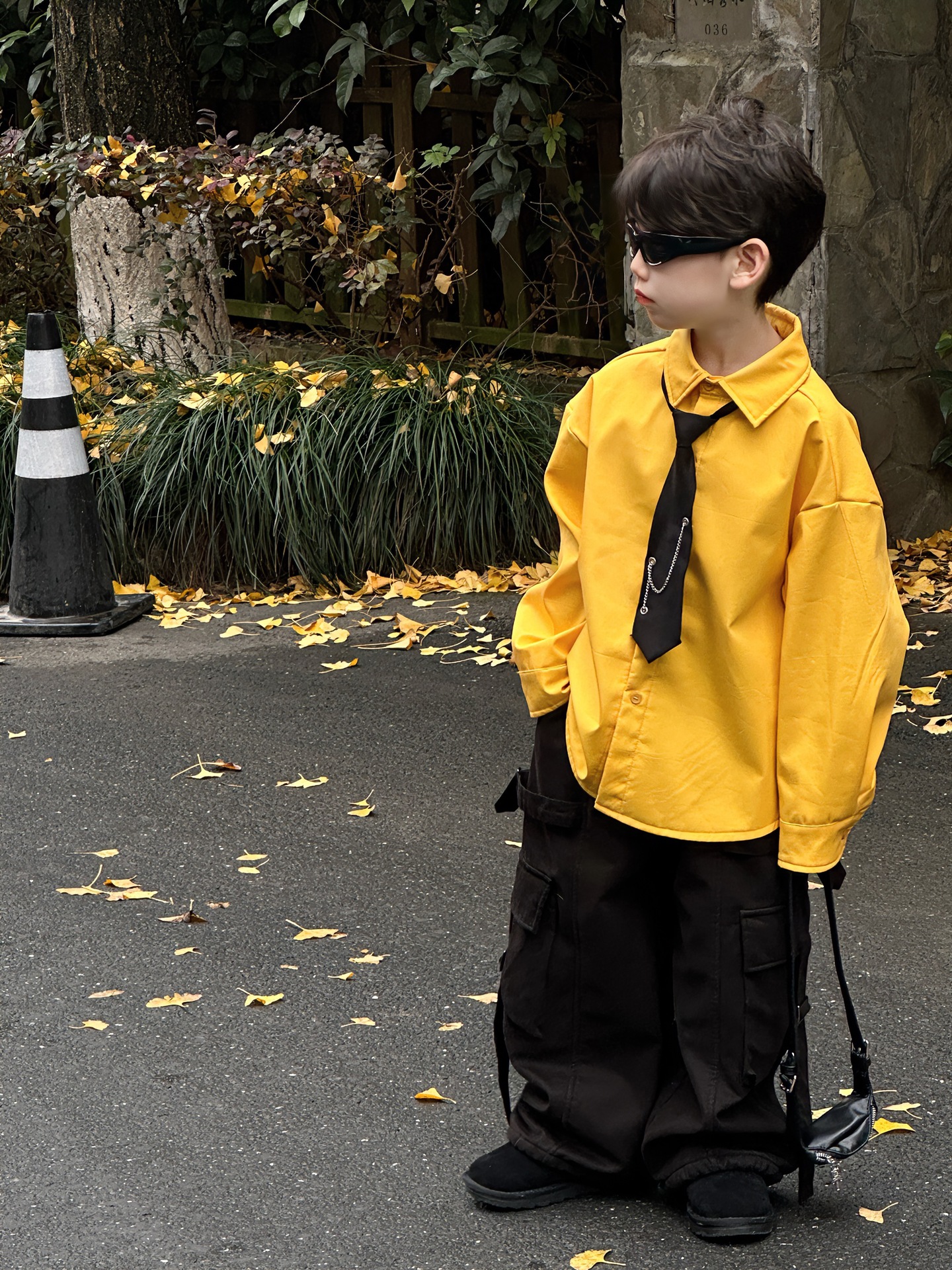 泰如2024冬季新款韩版男童纯色加绒衬衫儿童学院风开衫带领带潮