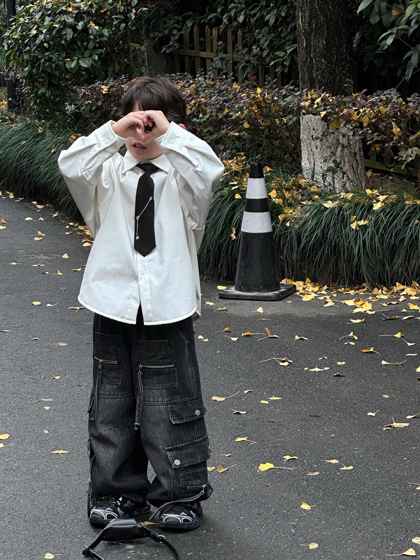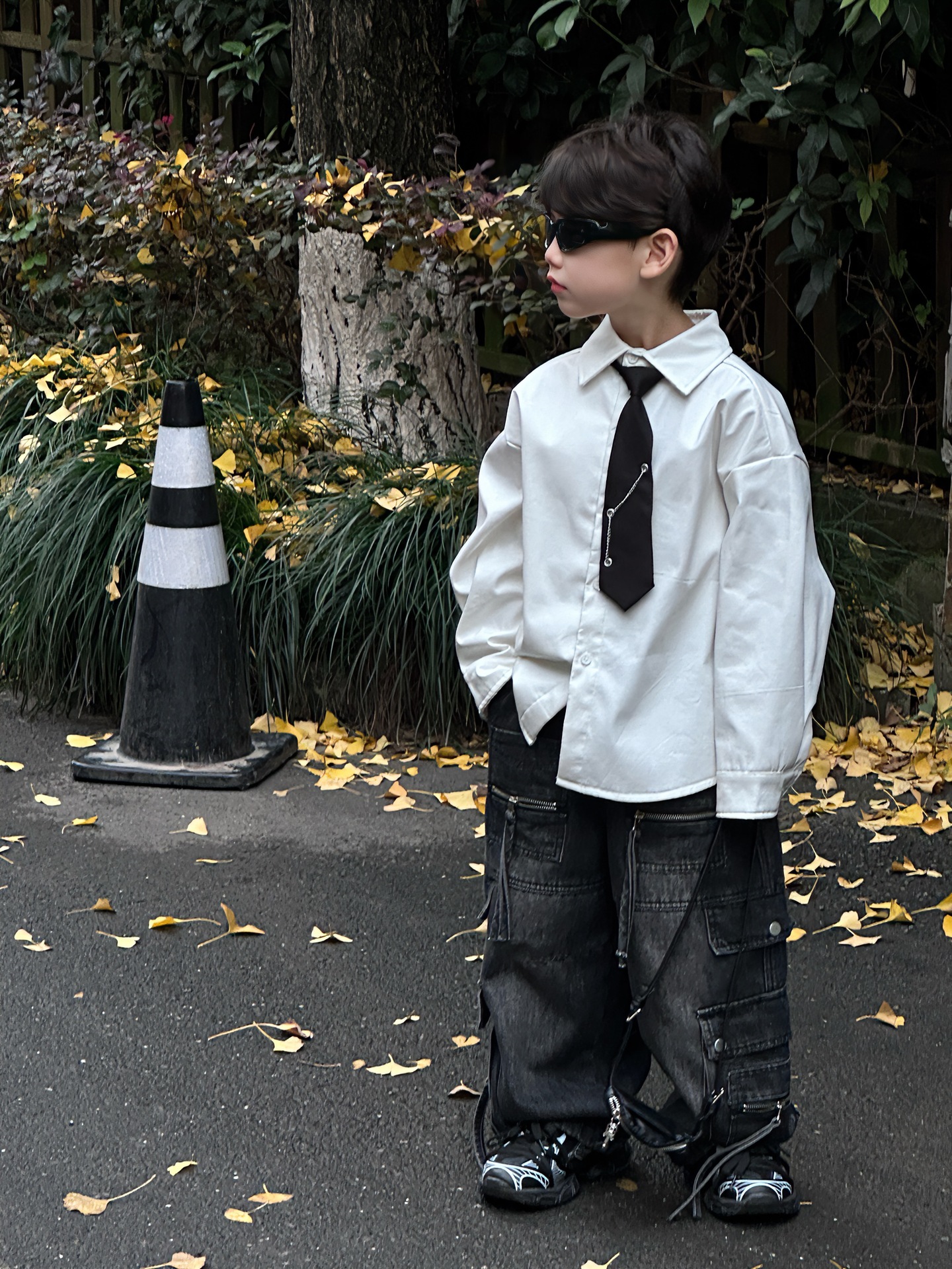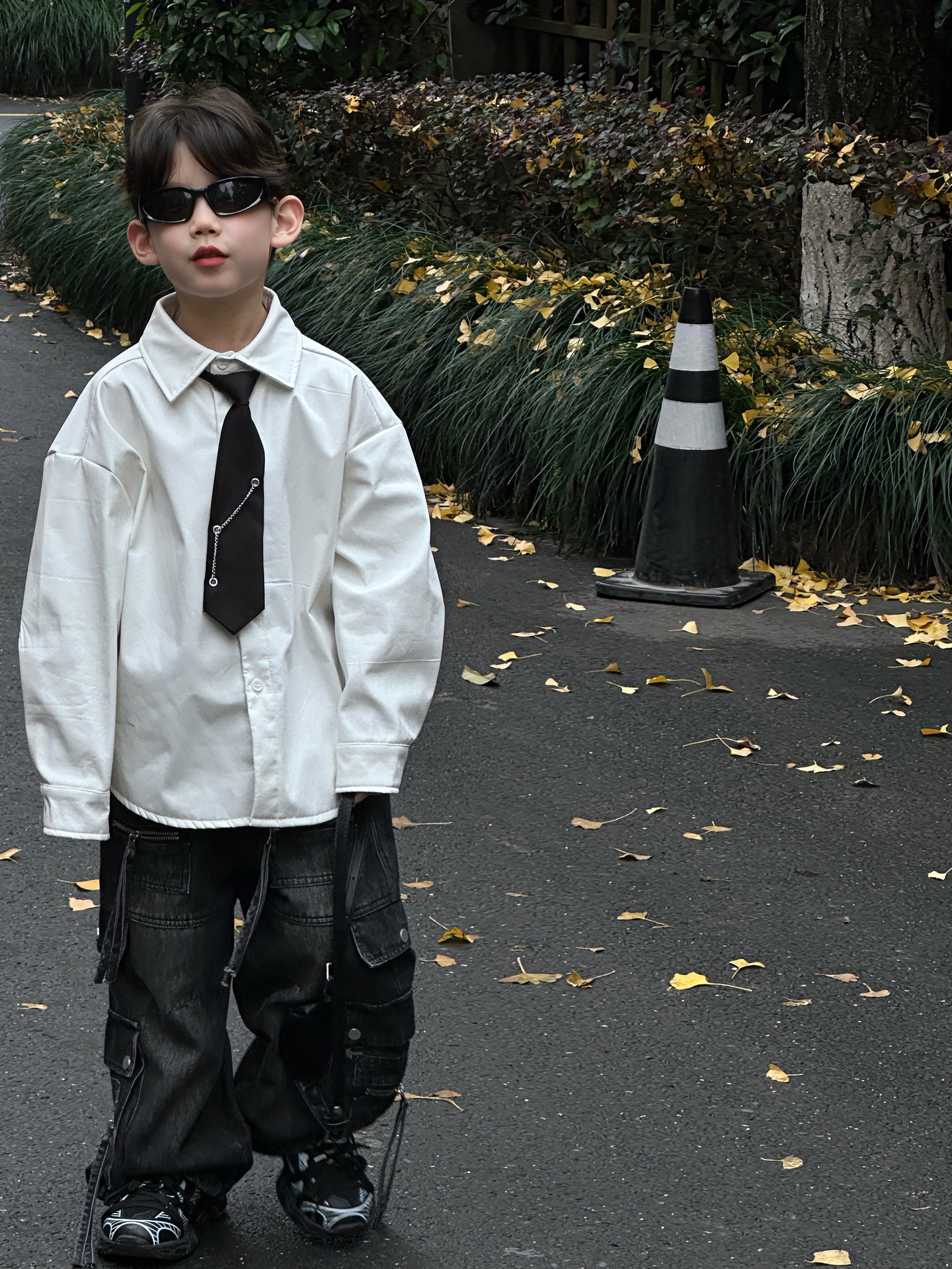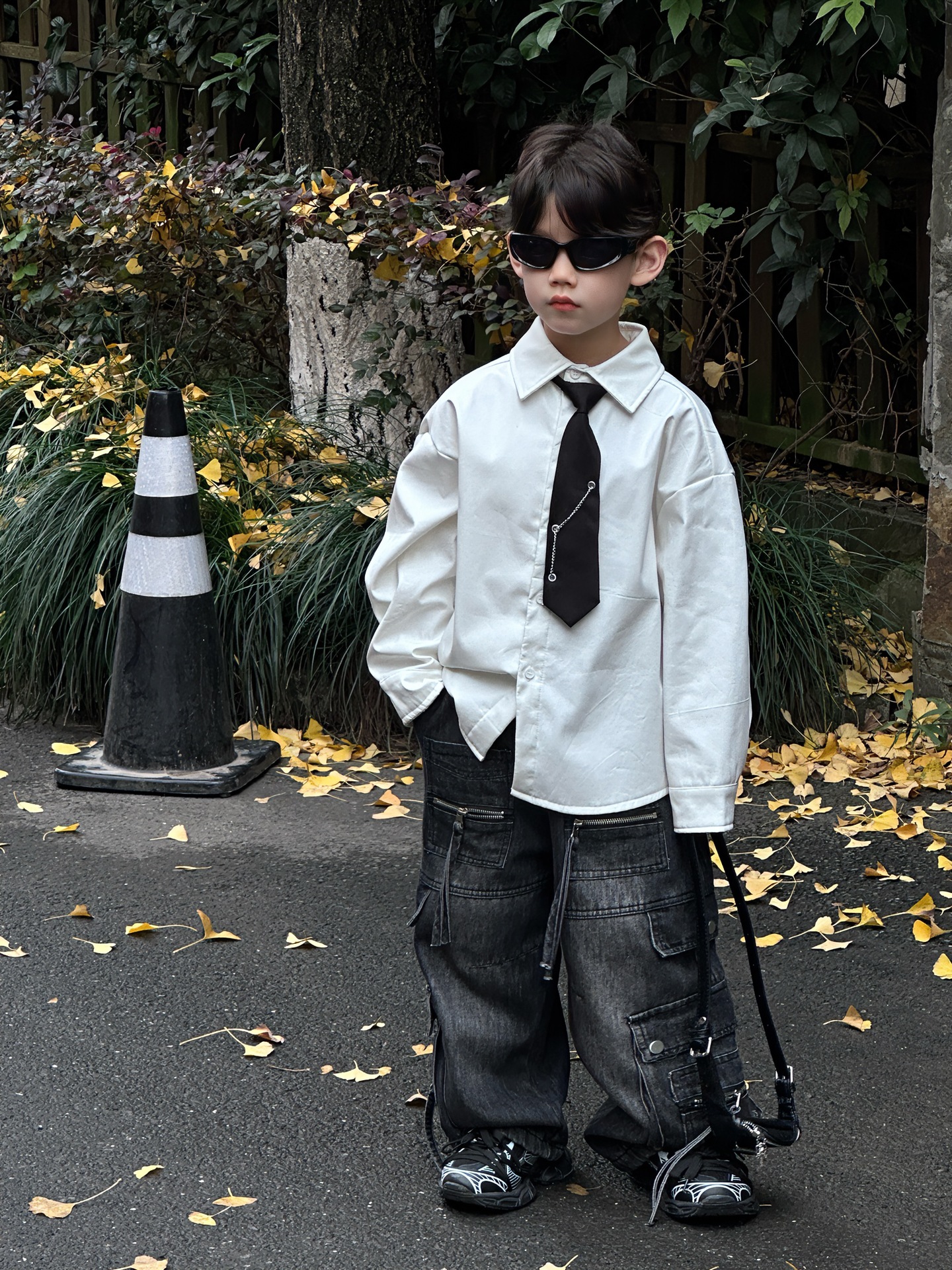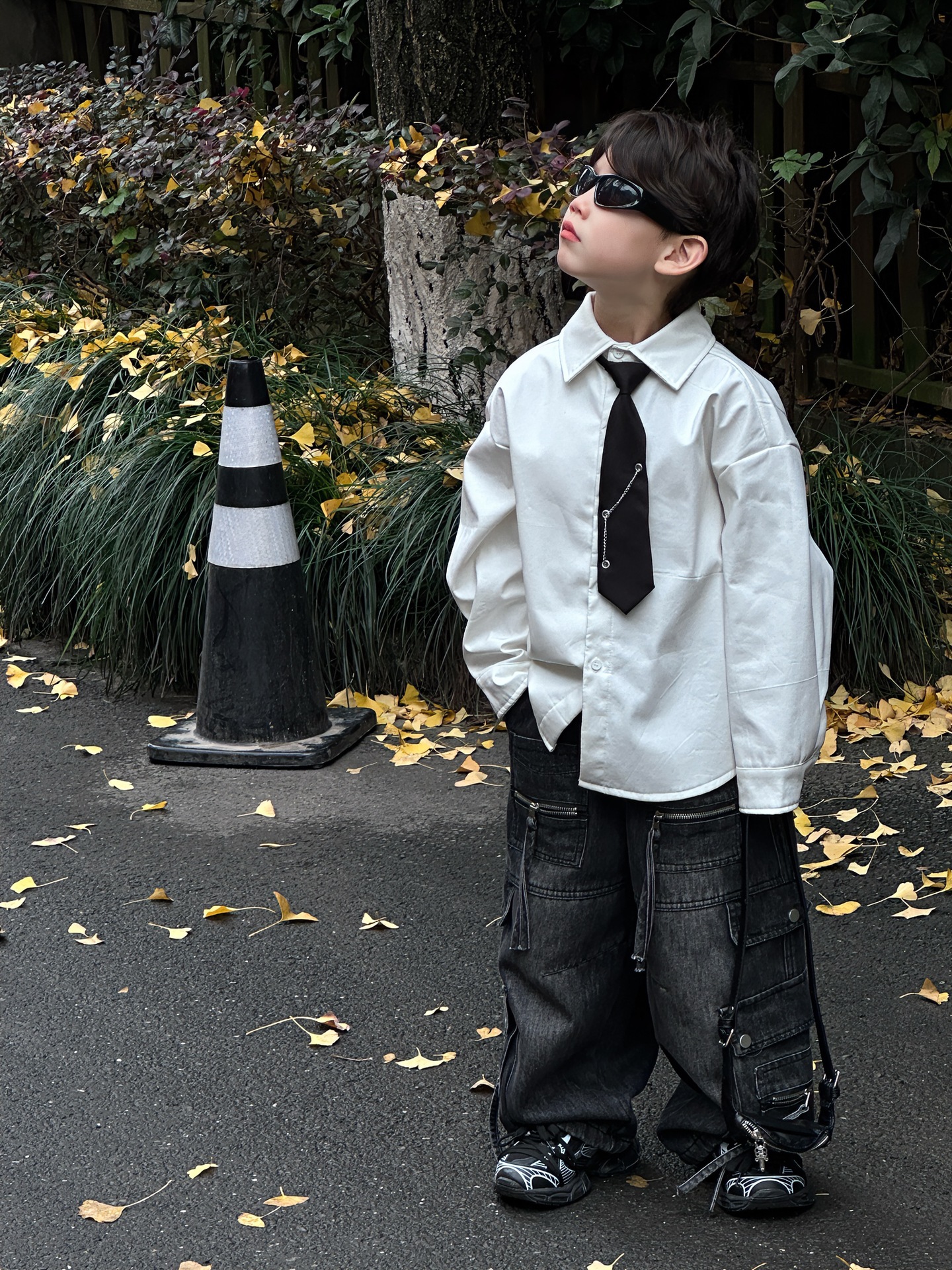 泰如2024冬季新款韩版男童纯色加绒衬衫儿童学院风开衫带领带潮