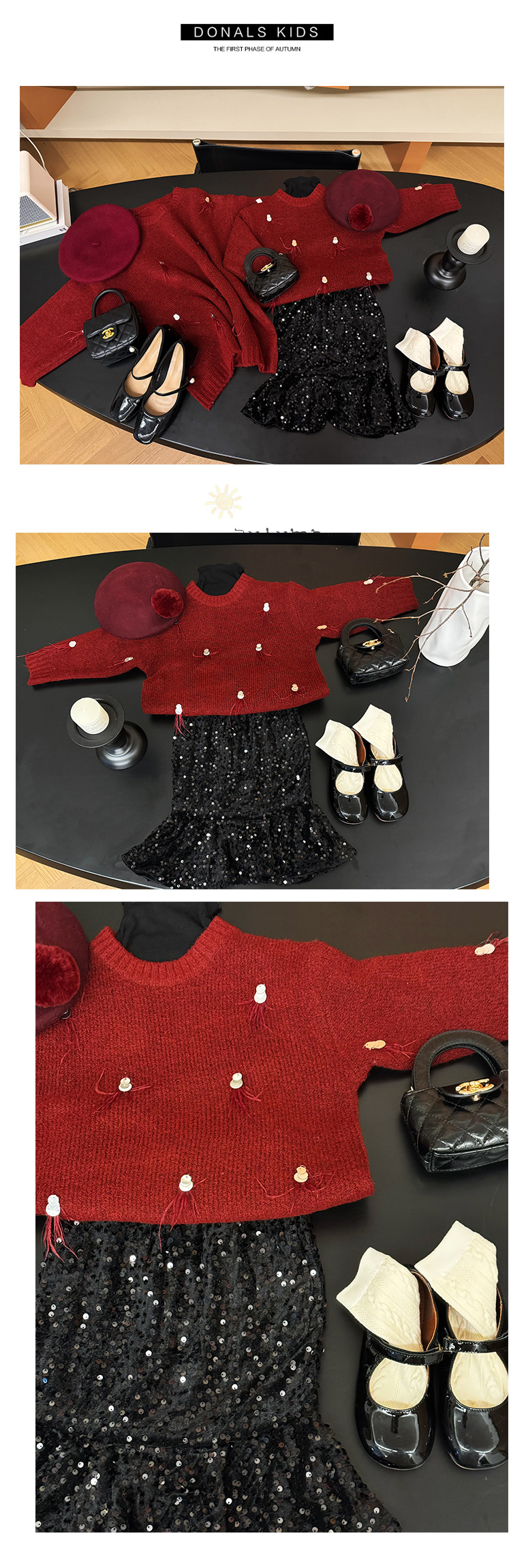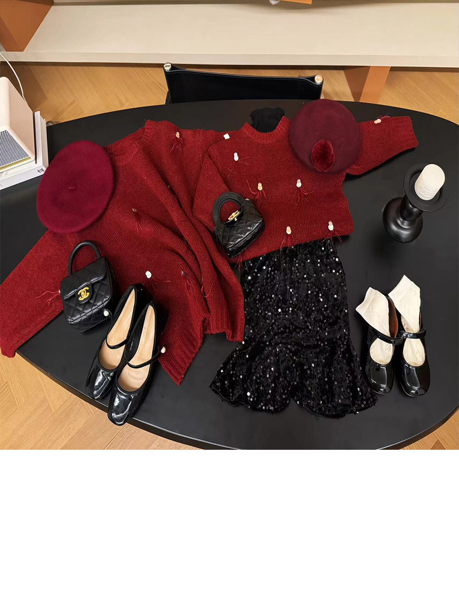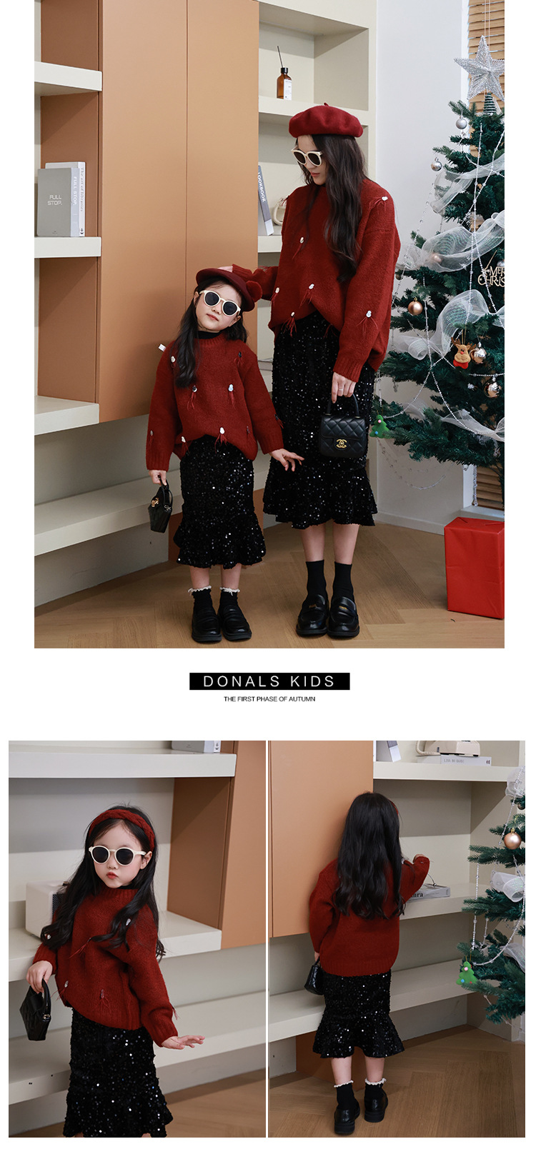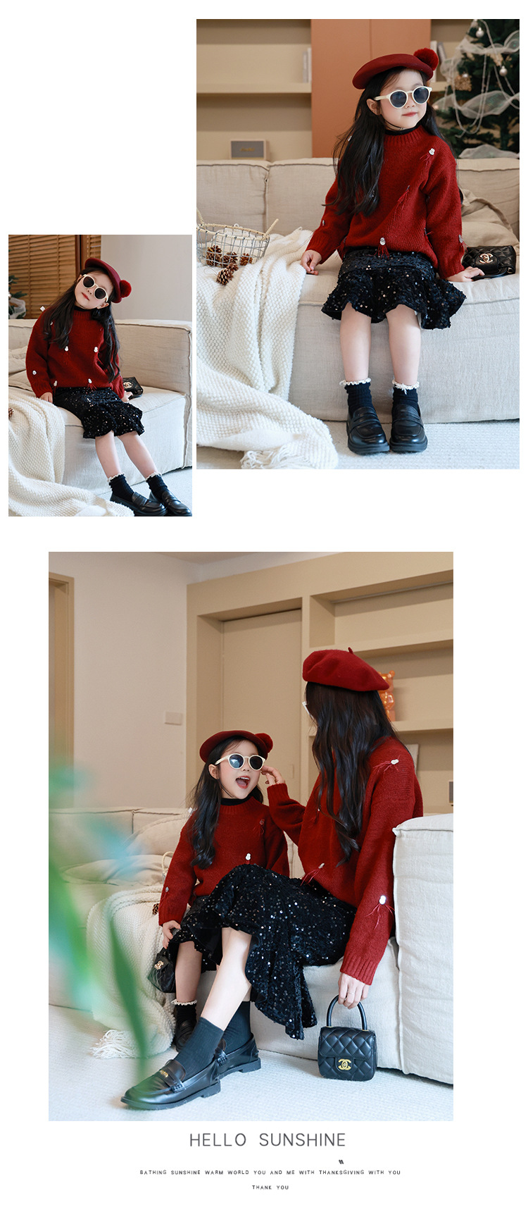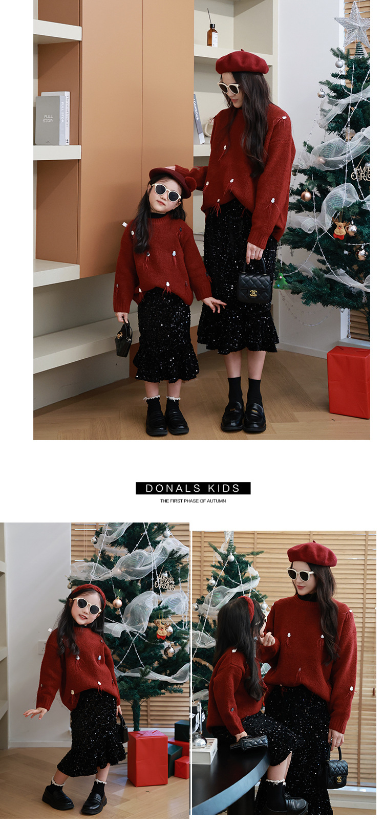 现货一起玩亲子装母女套头毛衣女童韩系圣诞新年装安哥拉红毛衣套