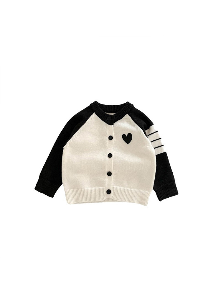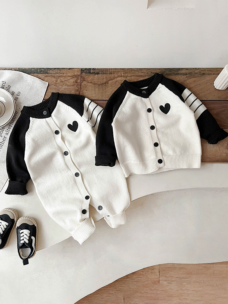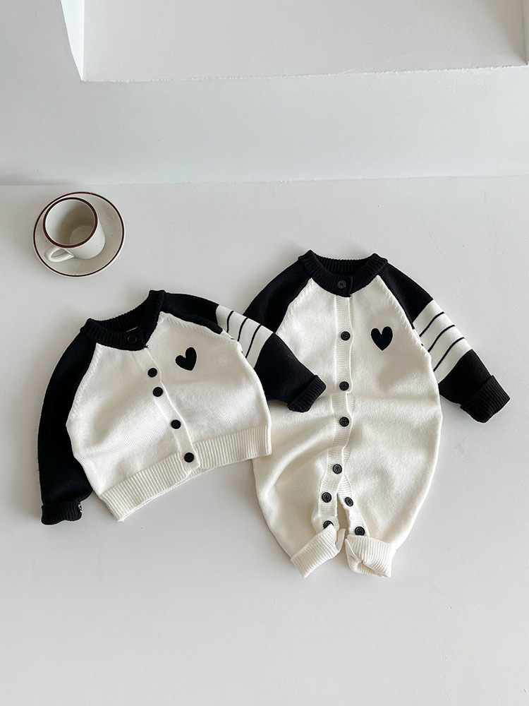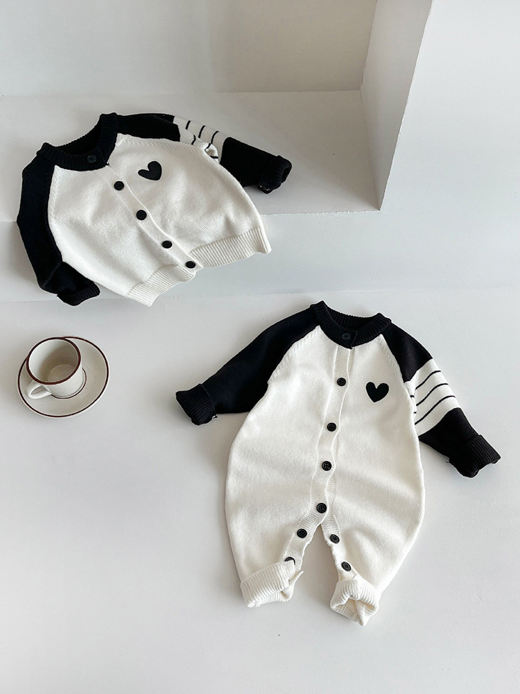 婴儿毛衣爬服春秋新款新生儿宝宝韩系撞色杠条爱心针织长裤连体衣