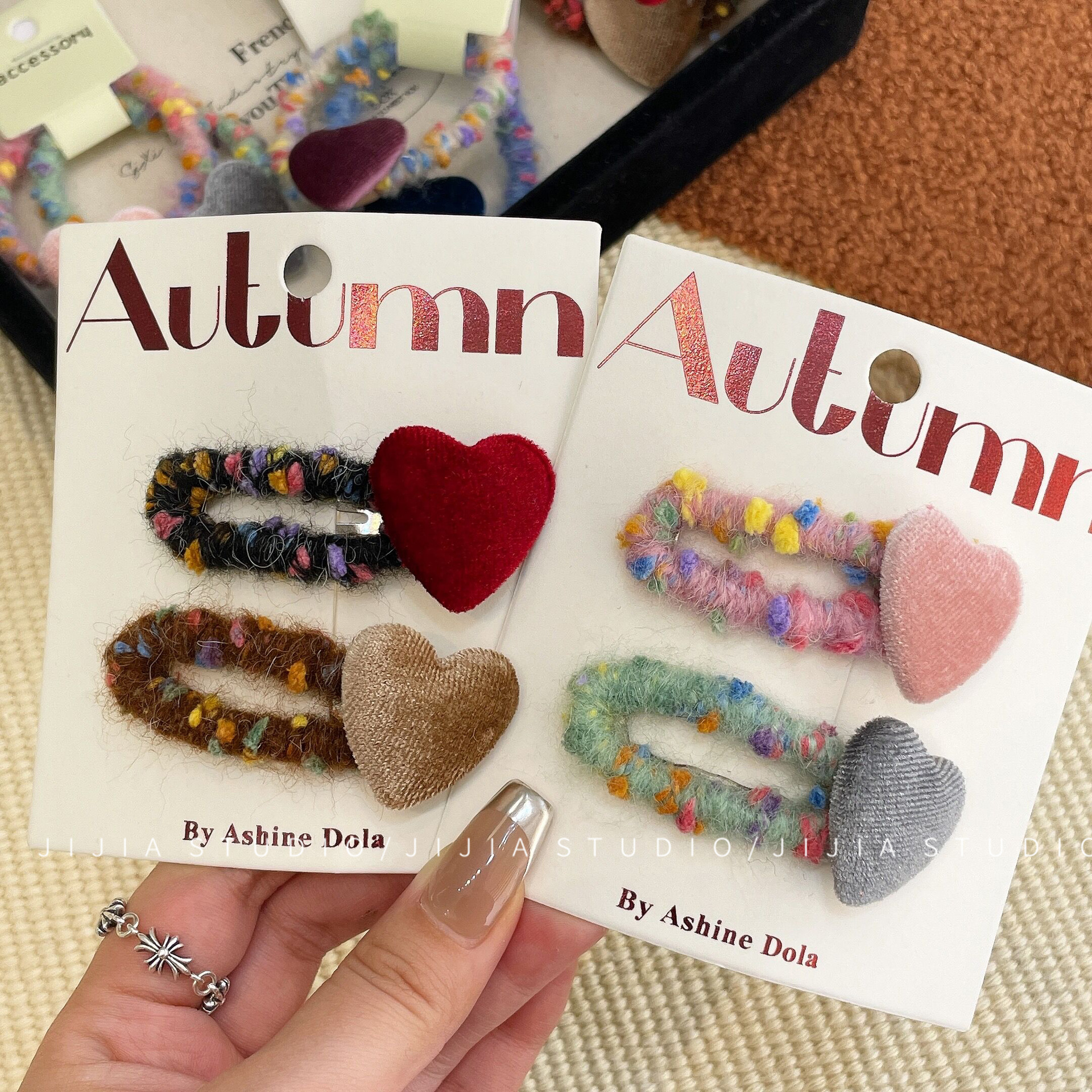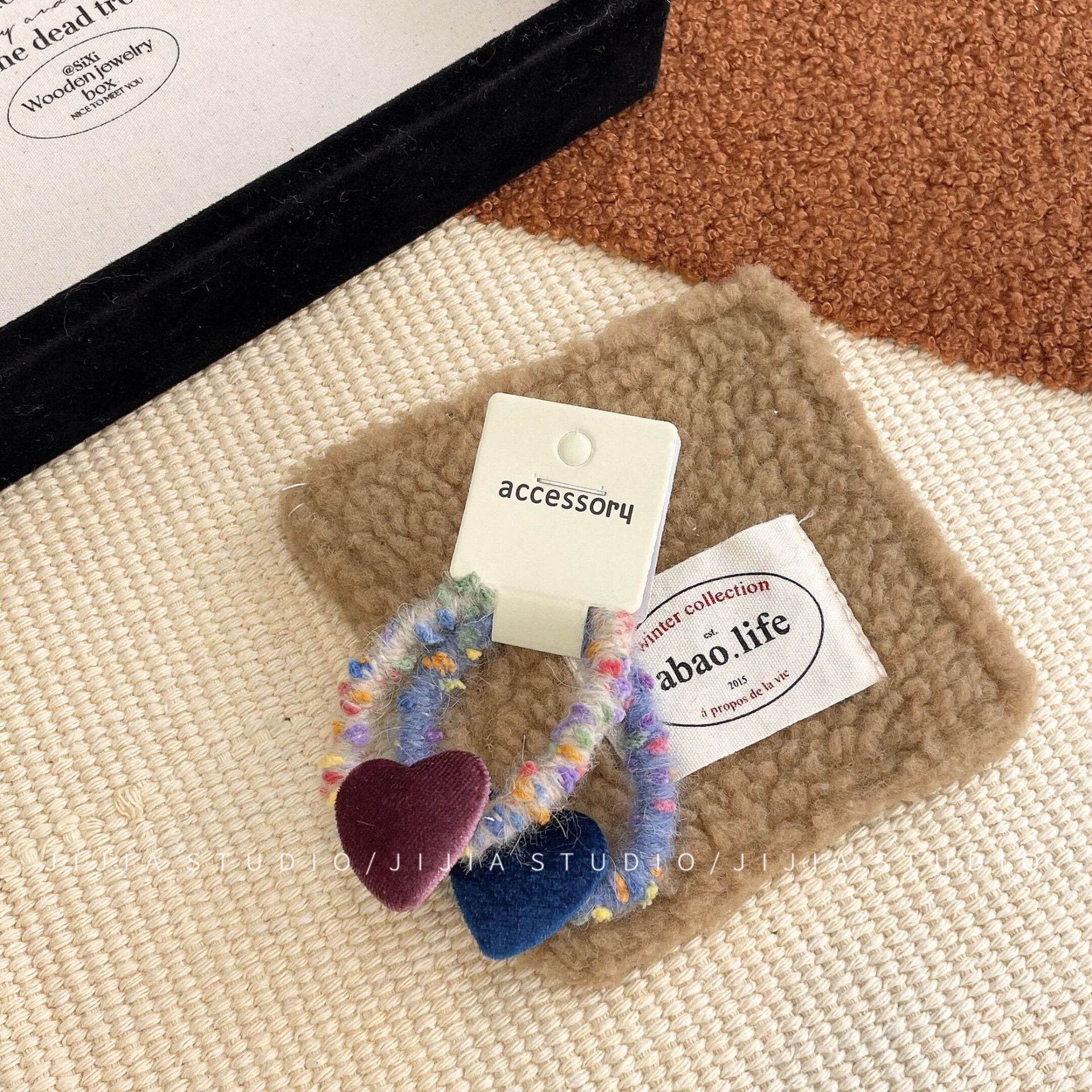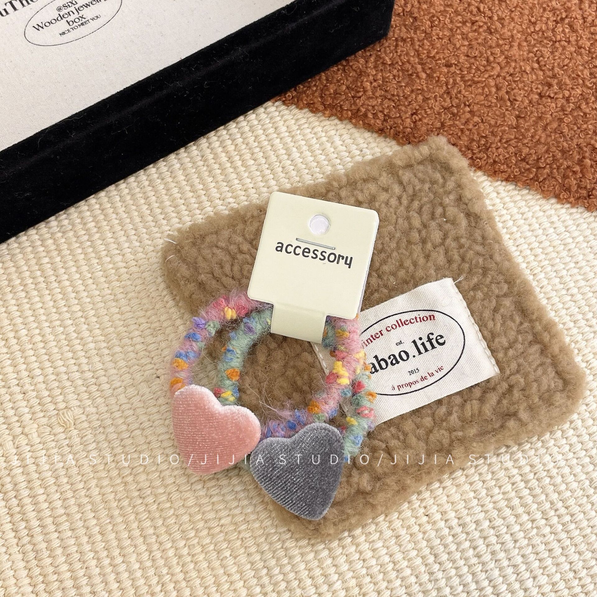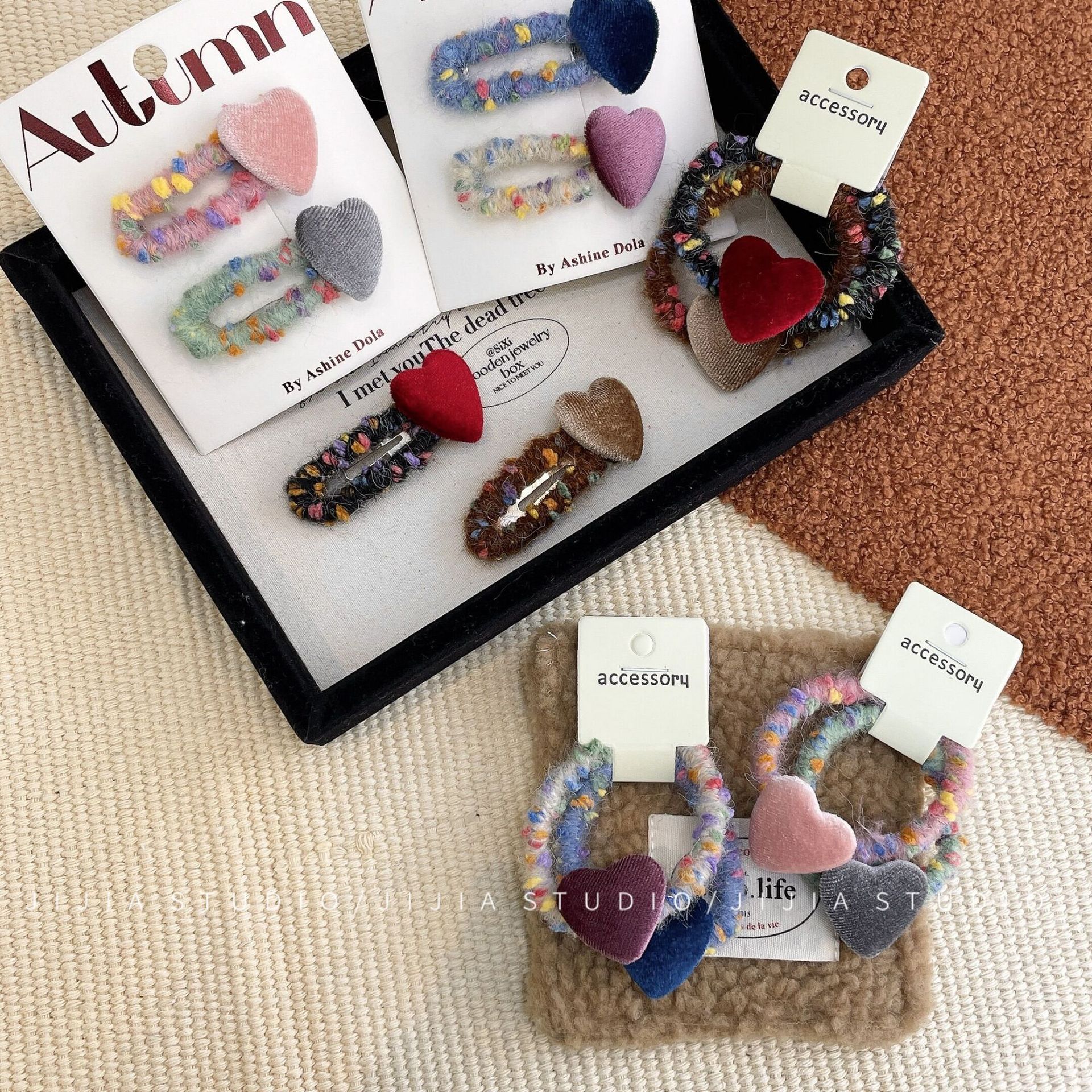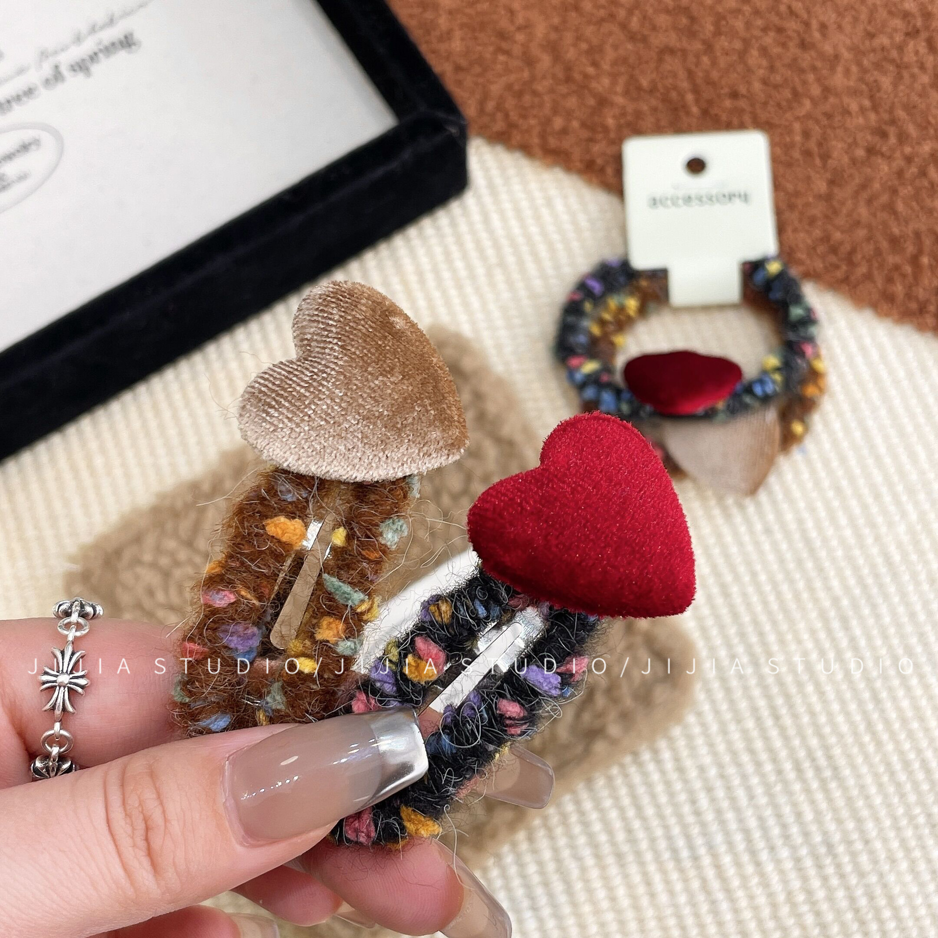 秋冬撞色丝绒爱心发夹复古毛线不伤发发绳甜美侧边发夹碎发头饰