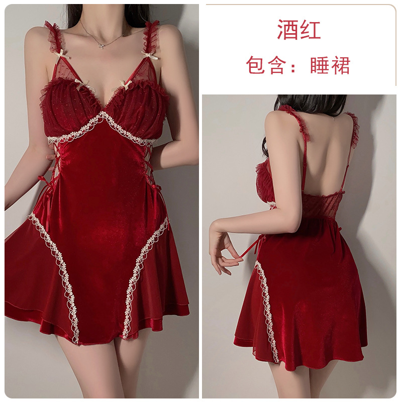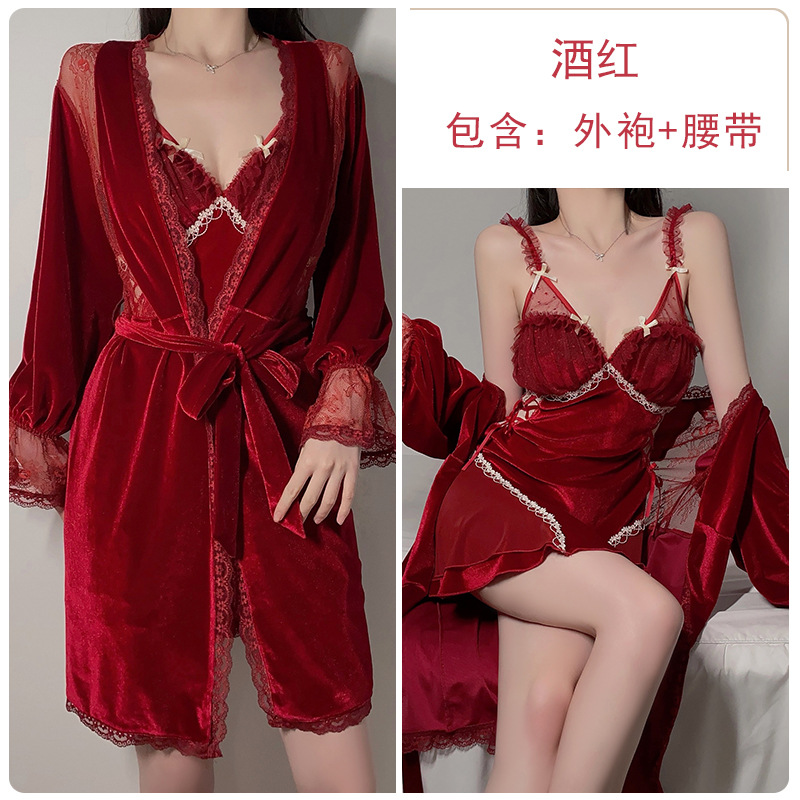 DZ瑰若丝绒拼接网纱睡衣深V加胸垫吊带睡裙舒适外袍家居套装4218