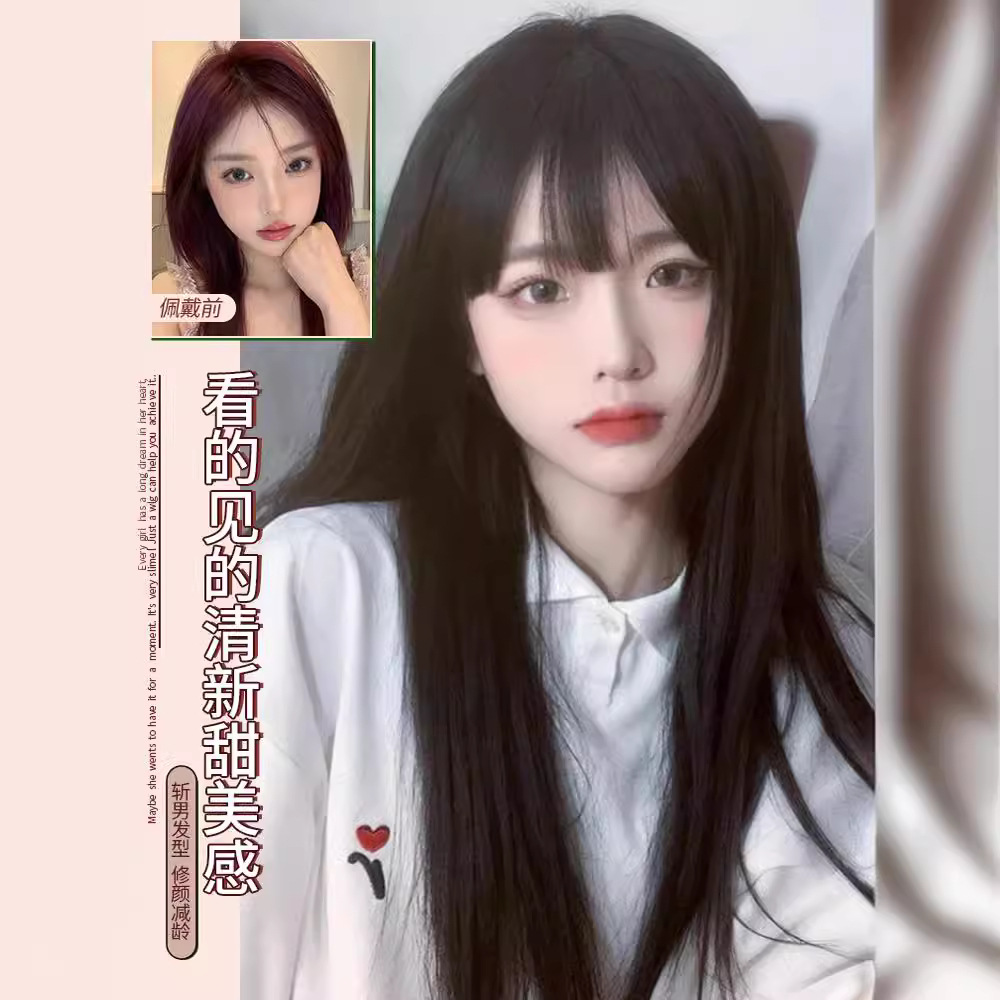 星程假发女长发黑棕色圆脸空气刘海自然秋冬仿真发长直发全头套式