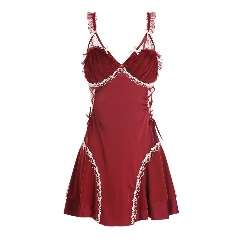 瑰若缎面拼纱透视深V加胸垫纯欲绑带睡裙舒适外袍家居服套装3248