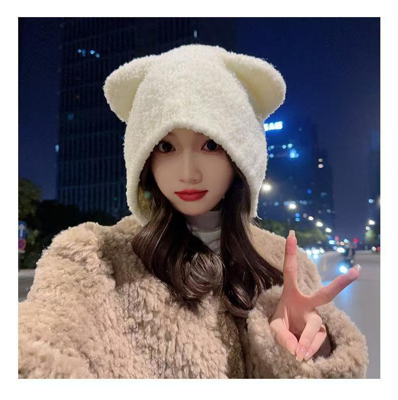 可爱小熊耳朵毛绒帽女冬季百搭显脸小保暖护耳帽大头围针织