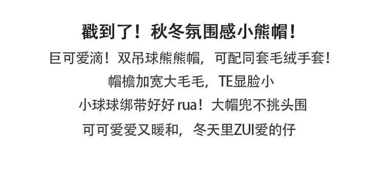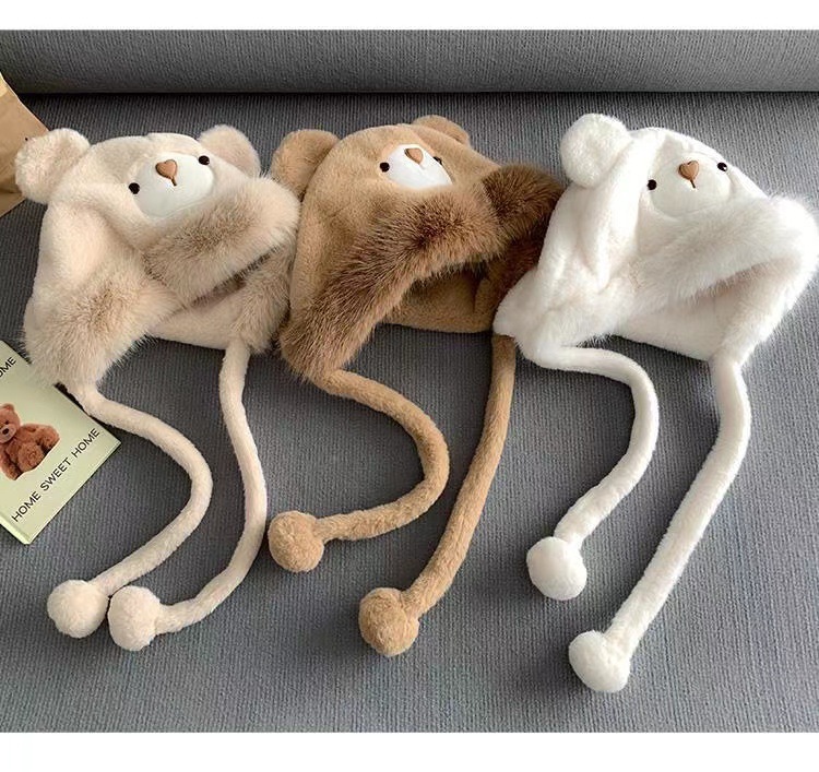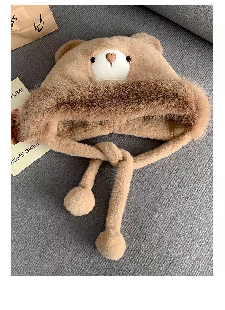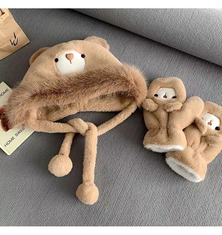 毛绒小熊帽子手套女秋冬季加绒加厚保暖护耳套头帽可爱雷锋帽骑车