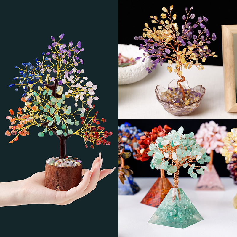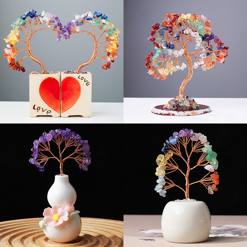 跨境热销天然水晶碎石发财树手工编织家居车载迷你水晶树小摆件