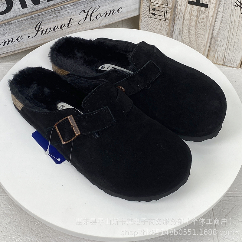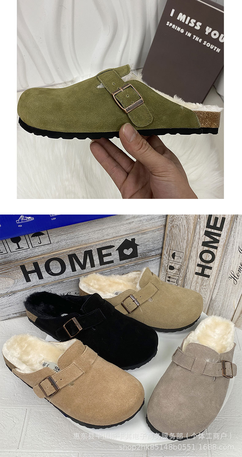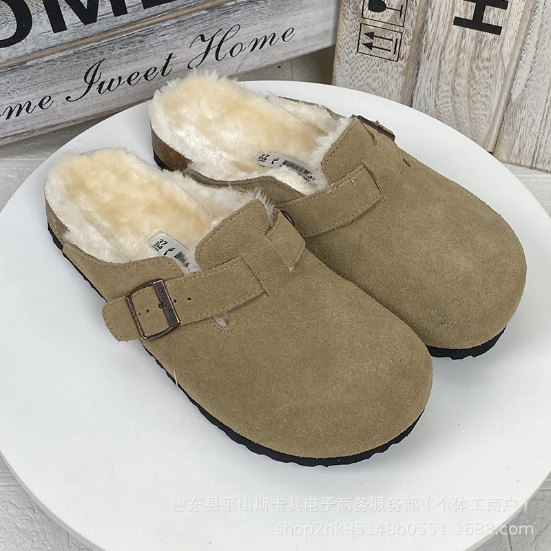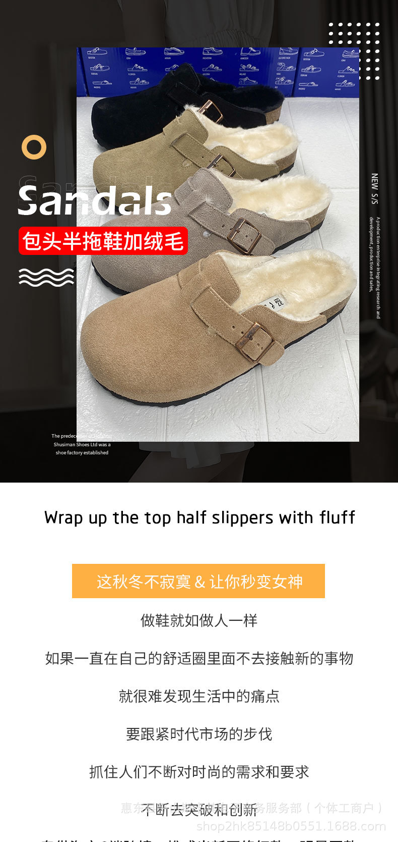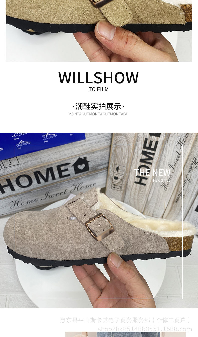 勃肯鞋纯原桑坡半拖真皮男女2024冬厚底加绒包头半拖雪地鞋棉拖鞋