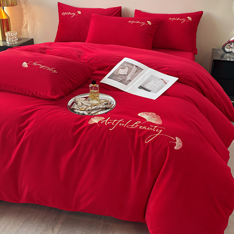 结婚牛奶珊瑚绒冬季床上用品四件套婚庆婚房喜被床单被套红色婚礼