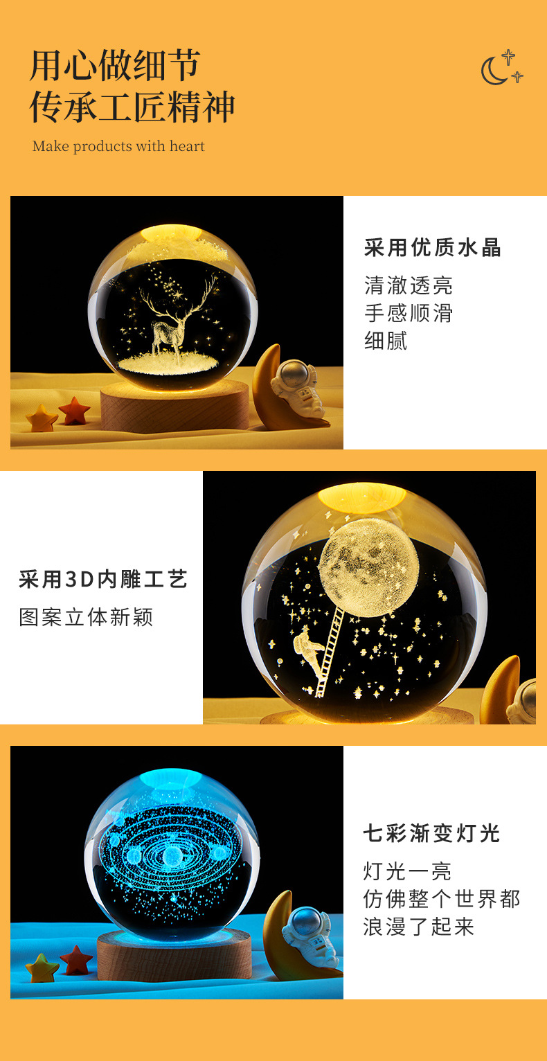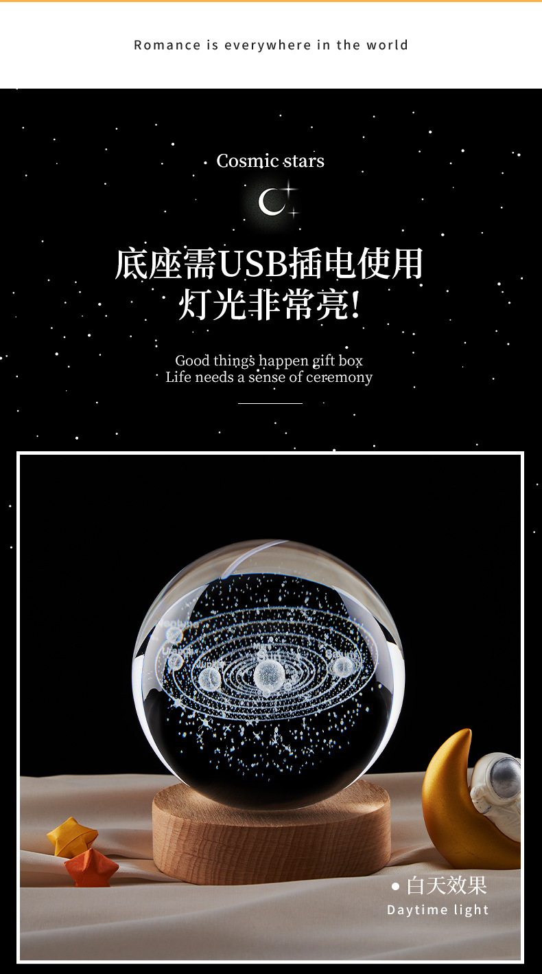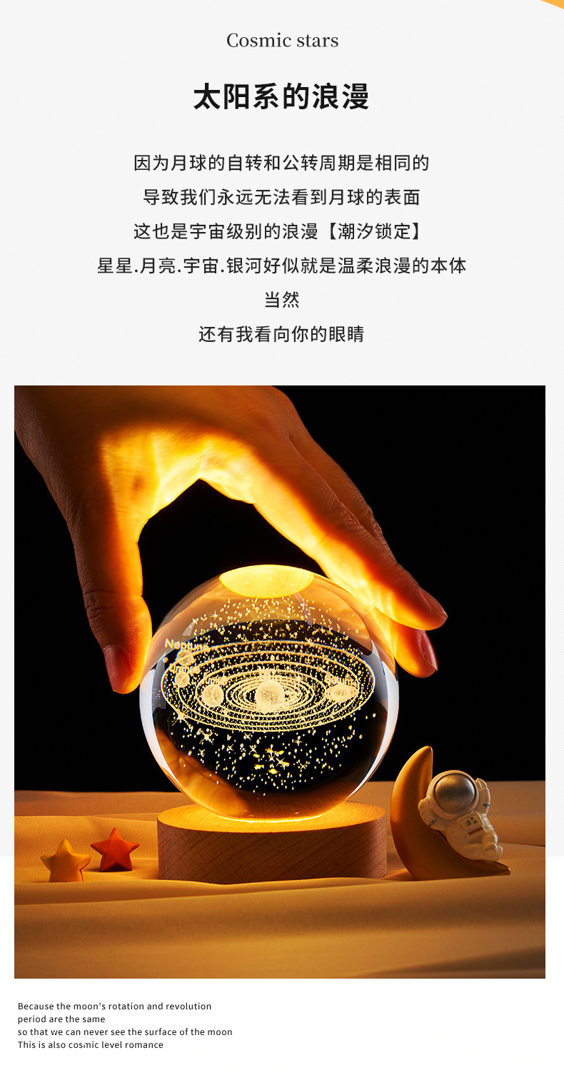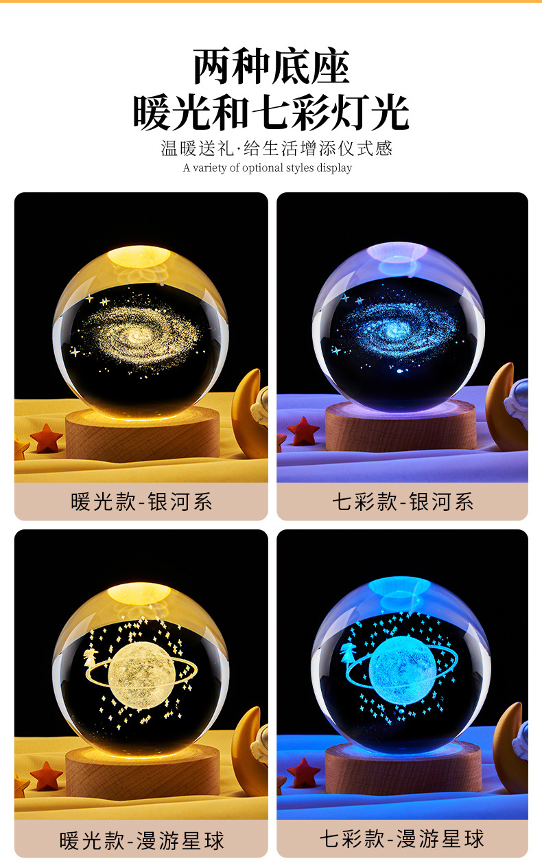 跨境批发水晶球内雕太阳系星空小夜灯彩光木质装饰玻璃球桌面摆件