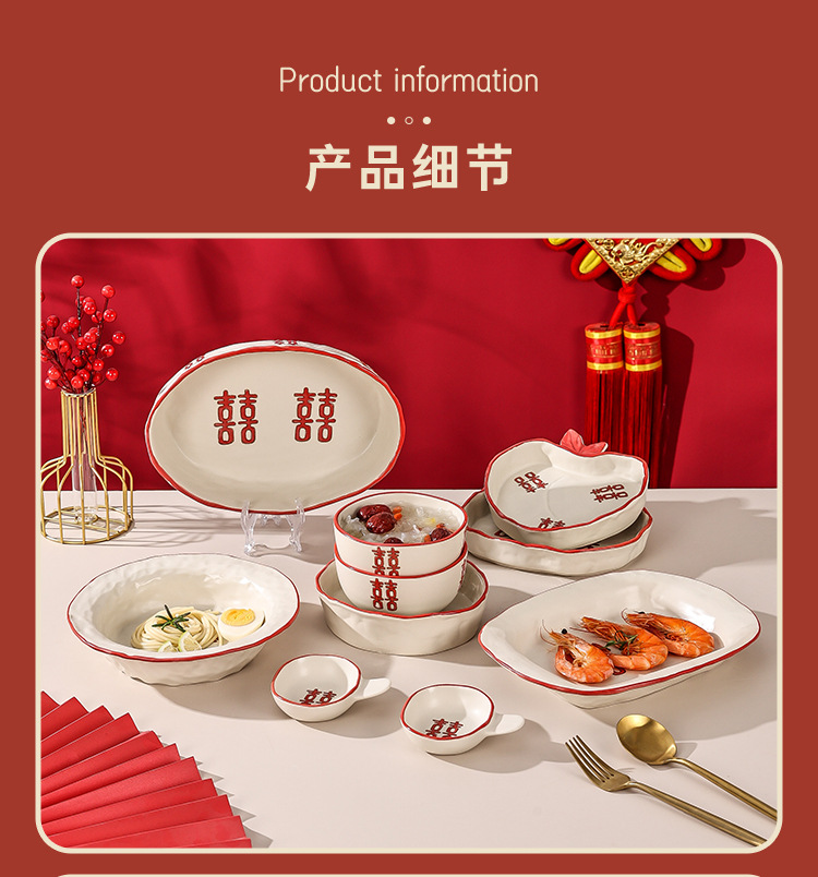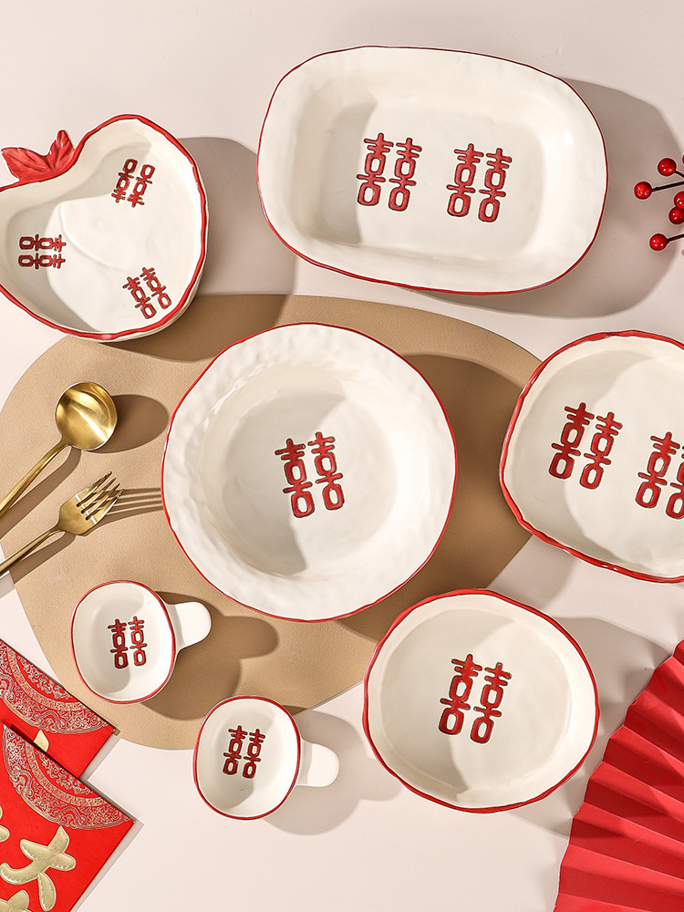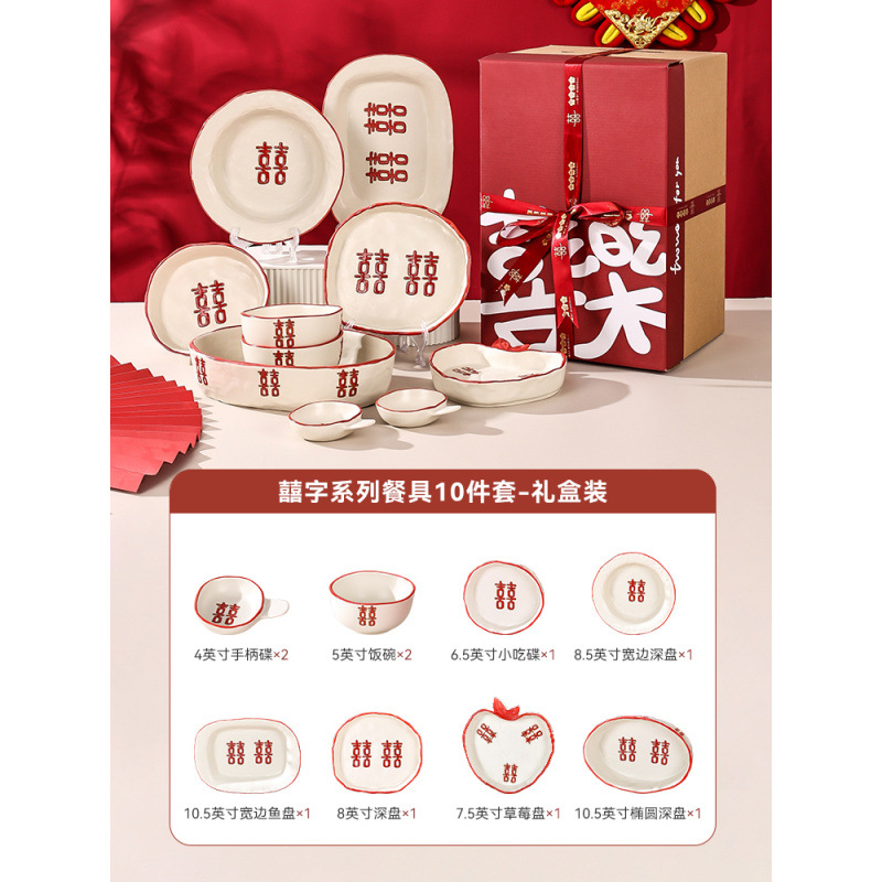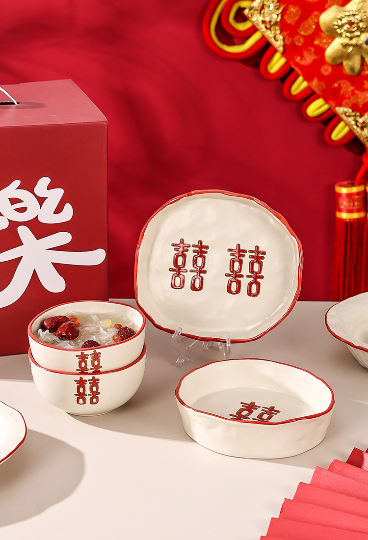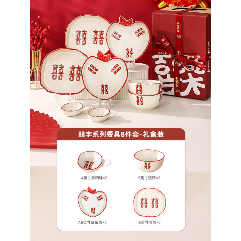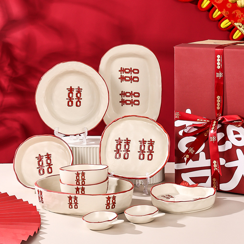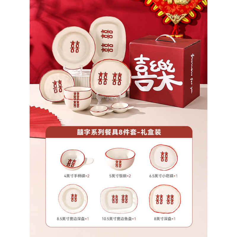 新婚陪嫁礼品碗结婚双喜餐具红色囍字碗盘筷乔迁礼盒碗碟厂家直销