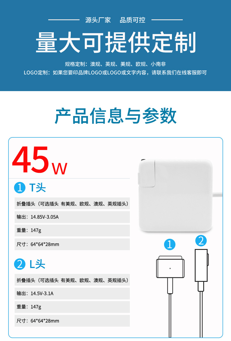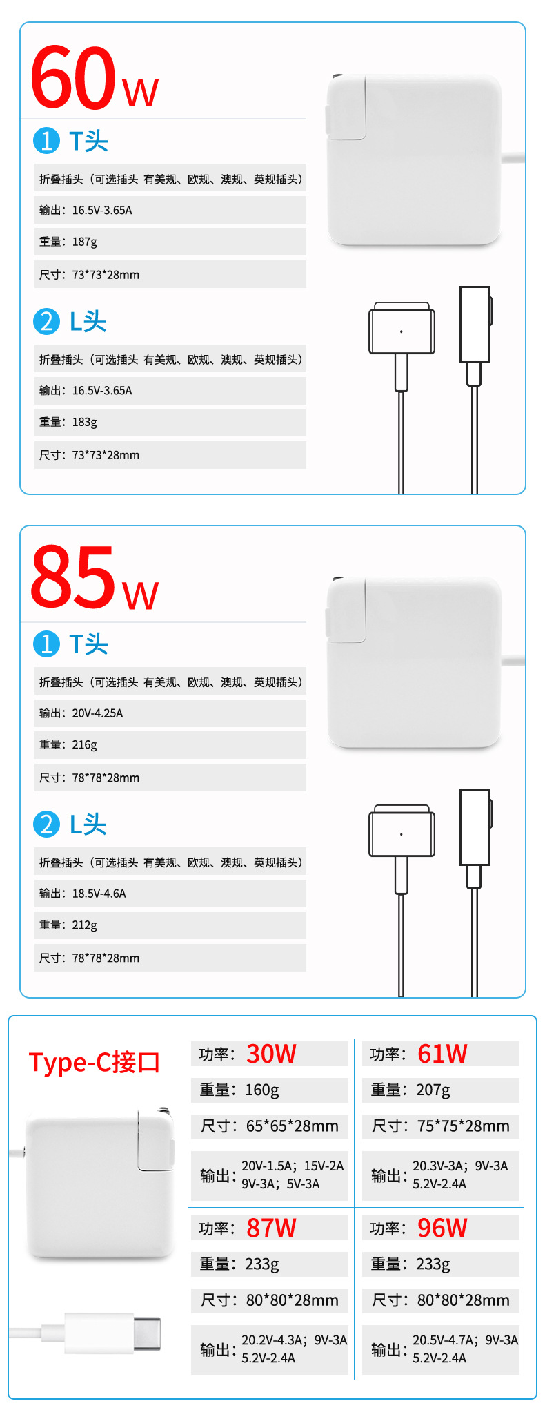 适用45W60W85W苹果笔记本电源适配器macbook电脑充电器61W87W96W