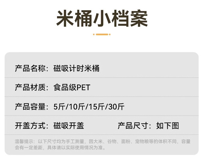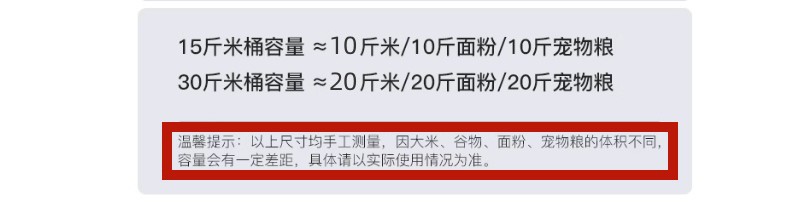 2.米桶标注的斤数,是用水测量出来的重量,不是米或者杂粮测量结果,若以上述2点理由要求退换,一律拒绝。