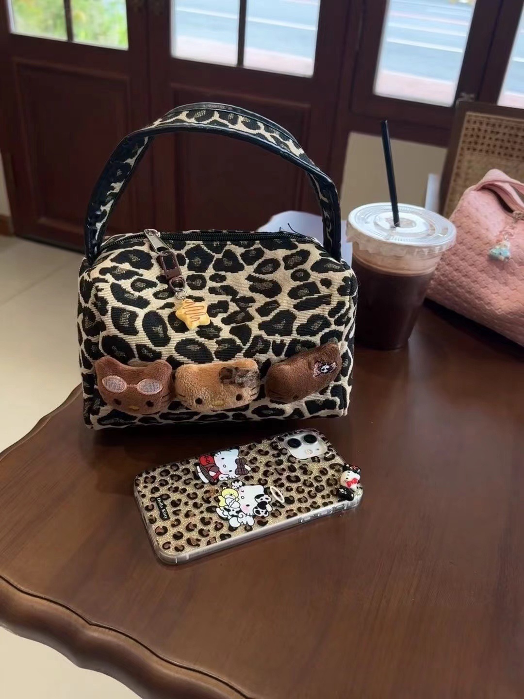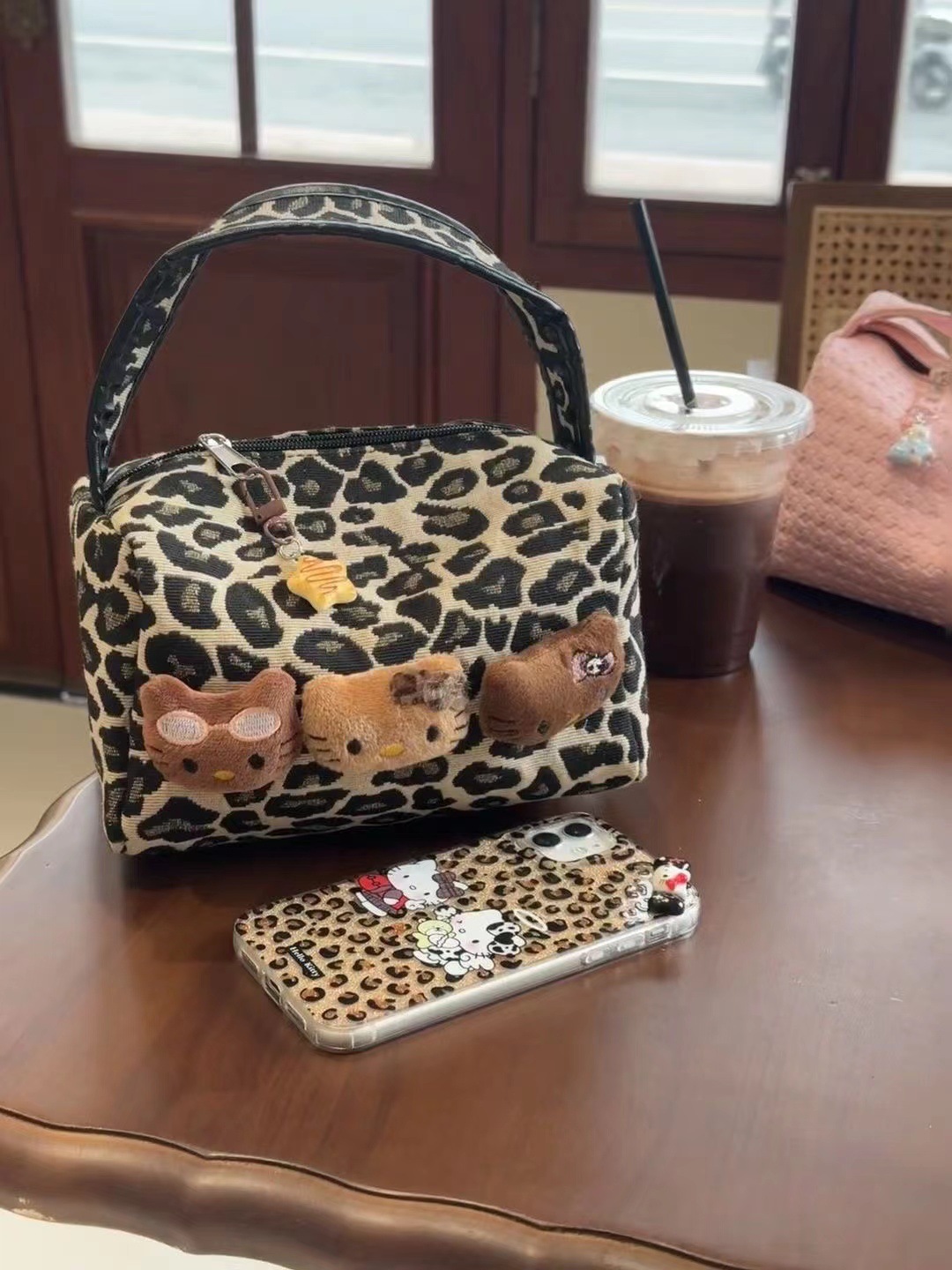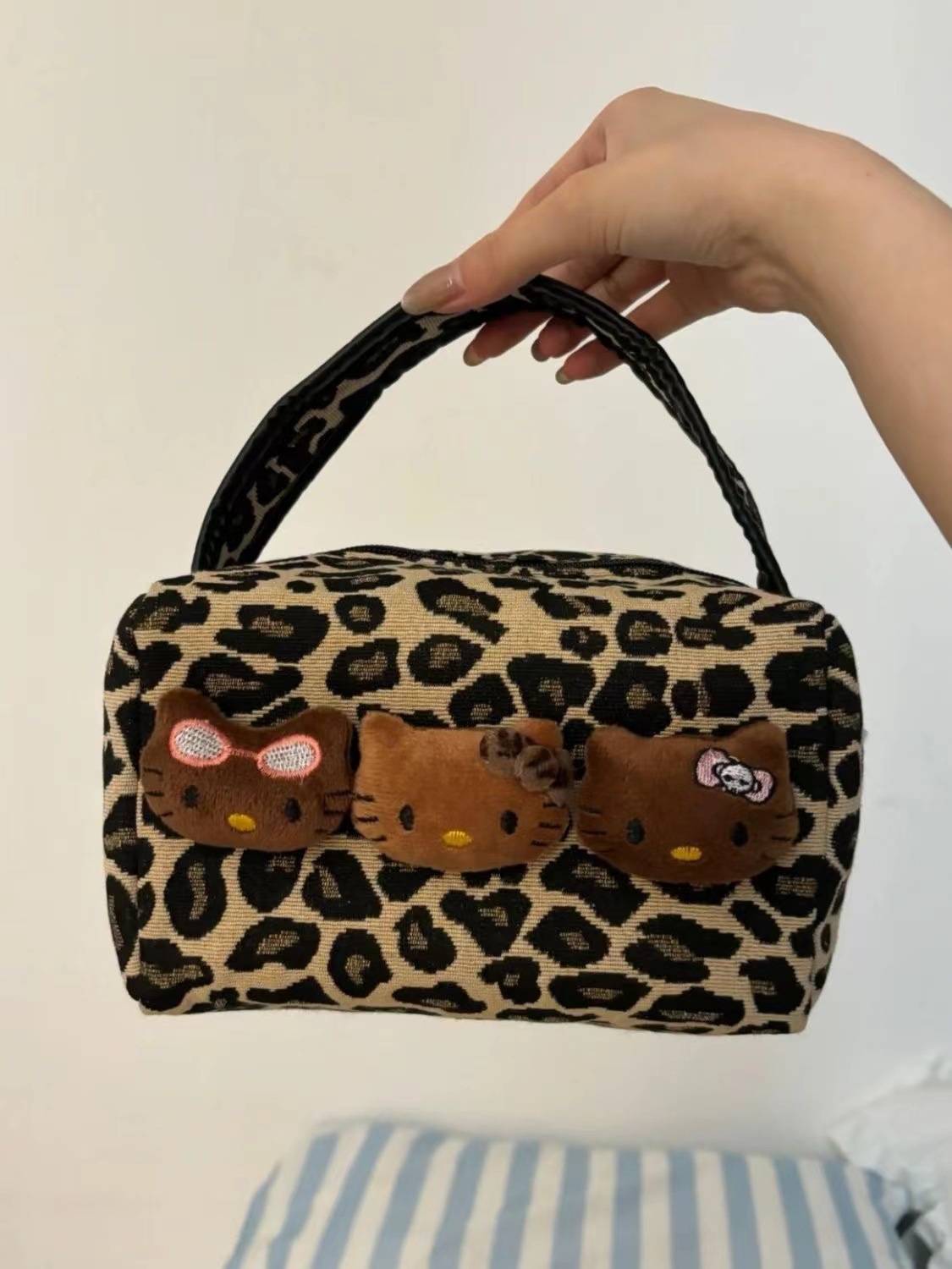 豹纹小众黑皮kitty化妆包新款高级大容量收纳便携手提化妆洗漱包