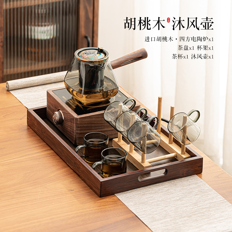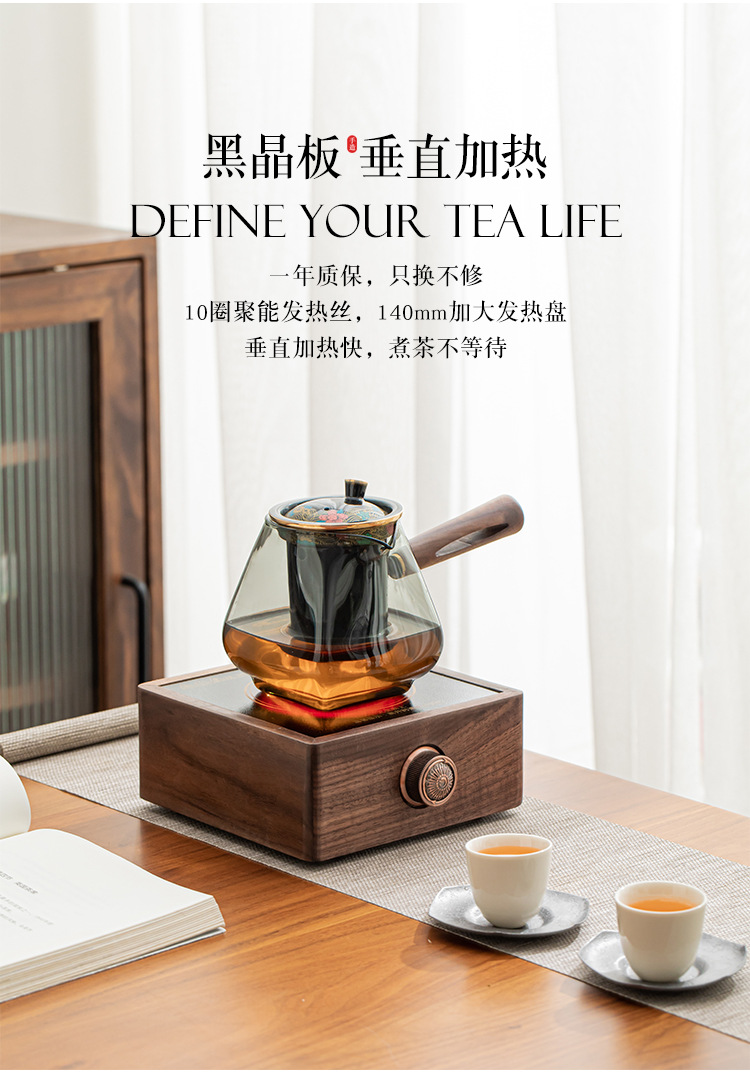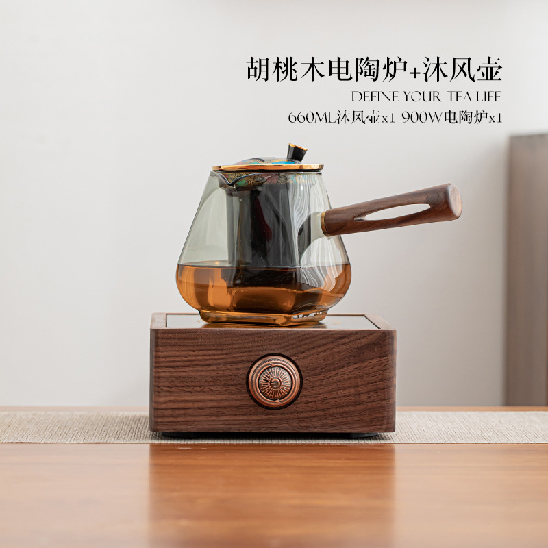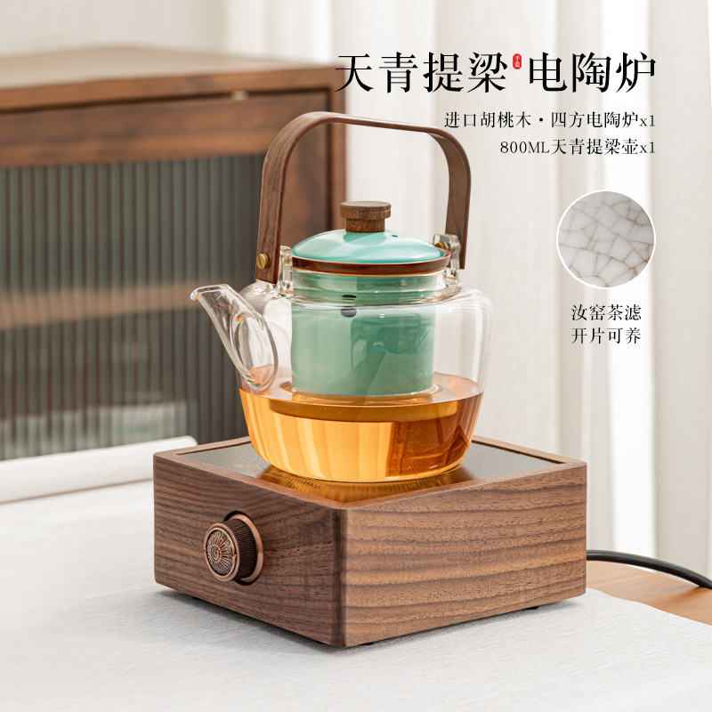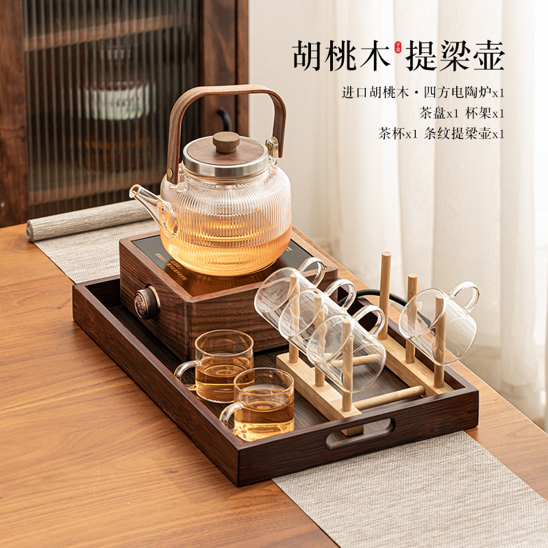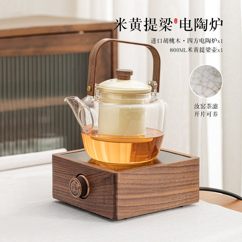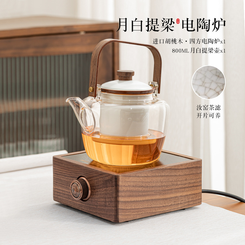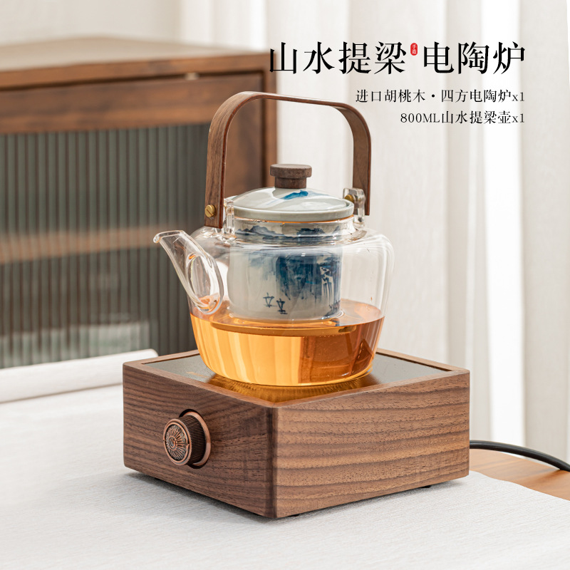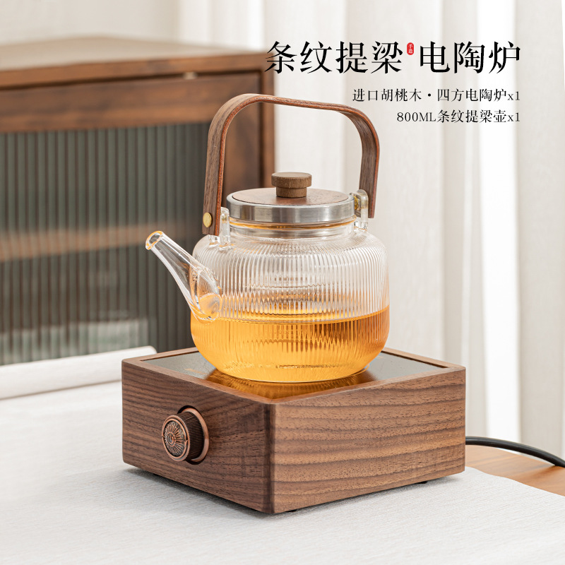 胡桃木电陶炉围炉煮茶加厚玻璃耐高温煮茶壶家用室内煮茶器提梁壶