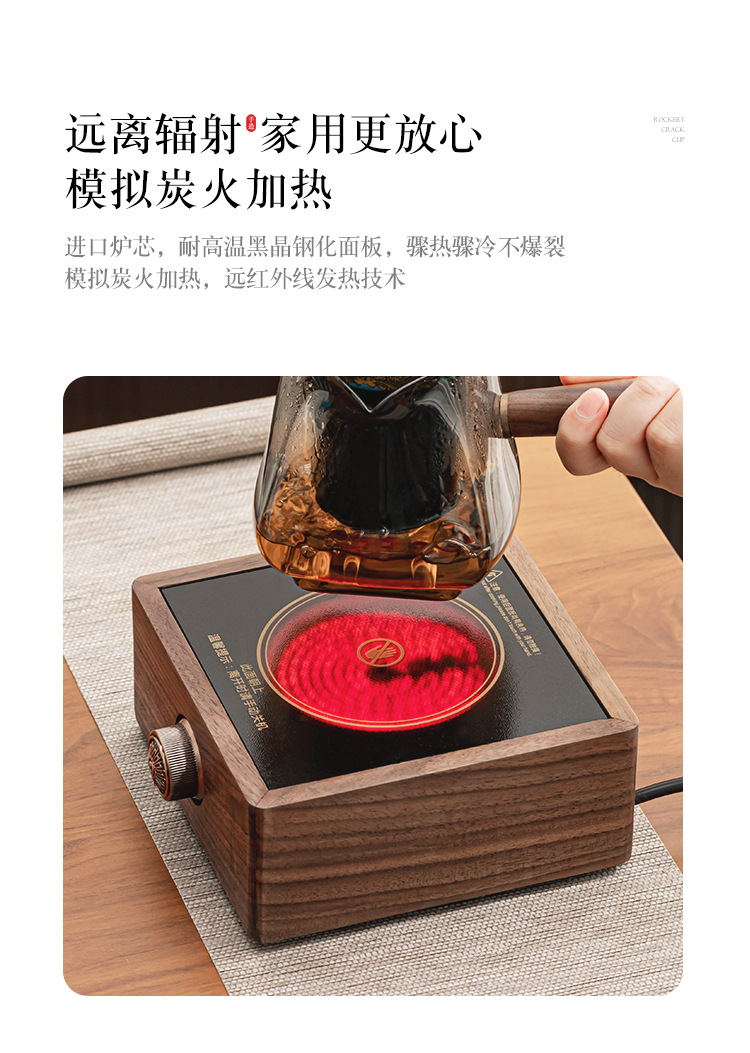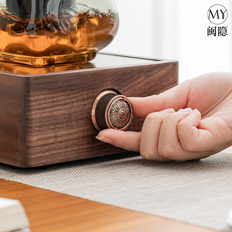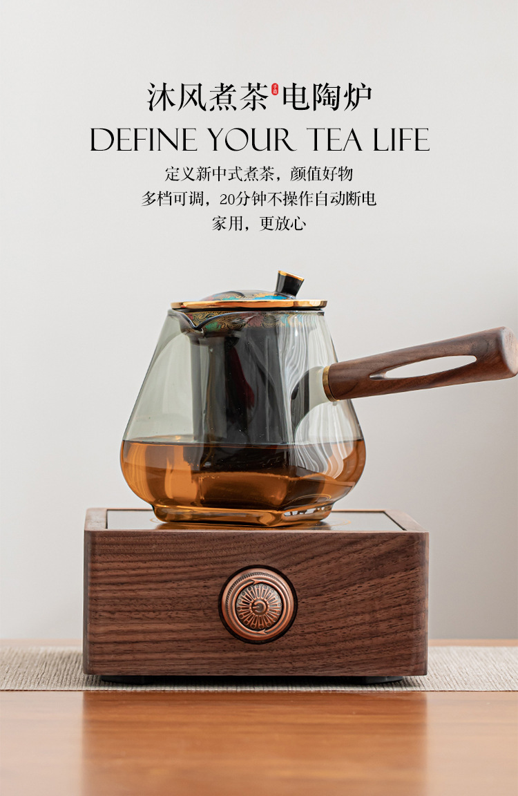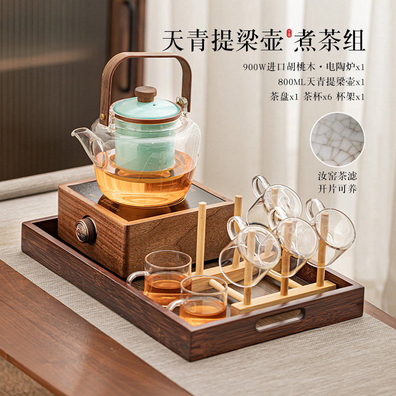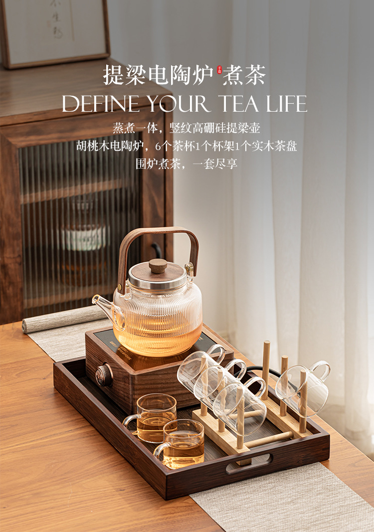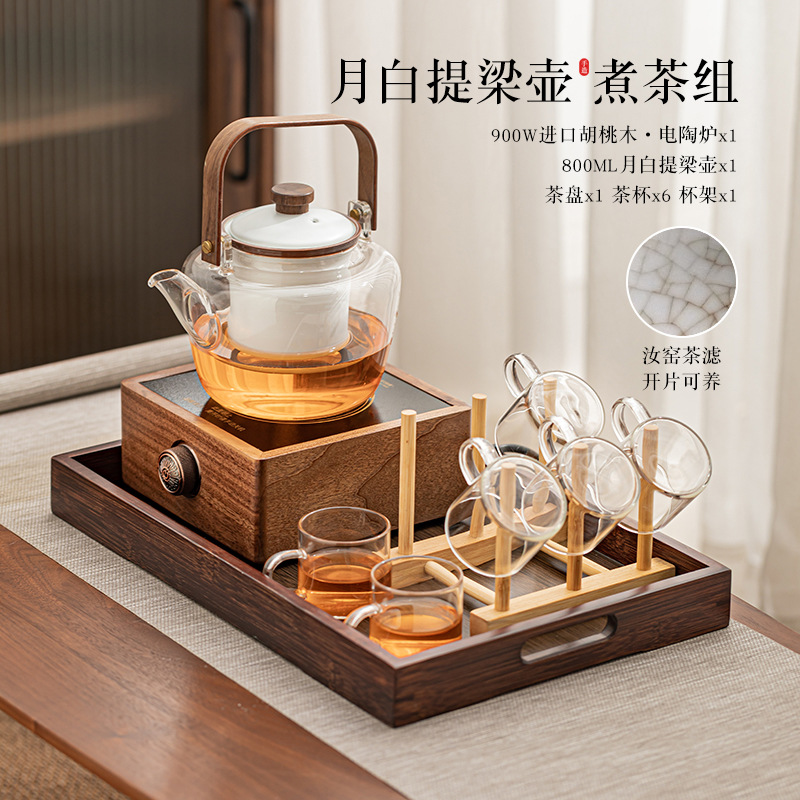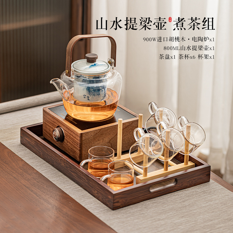 胡桃木电陶炉围炉煮茶加厚玻璃耐高温煮茶壶家用室内煮茶器提梁壶