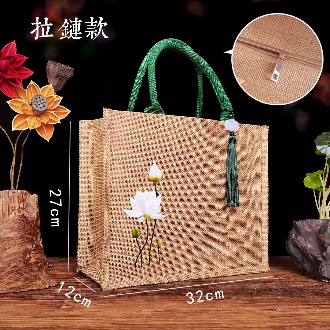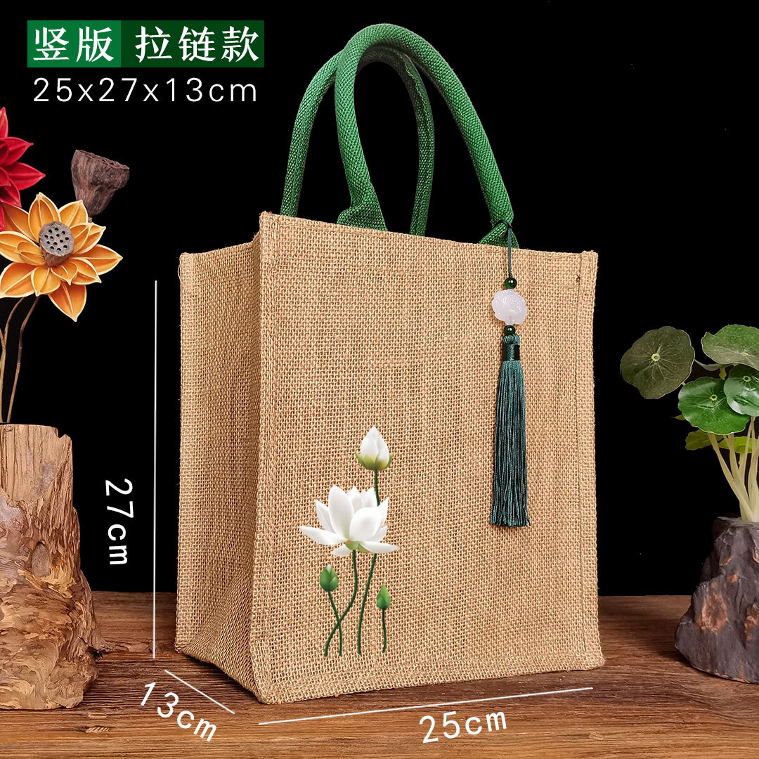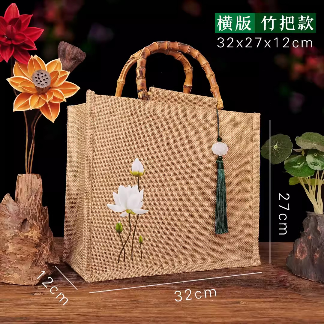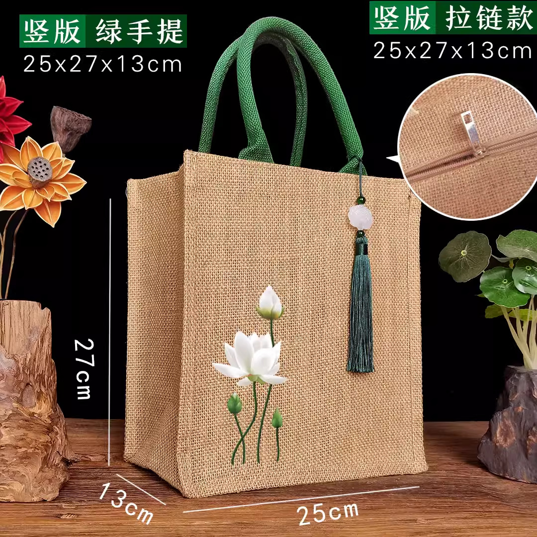 新款古风荷花麻布复古莲花黄麻礼品袋文艺伴手礼品袋加印LOGO亚麻