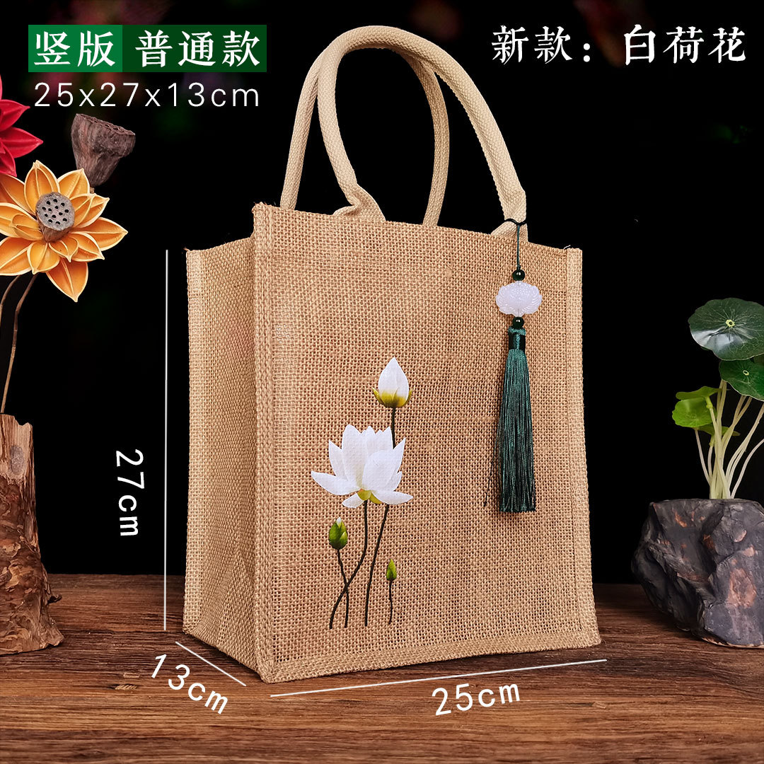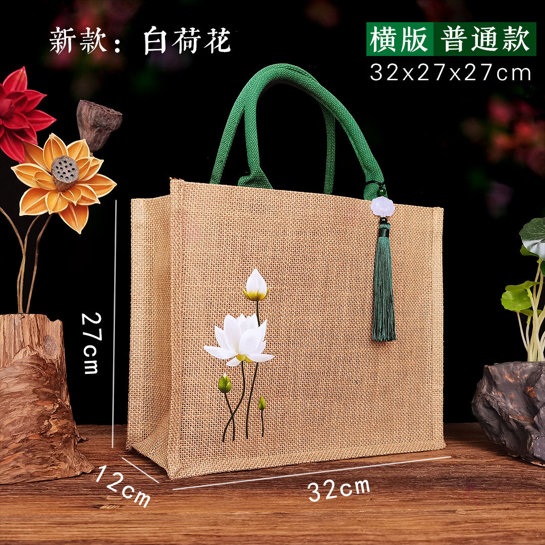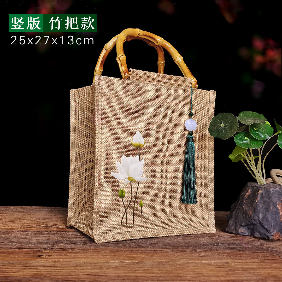 新款古风荷花麻布复古莲花黄麻礼品袋文艺伴手礼品袋加印LOGO亚麻