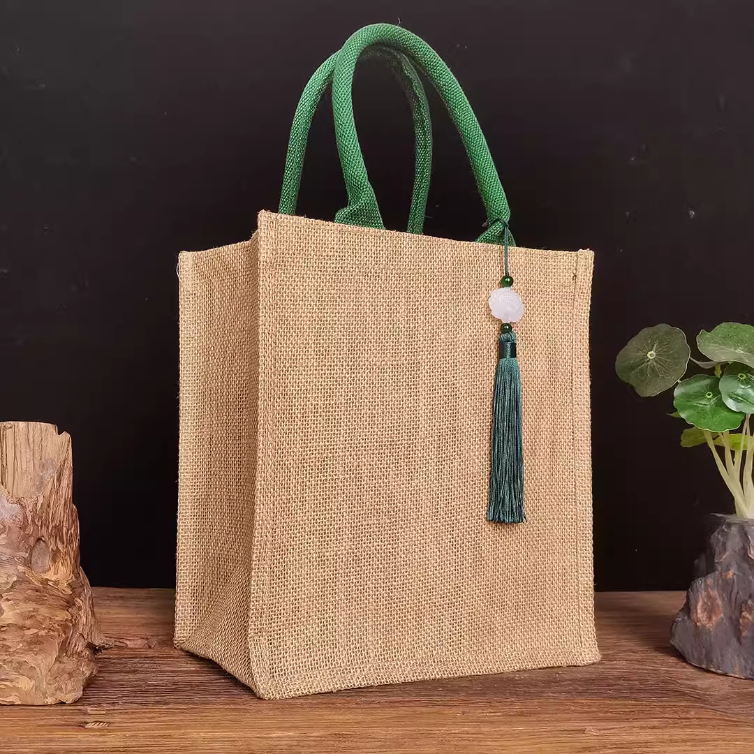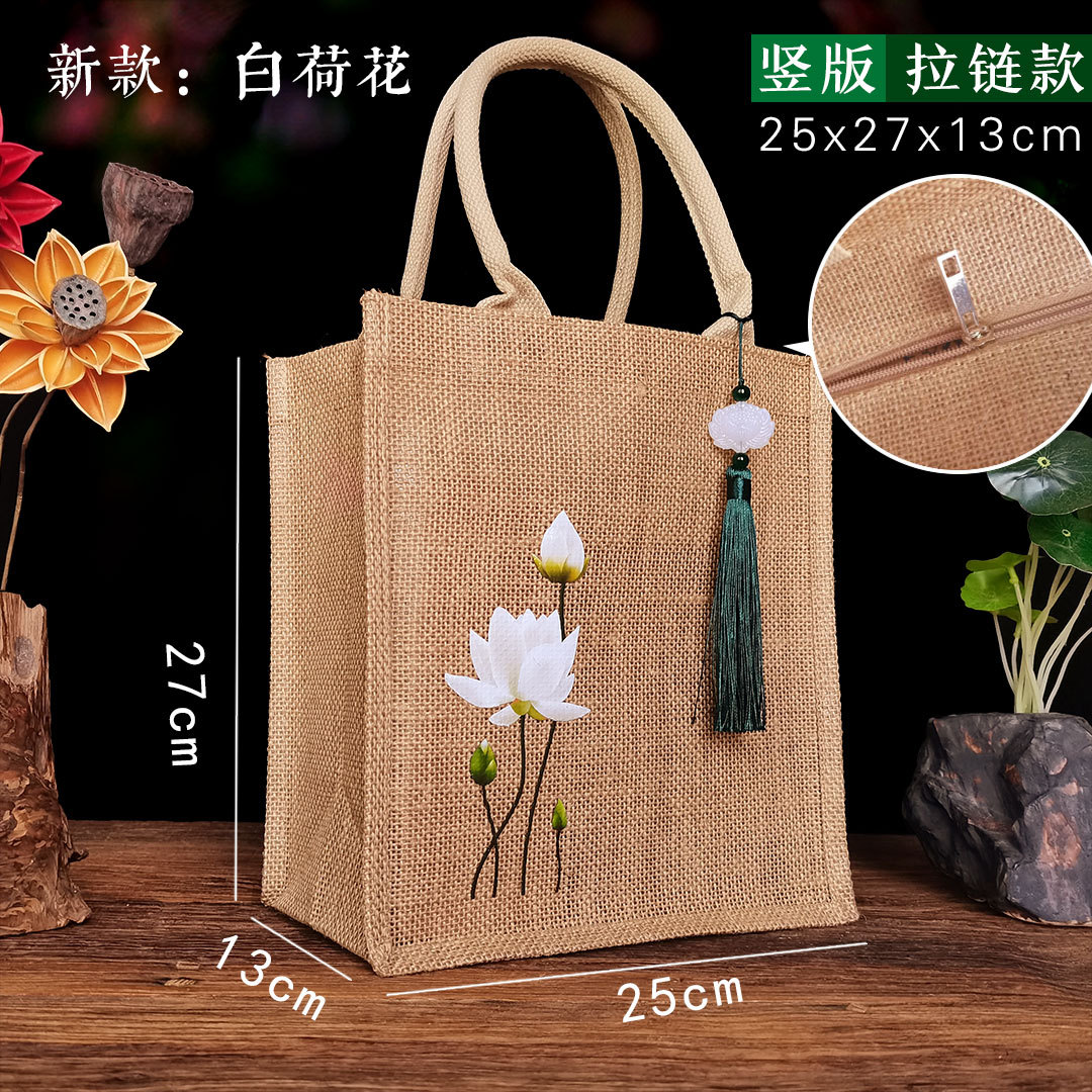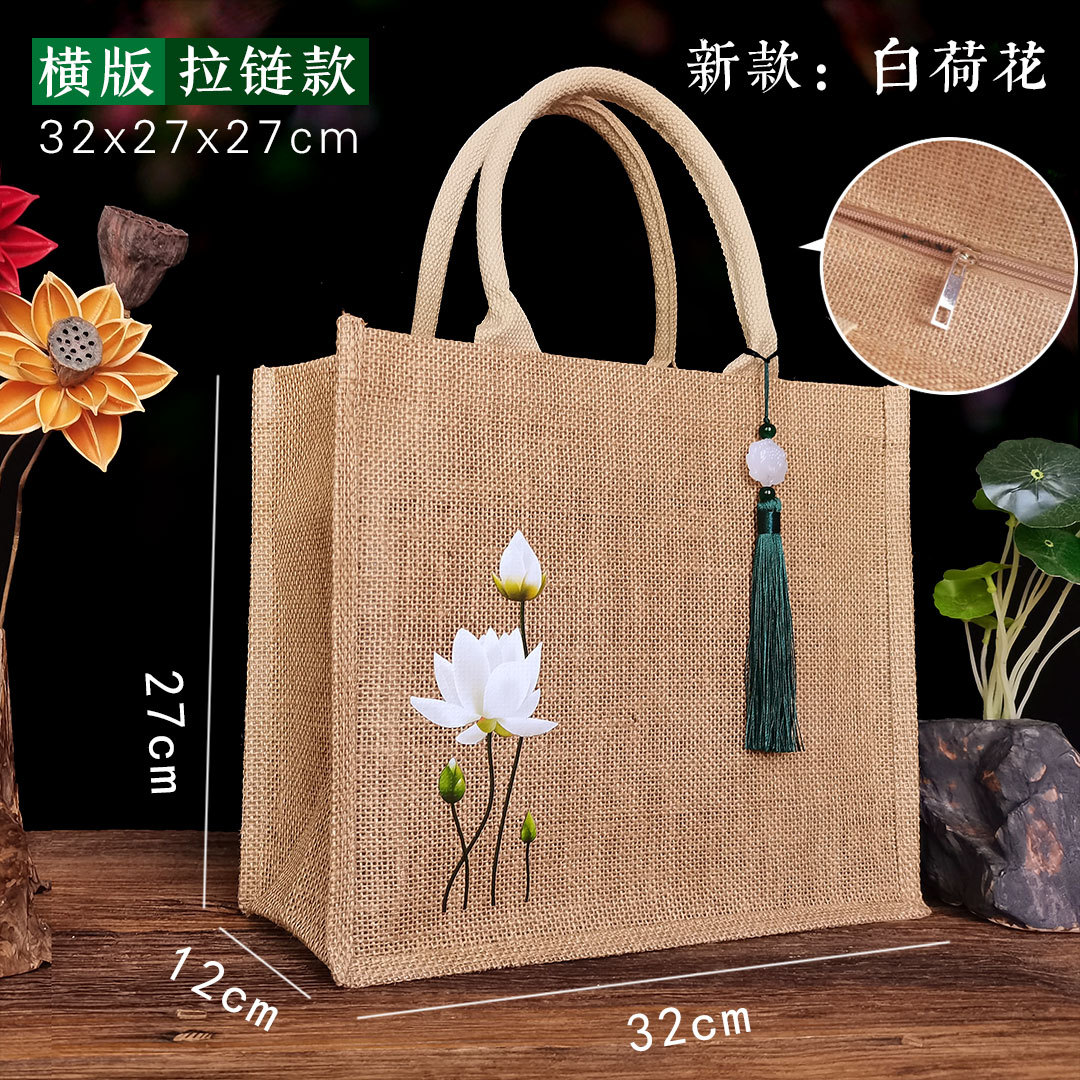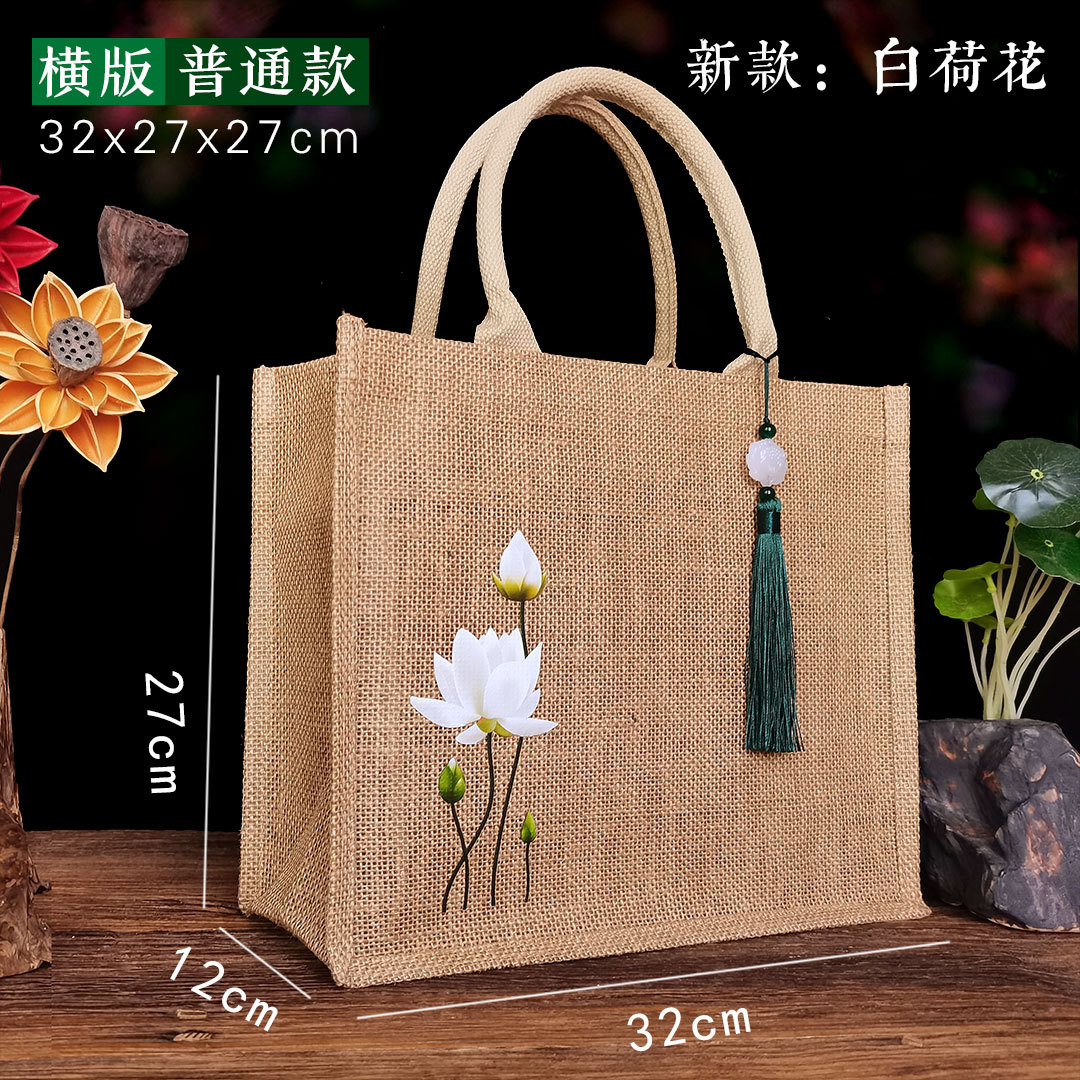 新款古风荷花麻布复古莲花黄麻礼品袋文艺伴手礼品袋加印LOGO亚麻