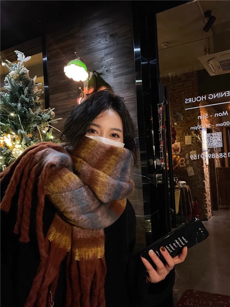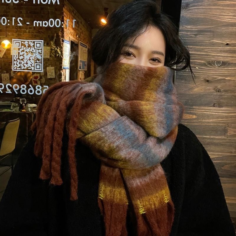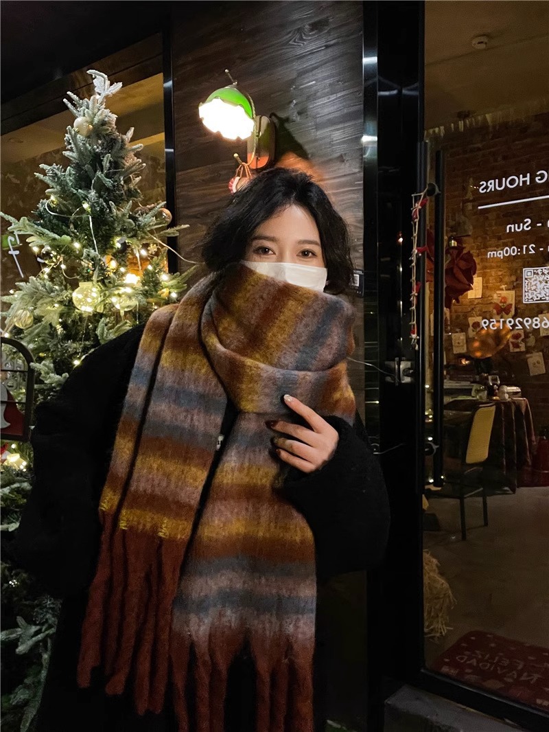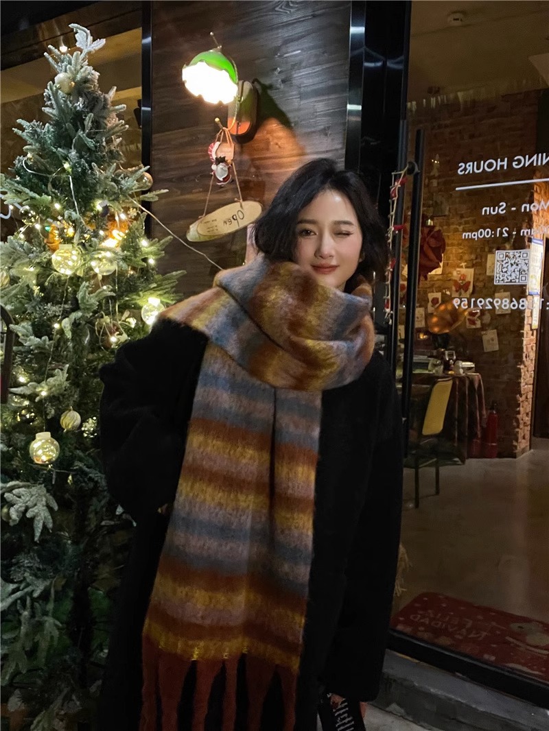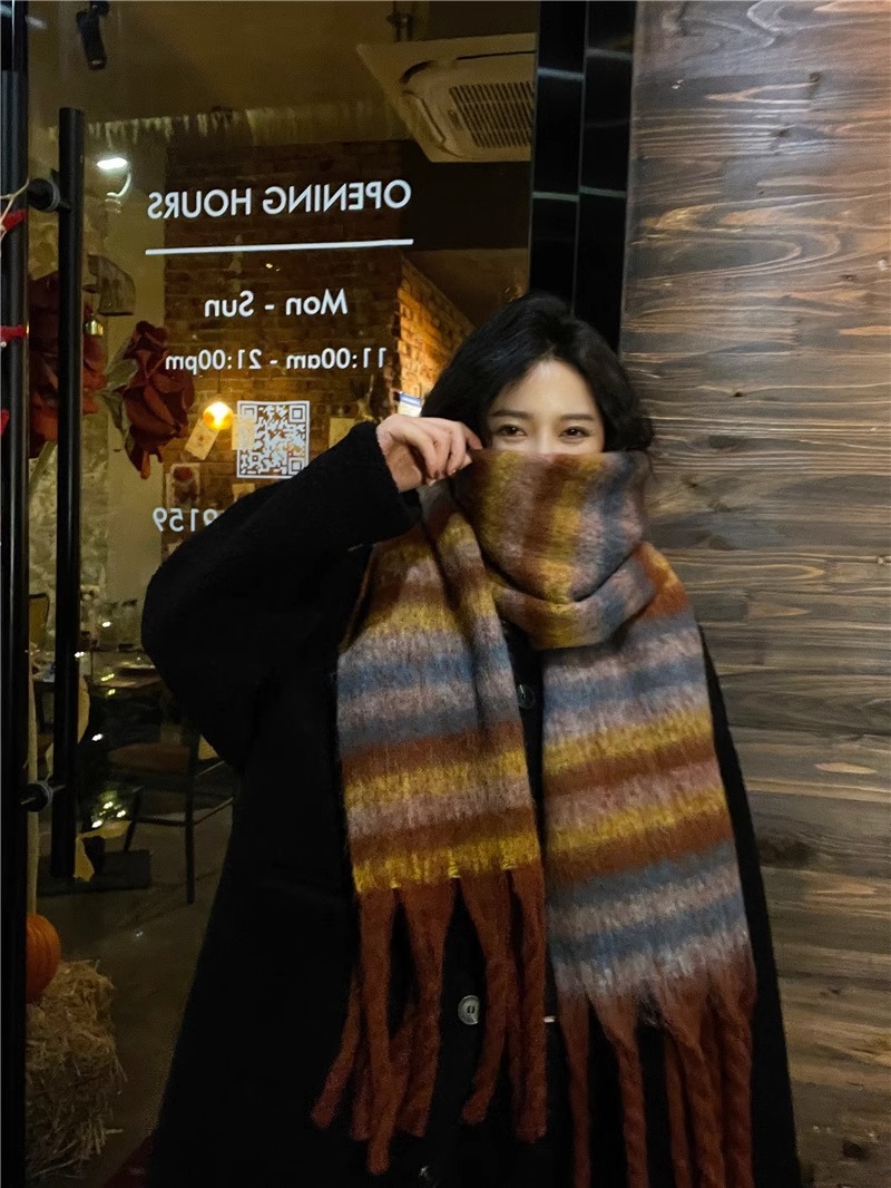韩版条纹围巾冬季女生高级感拉毛彩色保暖围脖学生情侣款披肩两用