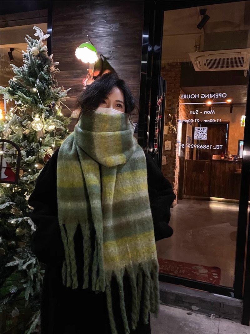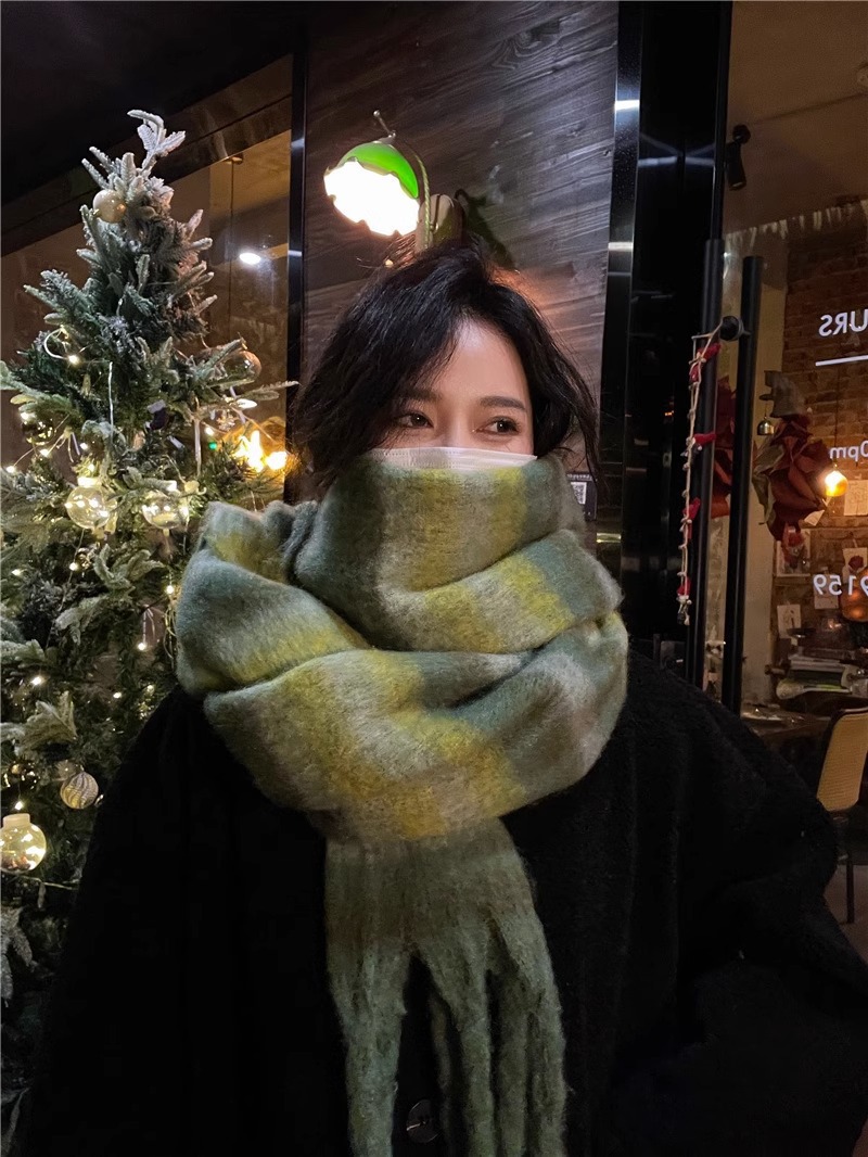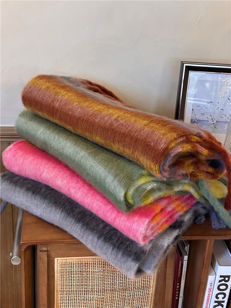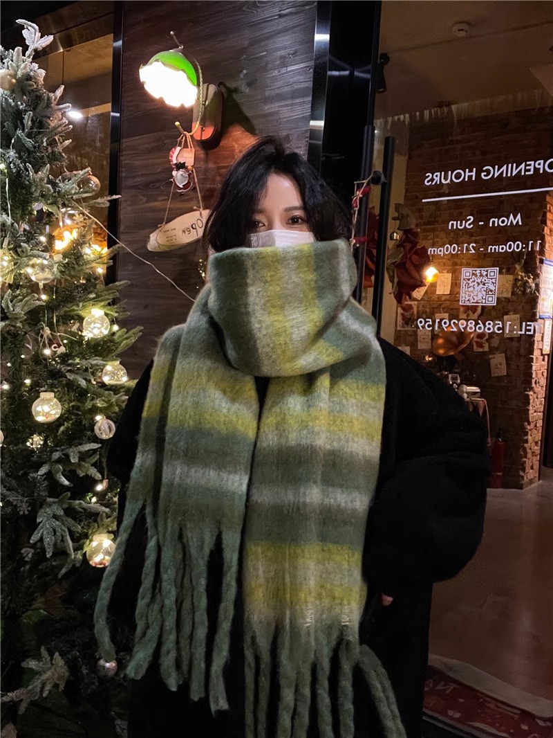 韩版条纹围巾冬季女生高级感拉毛彩色保暖围脖学生情侣款披肩两用