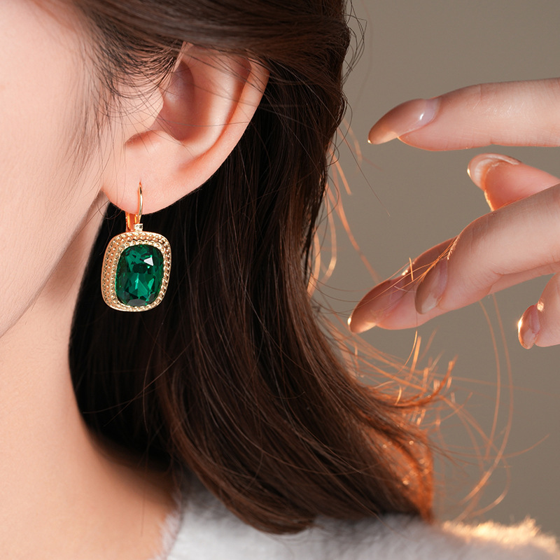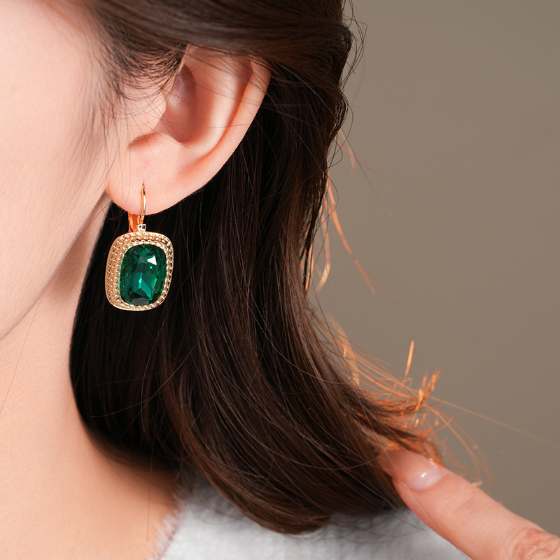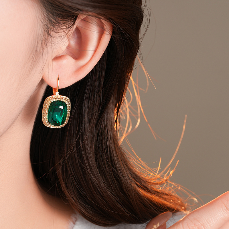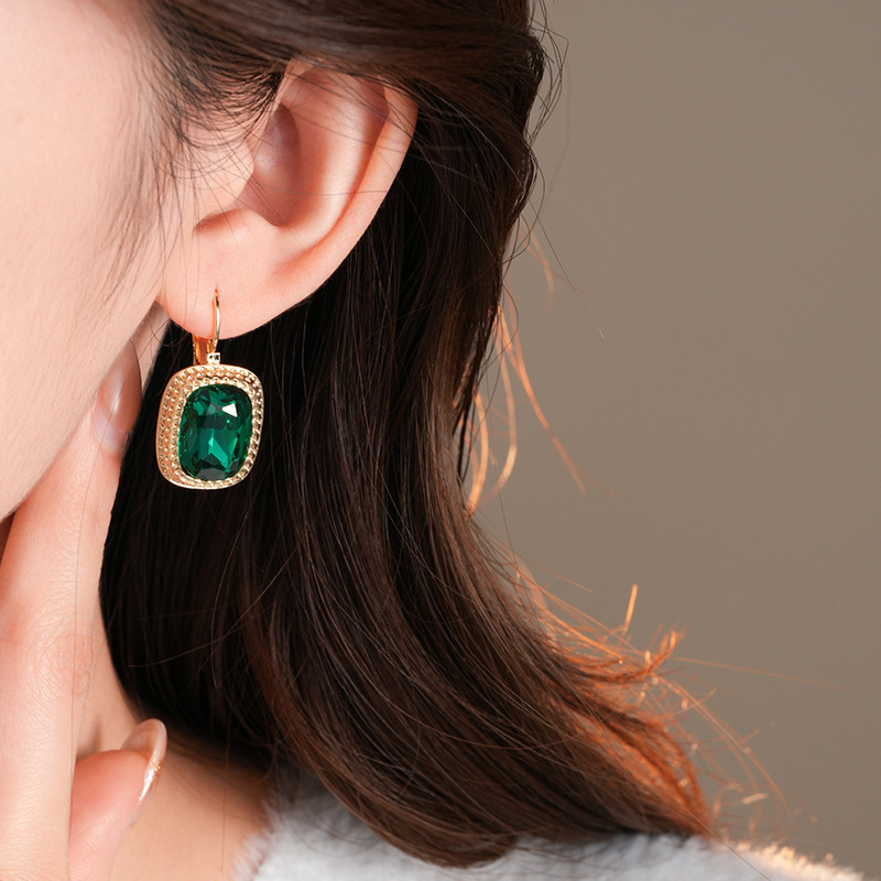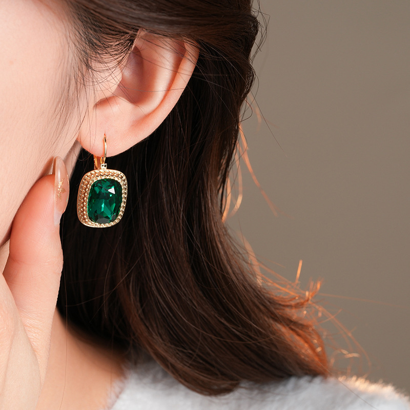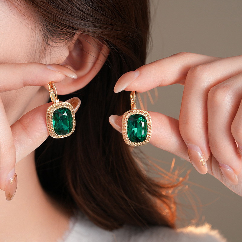 复古祖母绿长方形耳环气质精致轻奢耳扣小众百搭高级感耳饰批发女