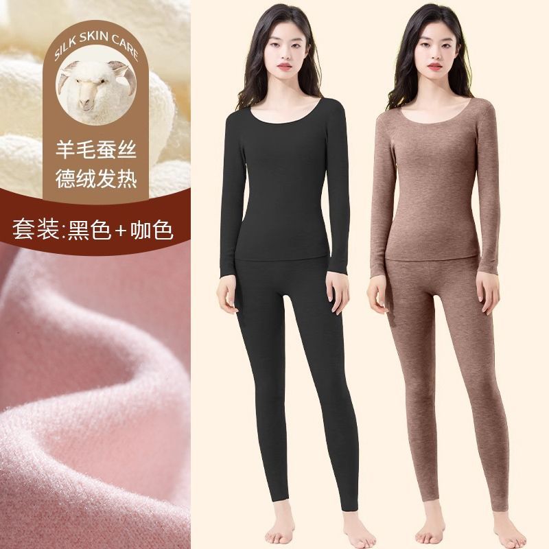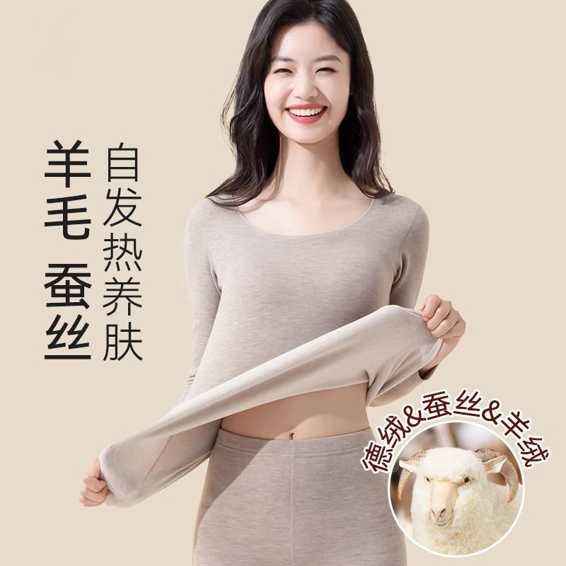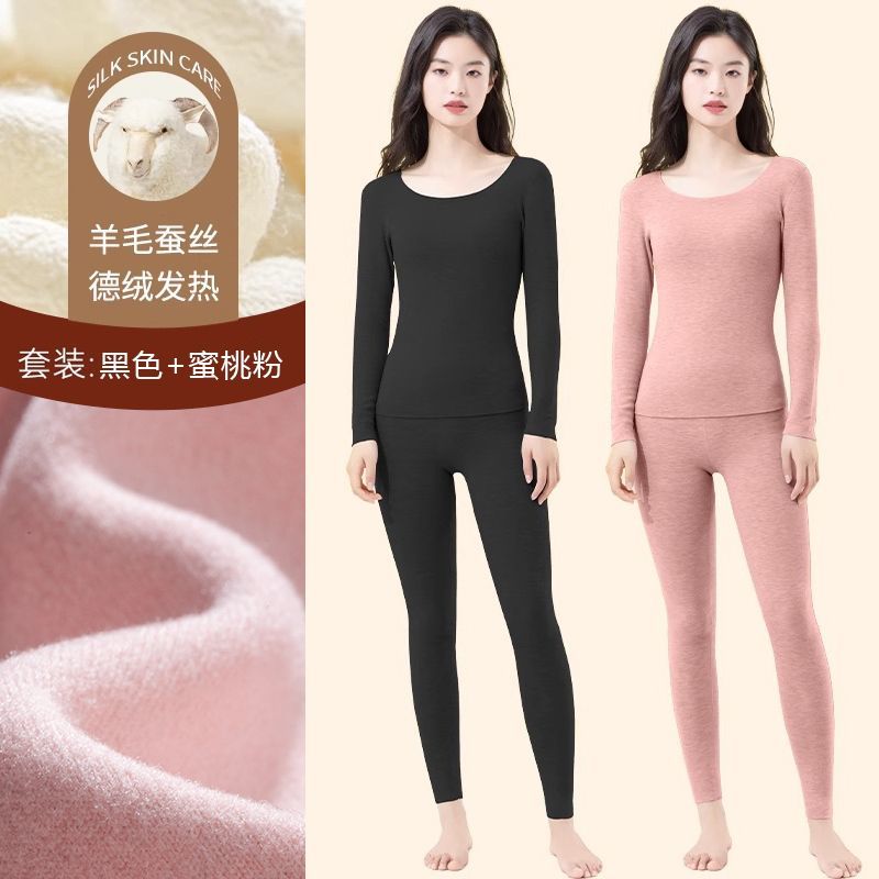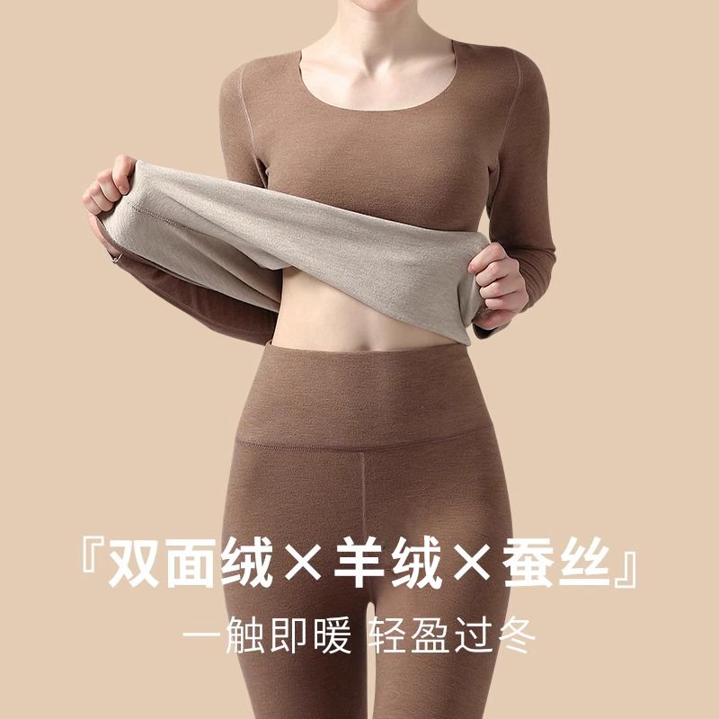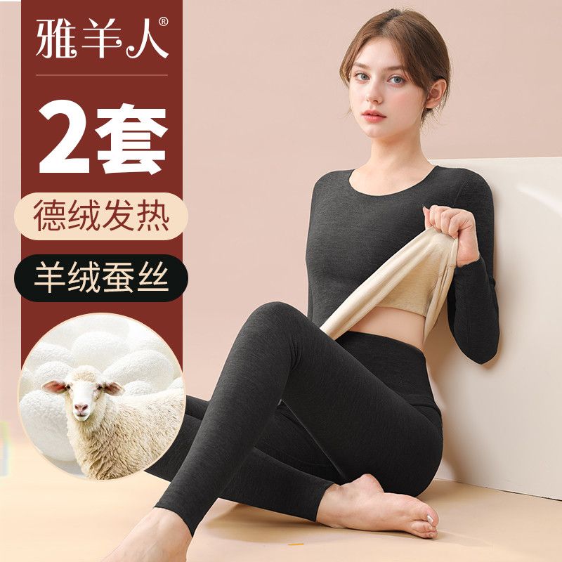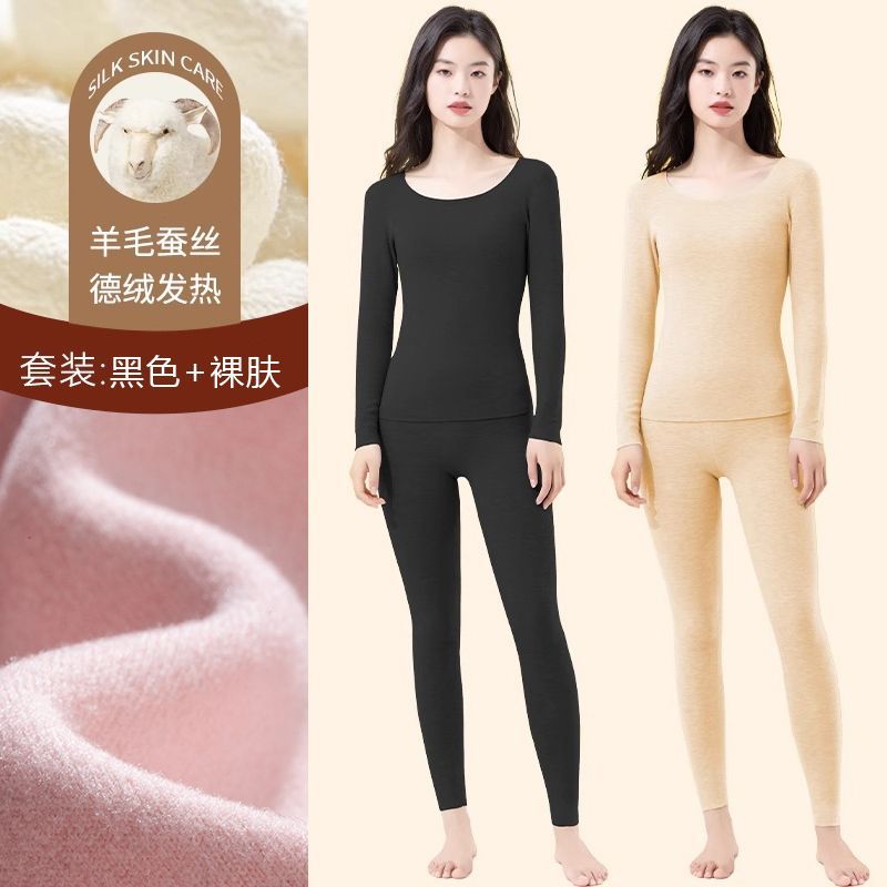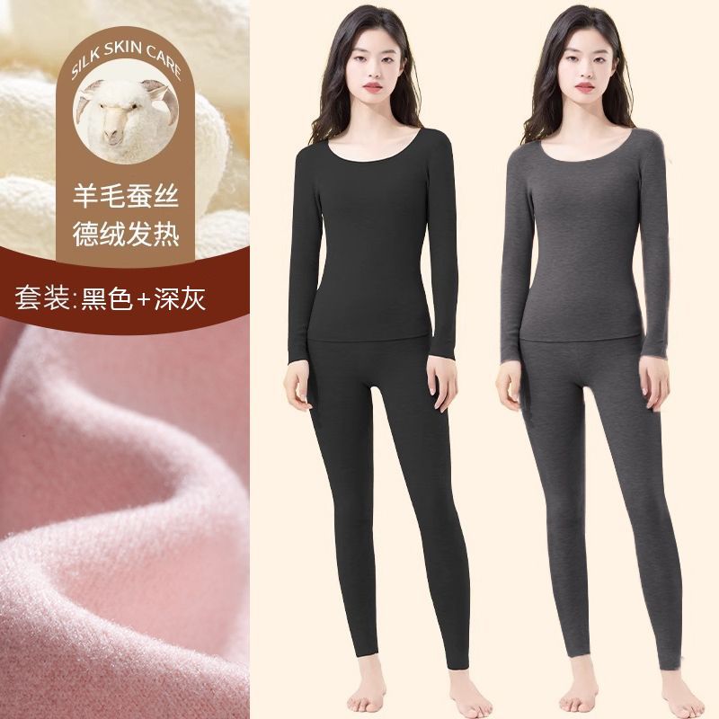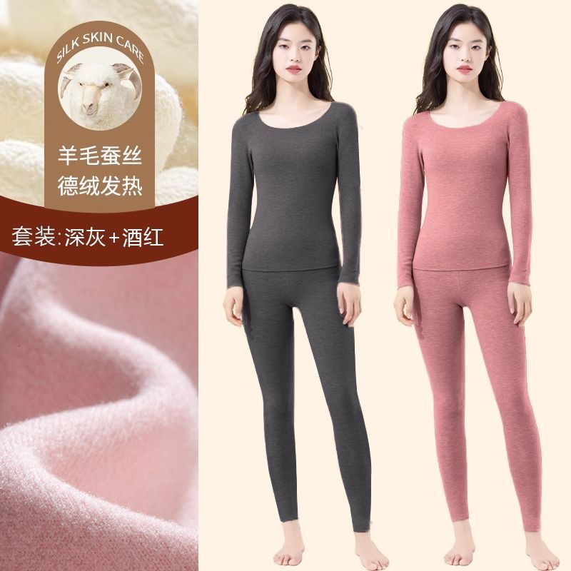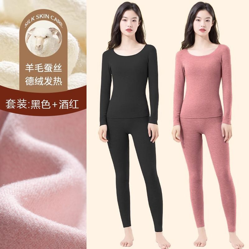 羊绒蚕丝德绒保暖内衣套装女士无痕发热加绒加厚打底秋衣秋裤冬季