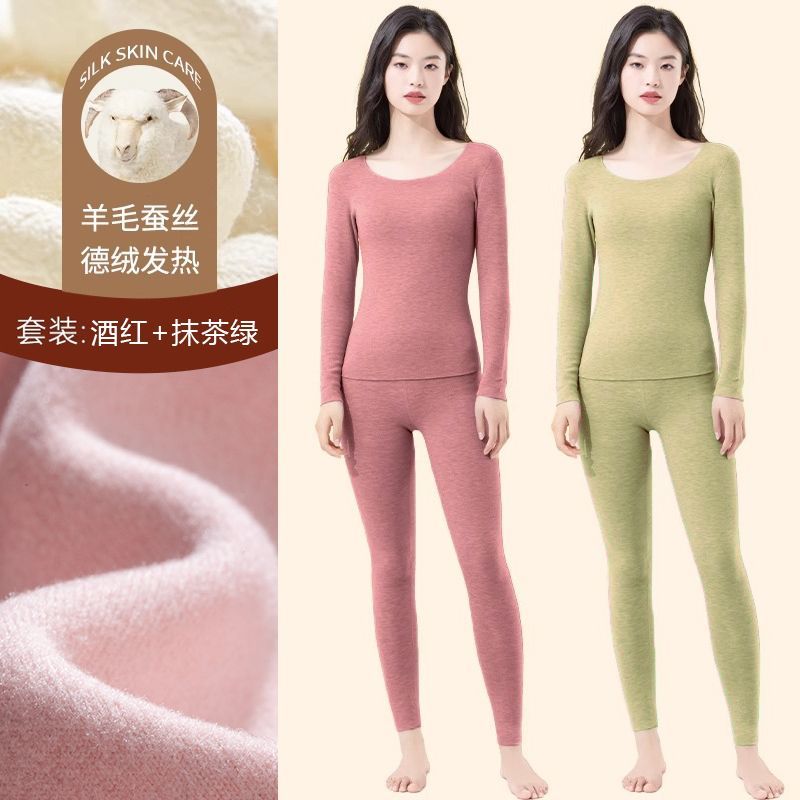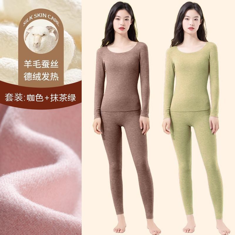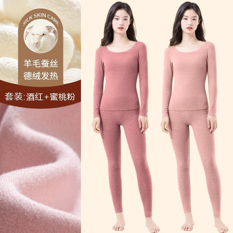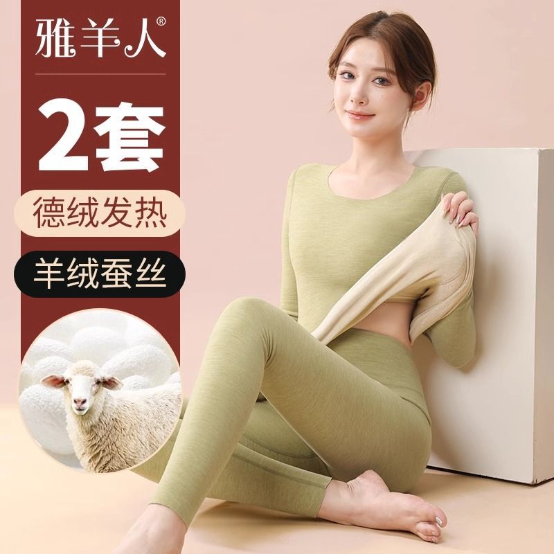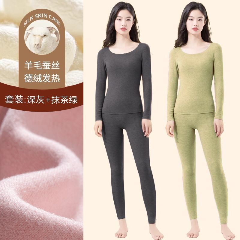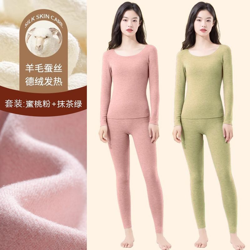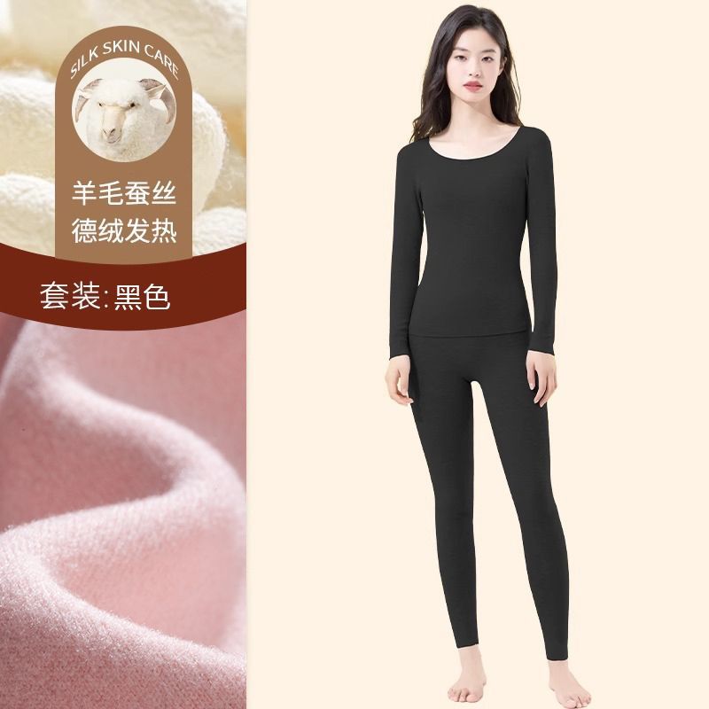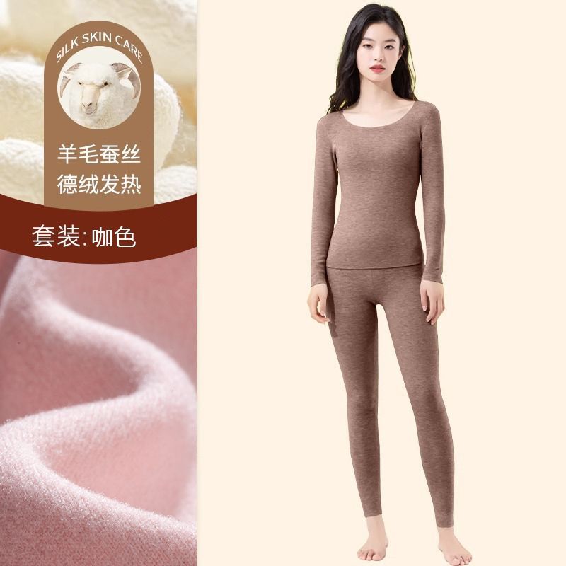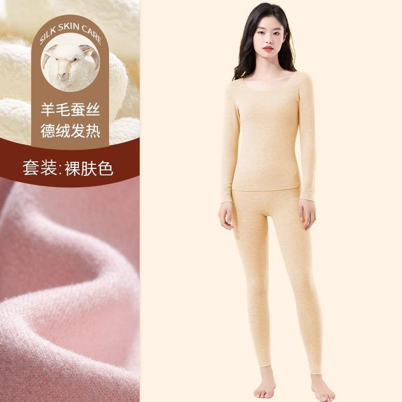 羊绒蚕丝德绒保暖内衣套装女士无痕发热加绒加厚打底秋衣秋裤冬季