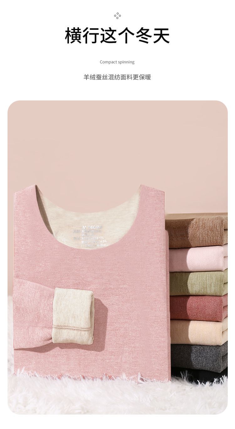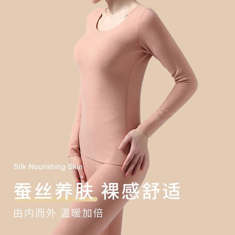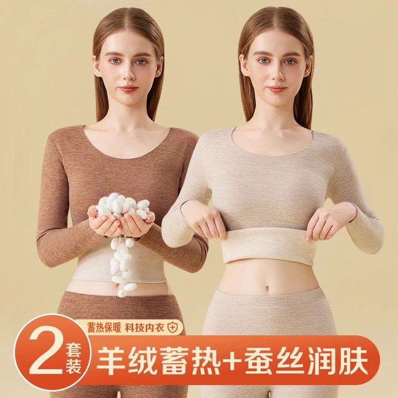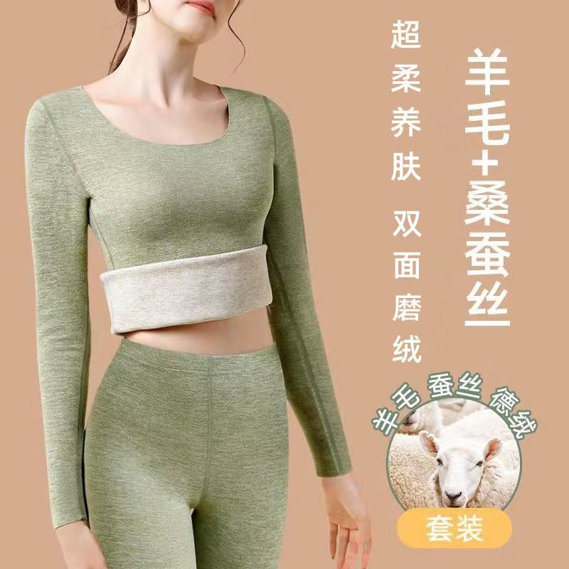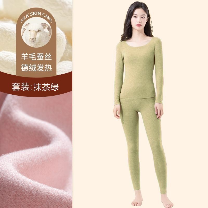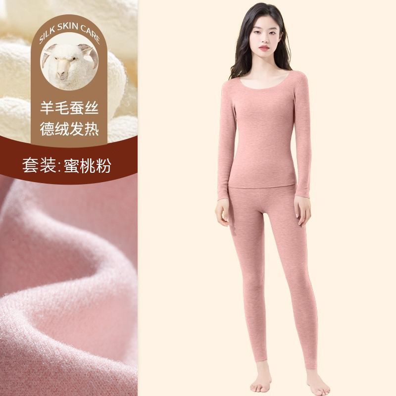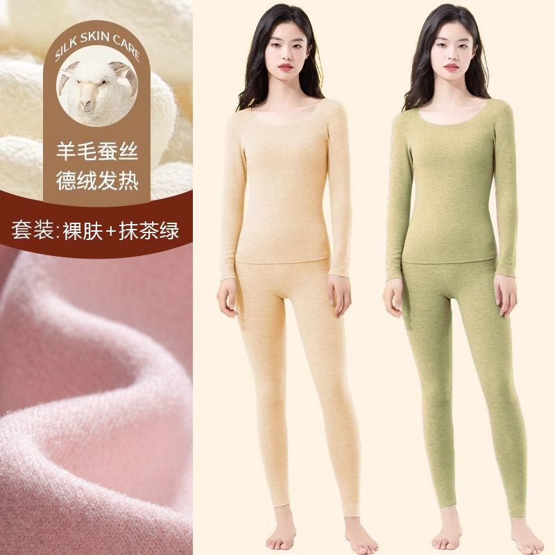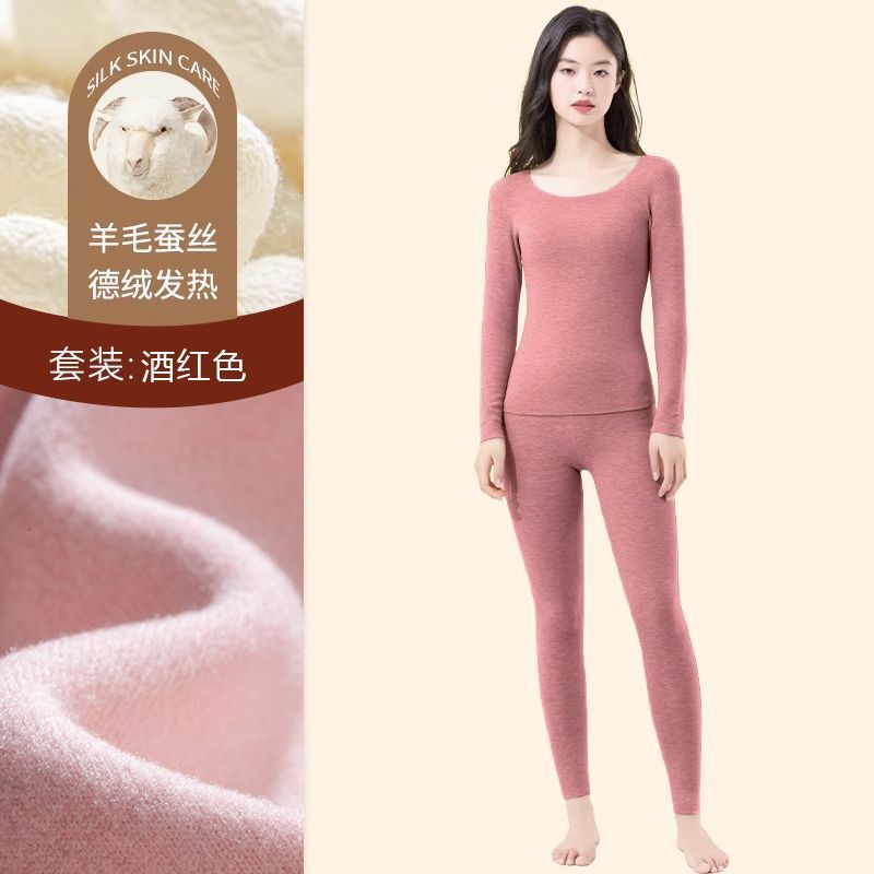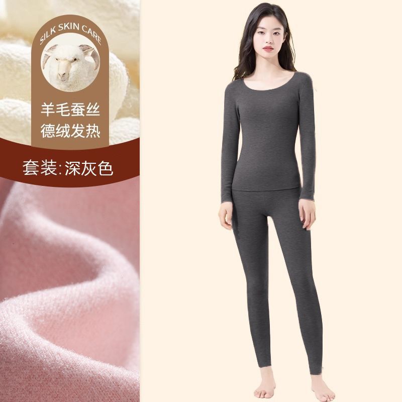 羊绒蚕丝德绒保暖内衣套装女士无痕发热加绒加厚打底秋衣秋裤冬季