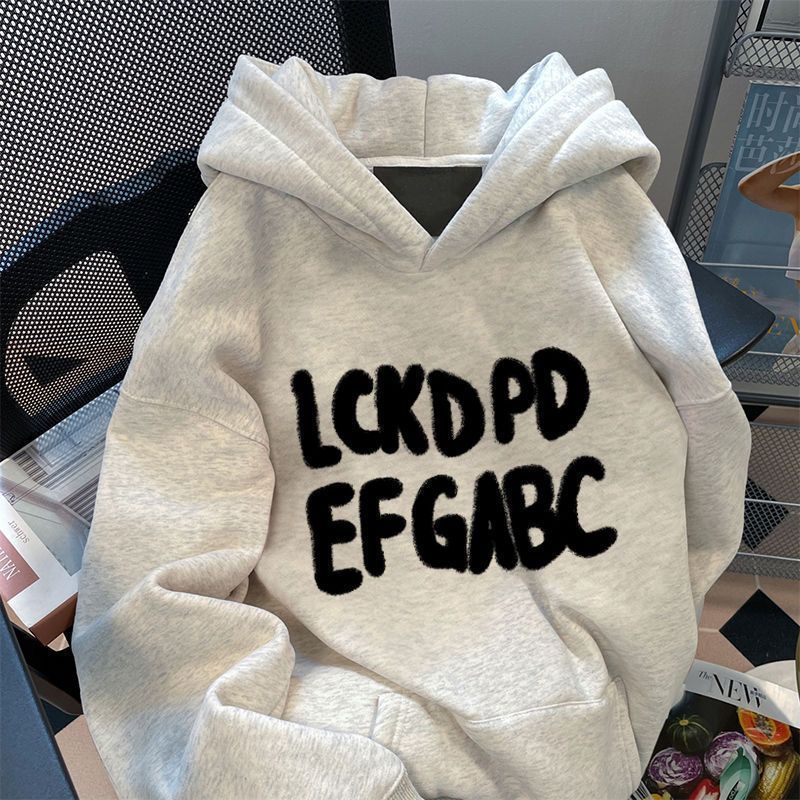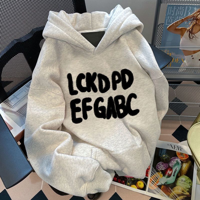 100%不起球小众设计感字母连帽卫衣女秋冬宽松加绒加厚慵懒风外套