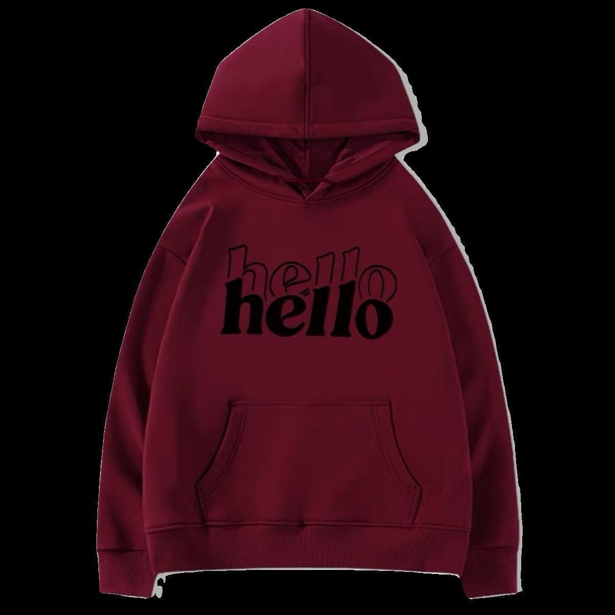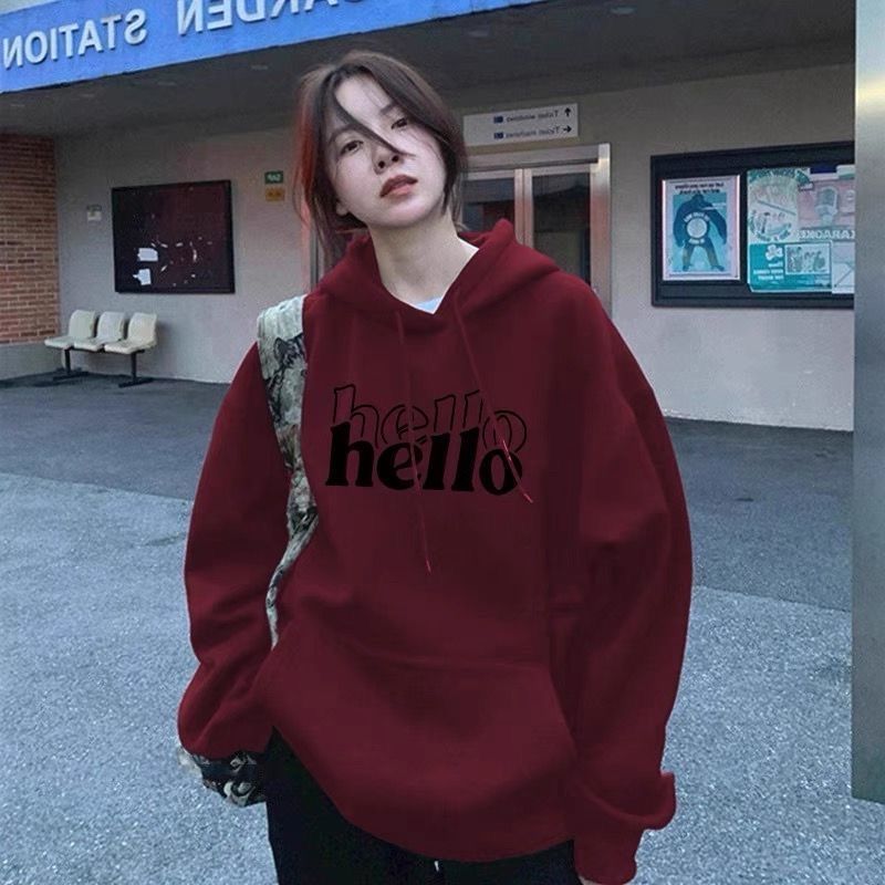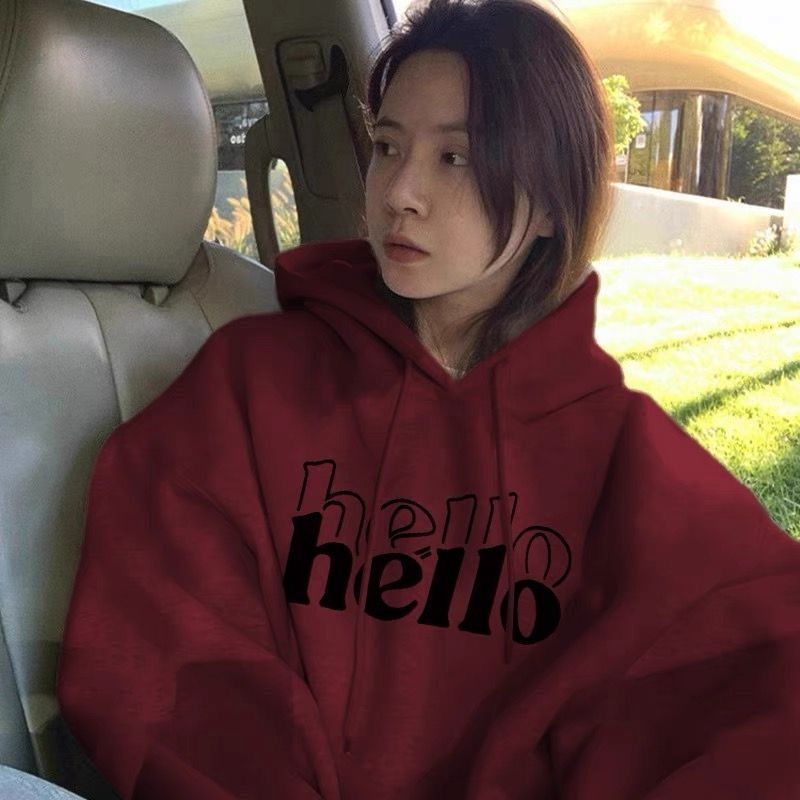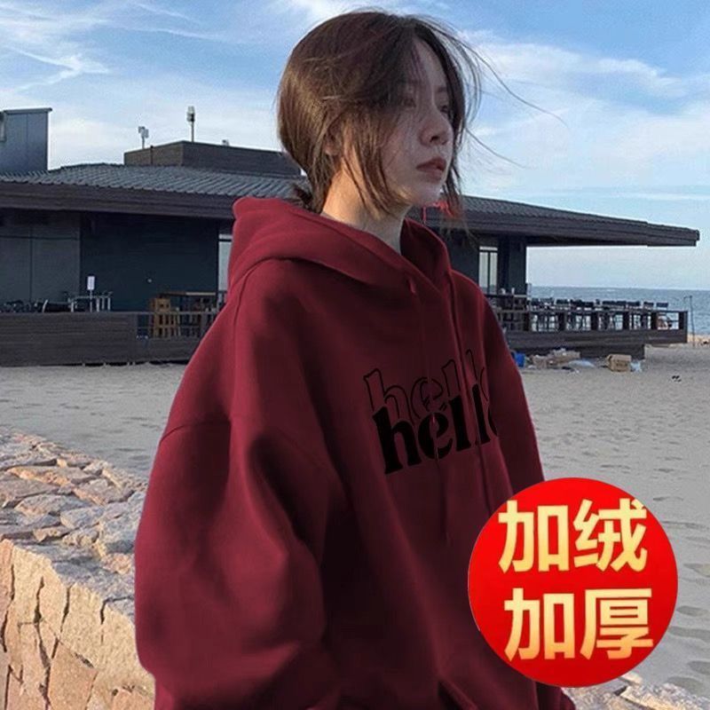 酒红色日系慵懒风连帽卫衣女春秋冬季加绒加厚早学生情侣宽松上衣