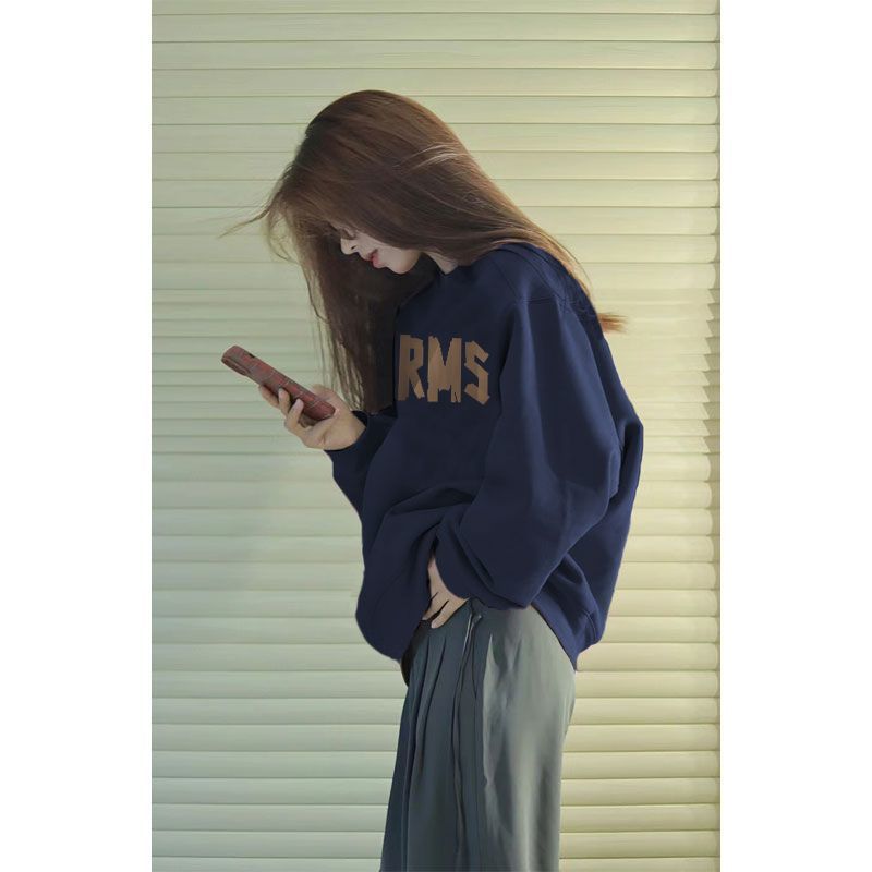 美式宽松显瘦百搭圆领卫衣女藏青色秋冬加绒加厚字母印花上衣潮流