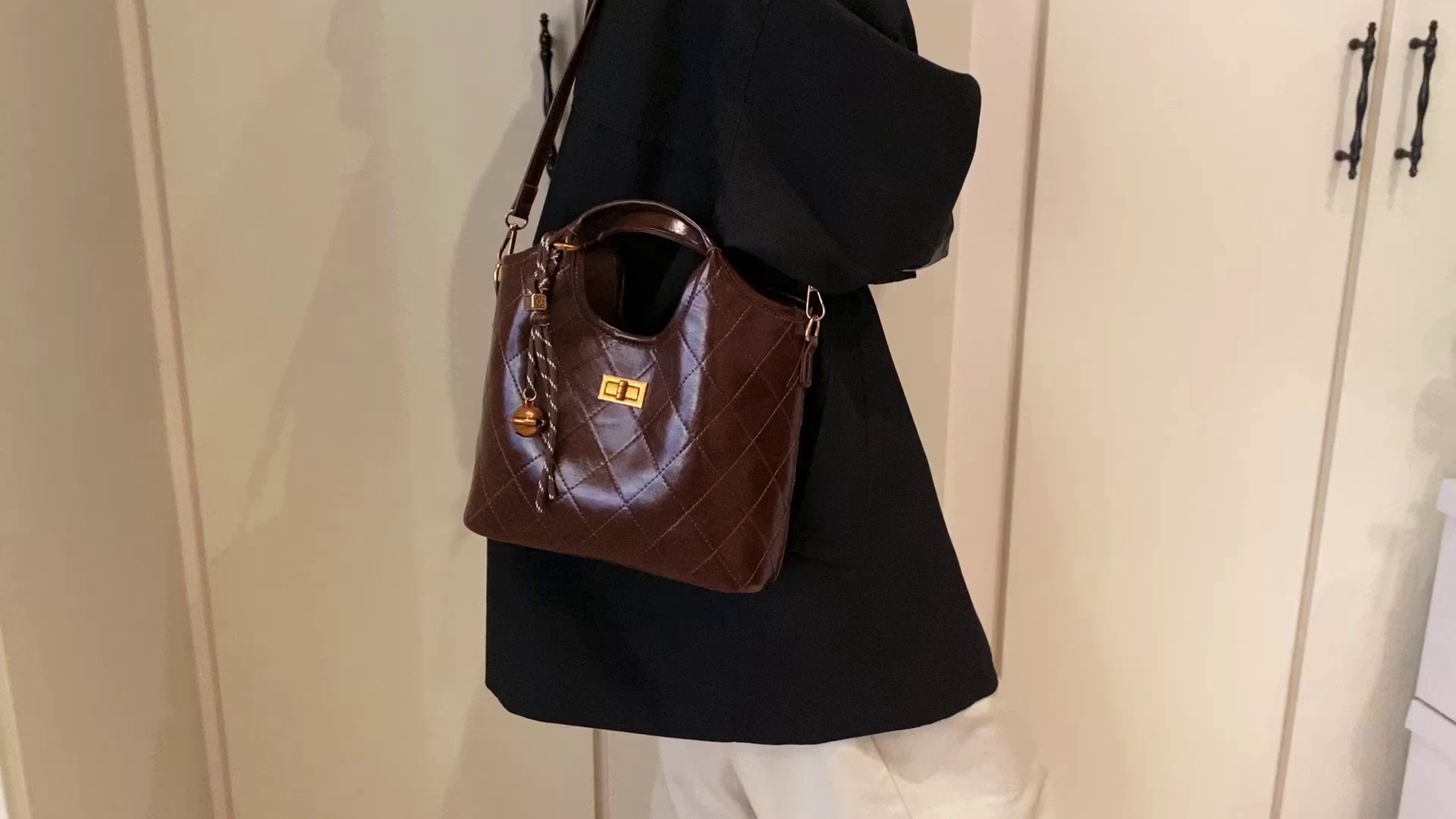高级感通勤复古水桶包新款菱格手提包单肩斜挎包潮流女包7133