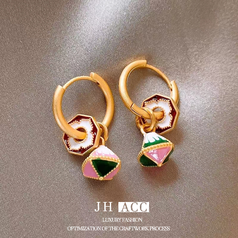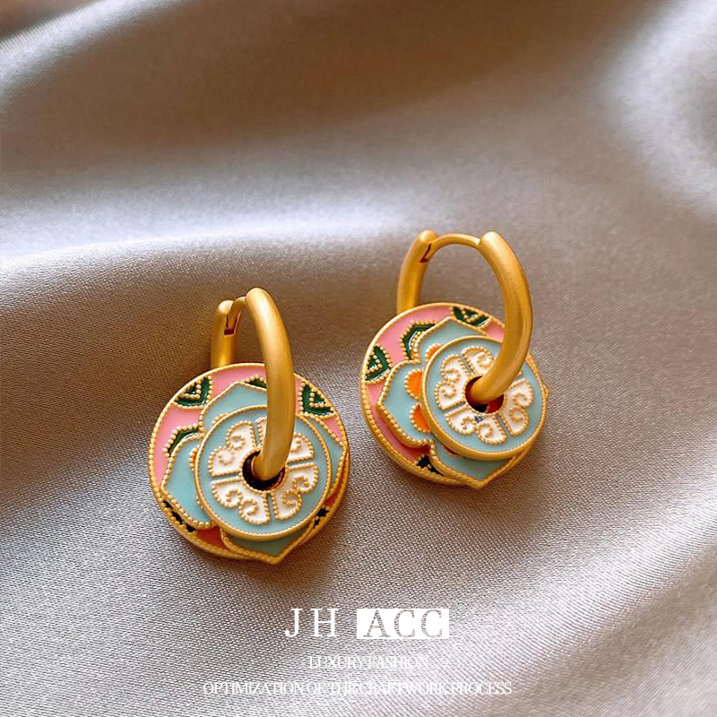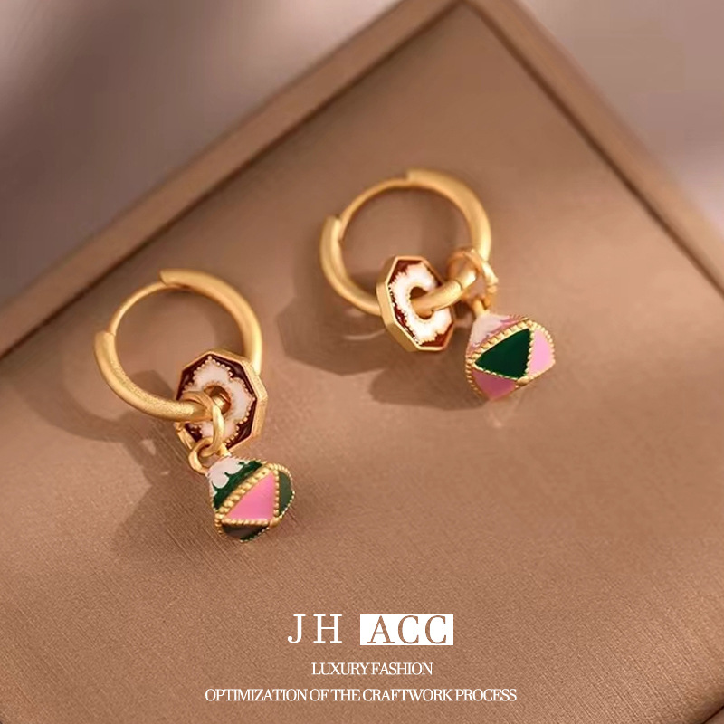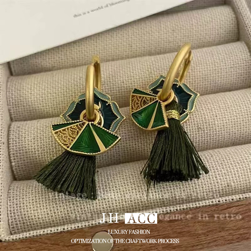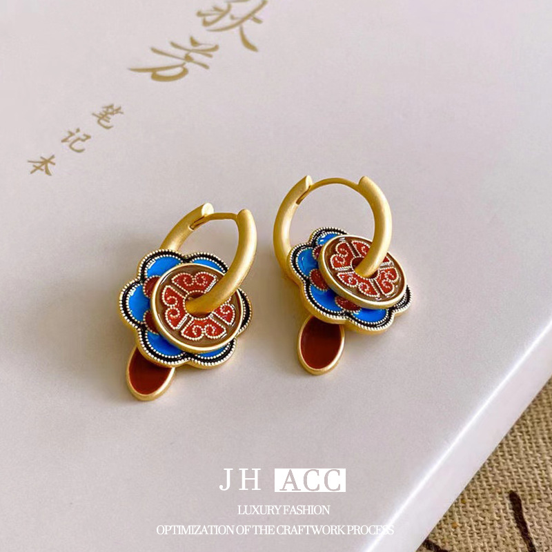 s925新中式国潮珐琅滴釉扇子耳环女小众高级设计一款多戴彩绘耳饰