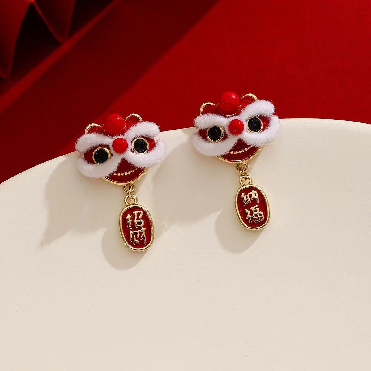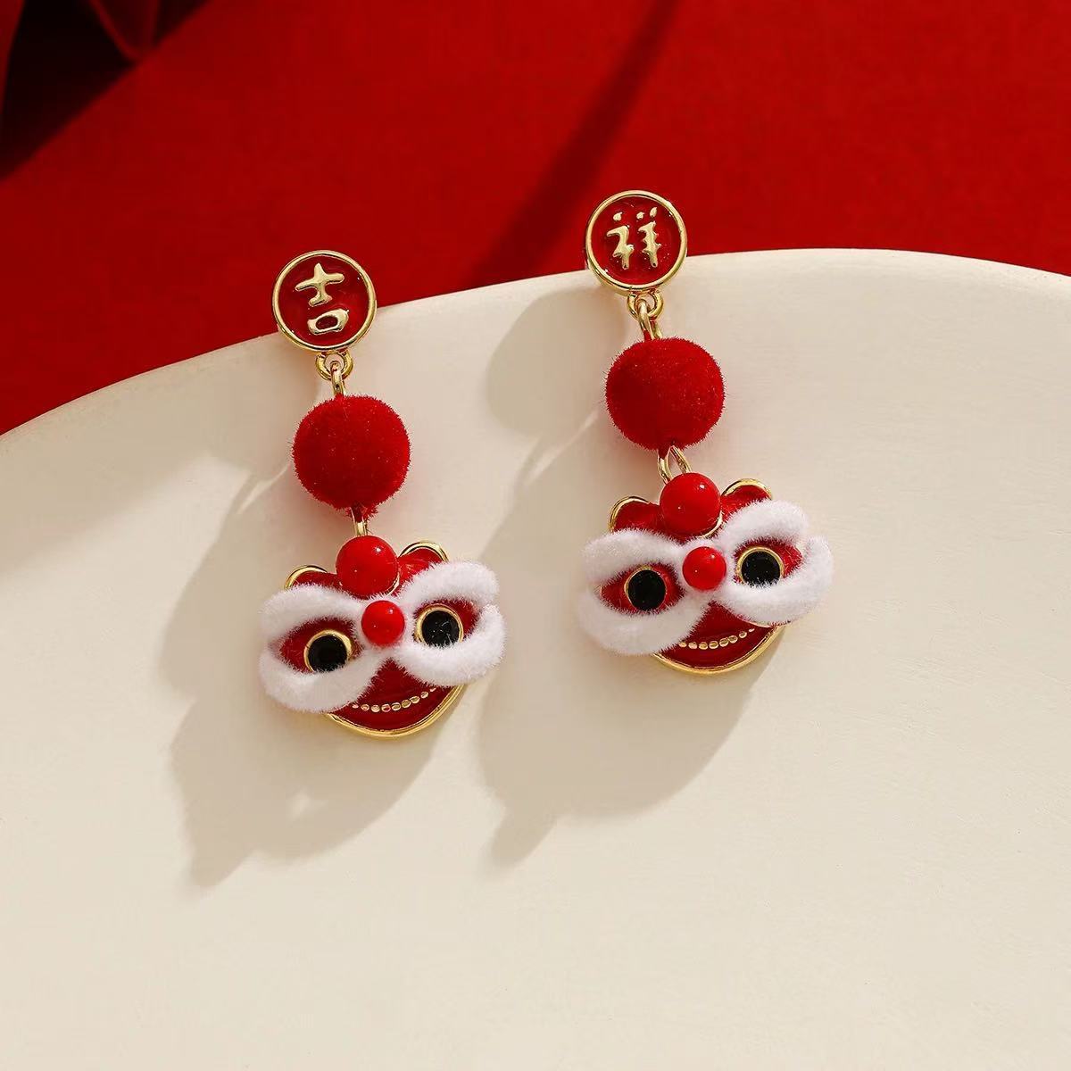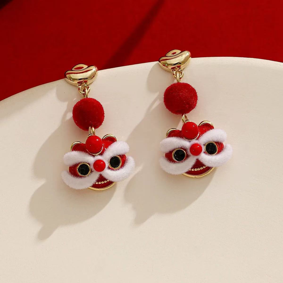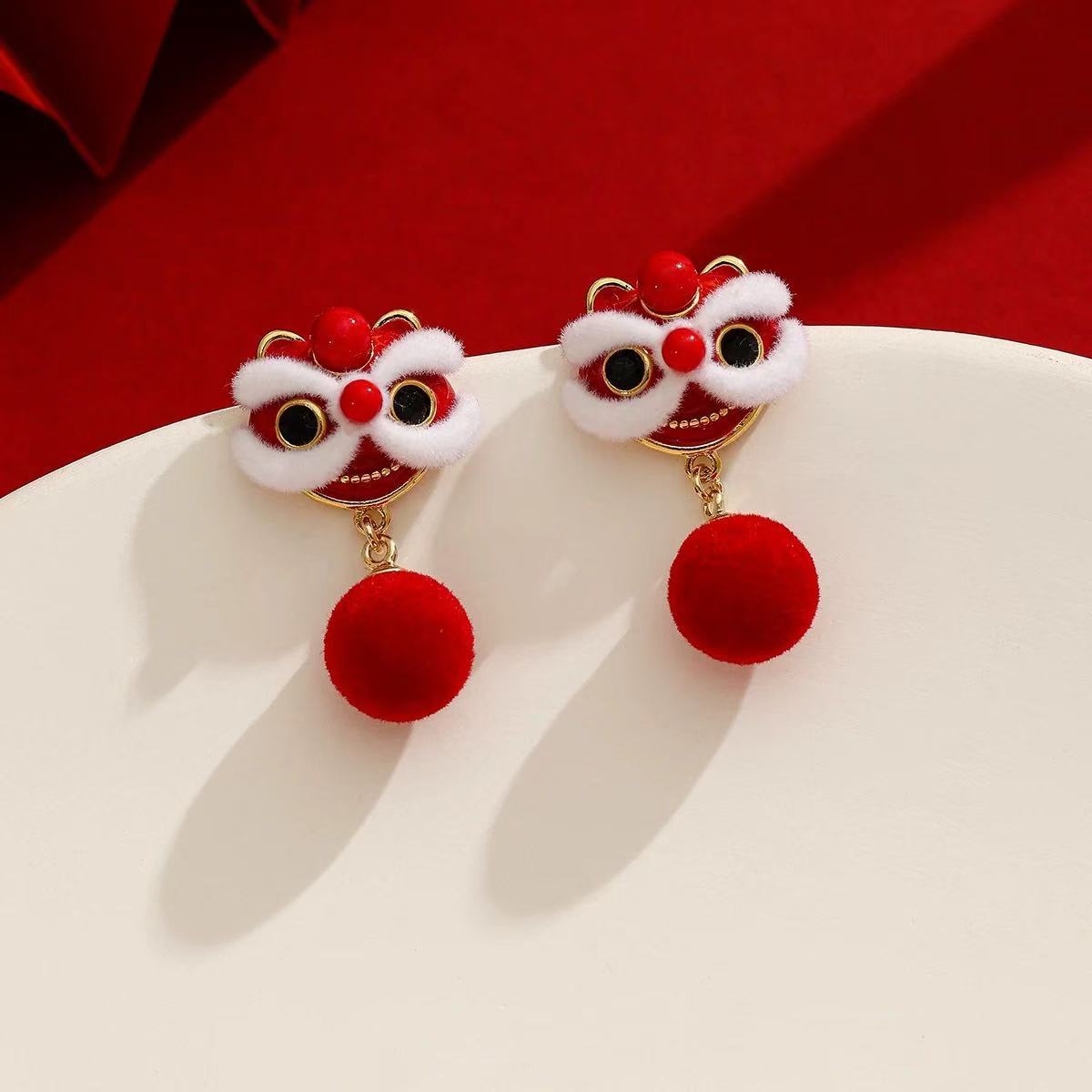 新年喜庆醒狮醒狮耳环秋冬小众过年氛围感气质过年戴醒狮毛球耳环