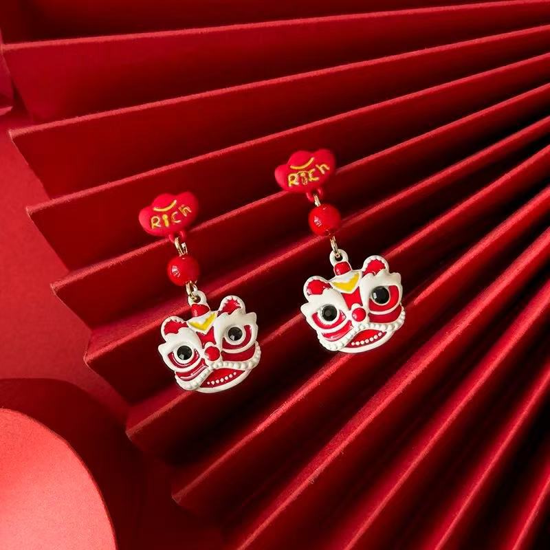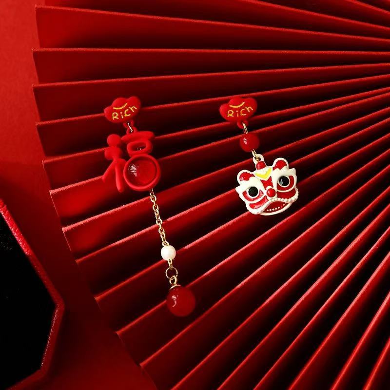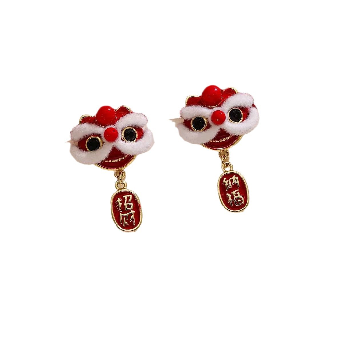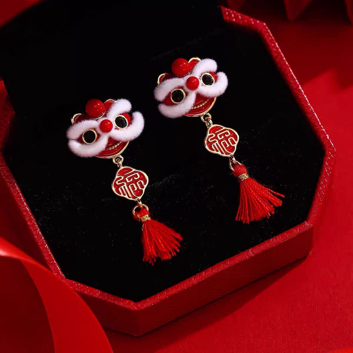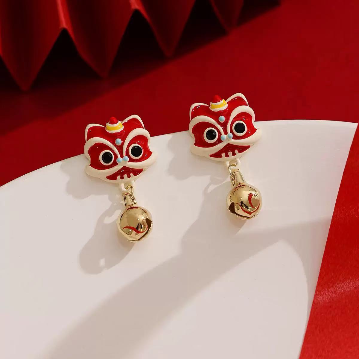 新年喜庆醒狮醒狮耳环秋冬小众过年氛围感气质过年戴醒狮毛球耳环