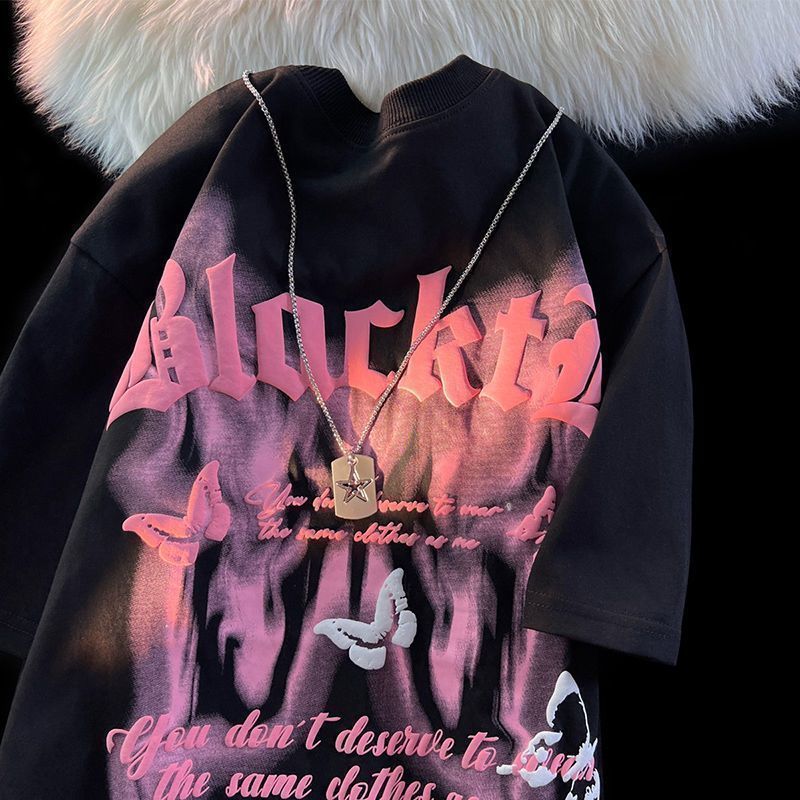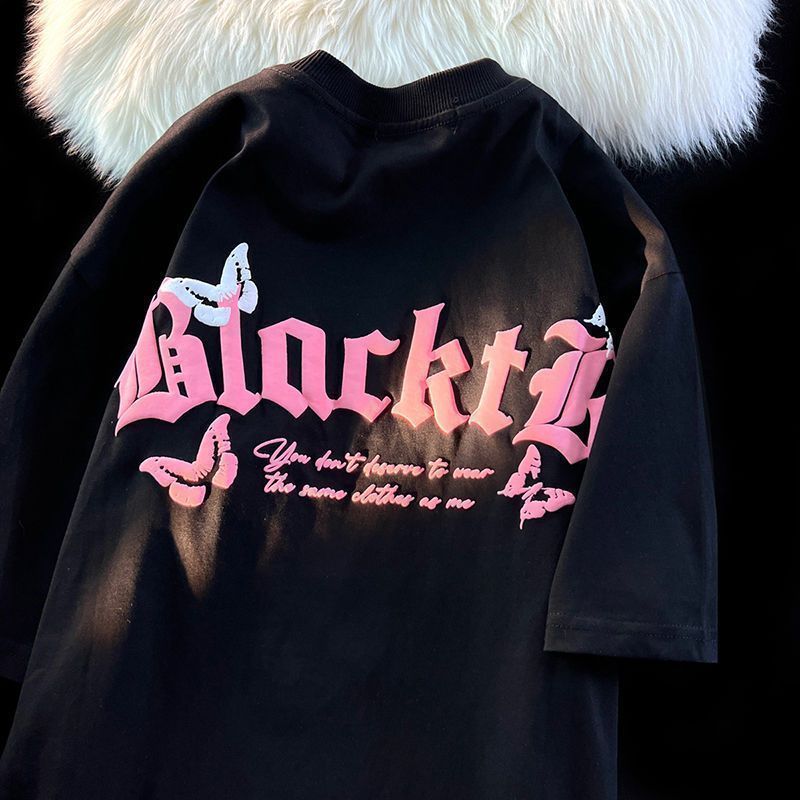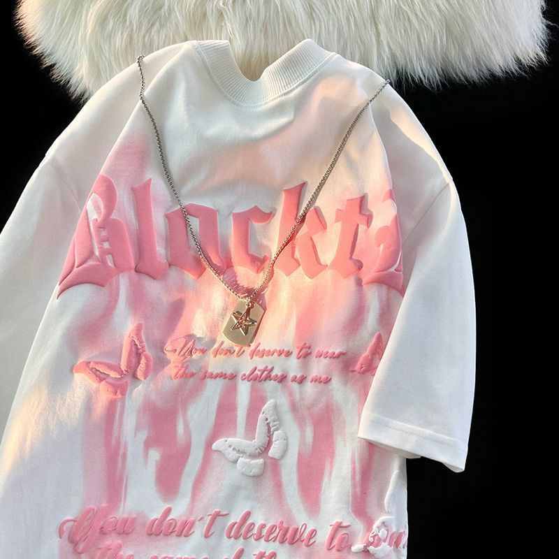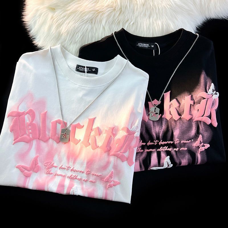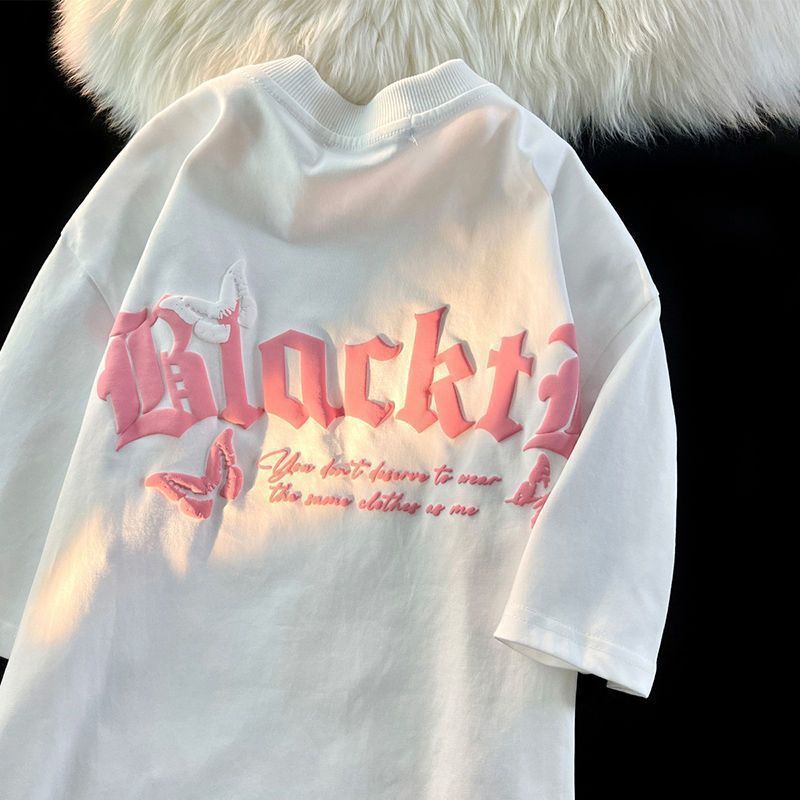 100%不起球国潮流美式校园风短袖t恤女中长款显瘦字母ins风上衣男