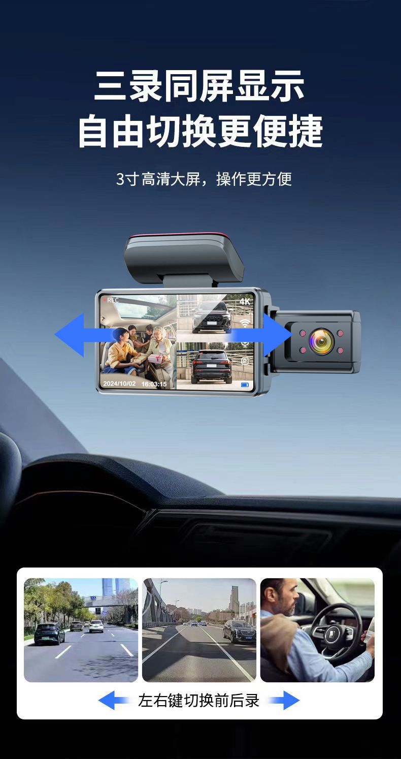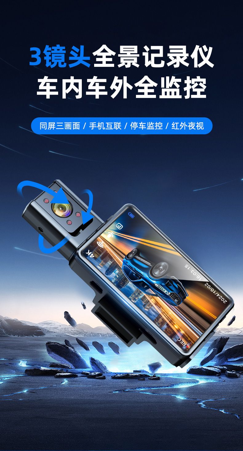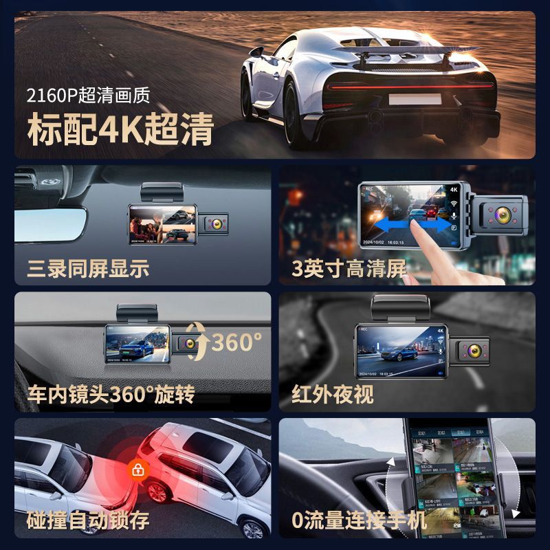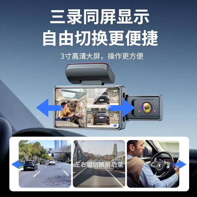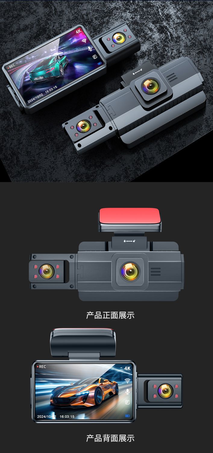 行车记录仪三录同屏360度全景录像4K超高清夜视倒车影像免安装