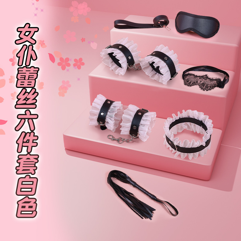 产品配件包含:女仆蕾丝六件套:皮革眼罩 蕾丝眼罩 手铐 脚铐 皮鞭 项圈+牵引绳