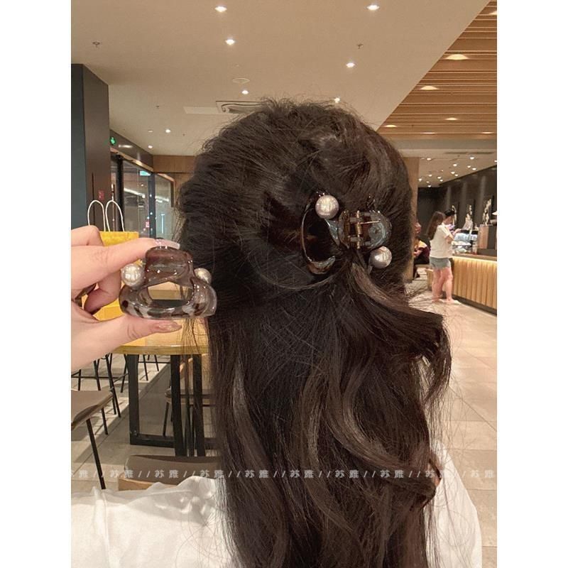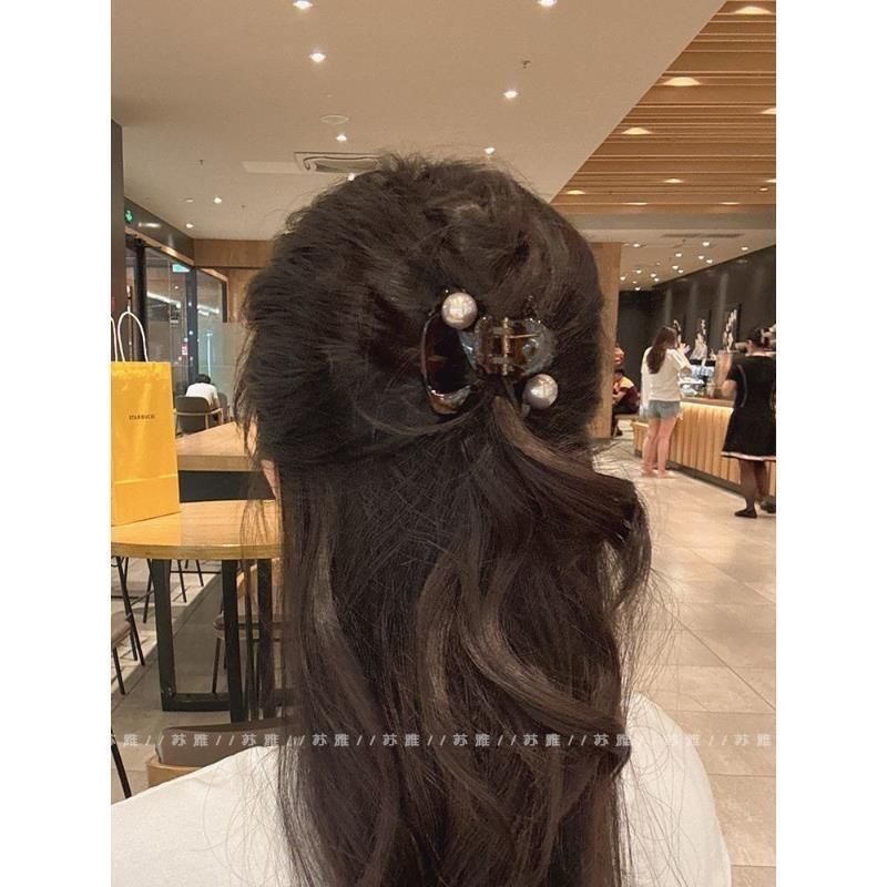 高级感豹纹珍珠抓夹女2024新款半扎发鲨鱼夹发饰后脑勺盘发小抓夹