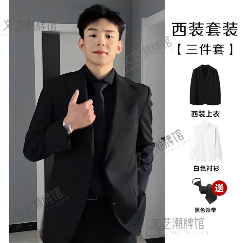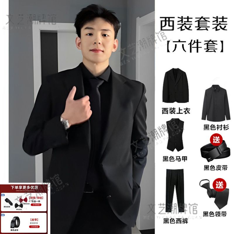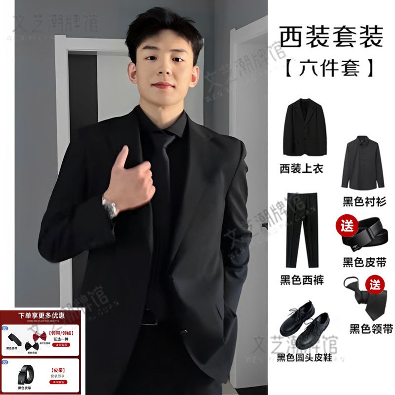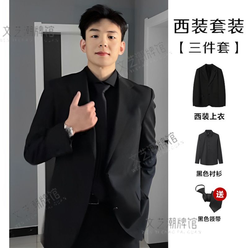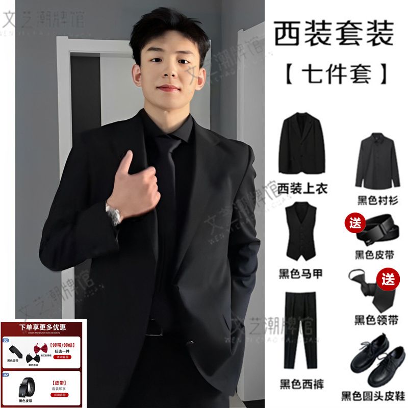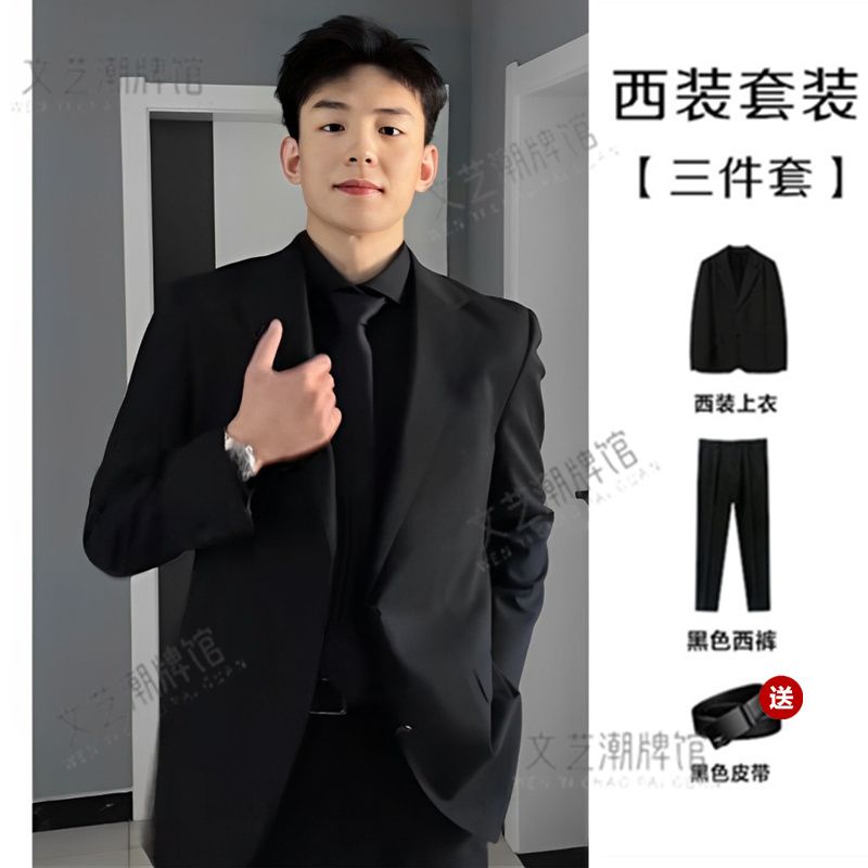 韩版修身黑色西服套装男士面试上班工作服商务帅气小西装一整套