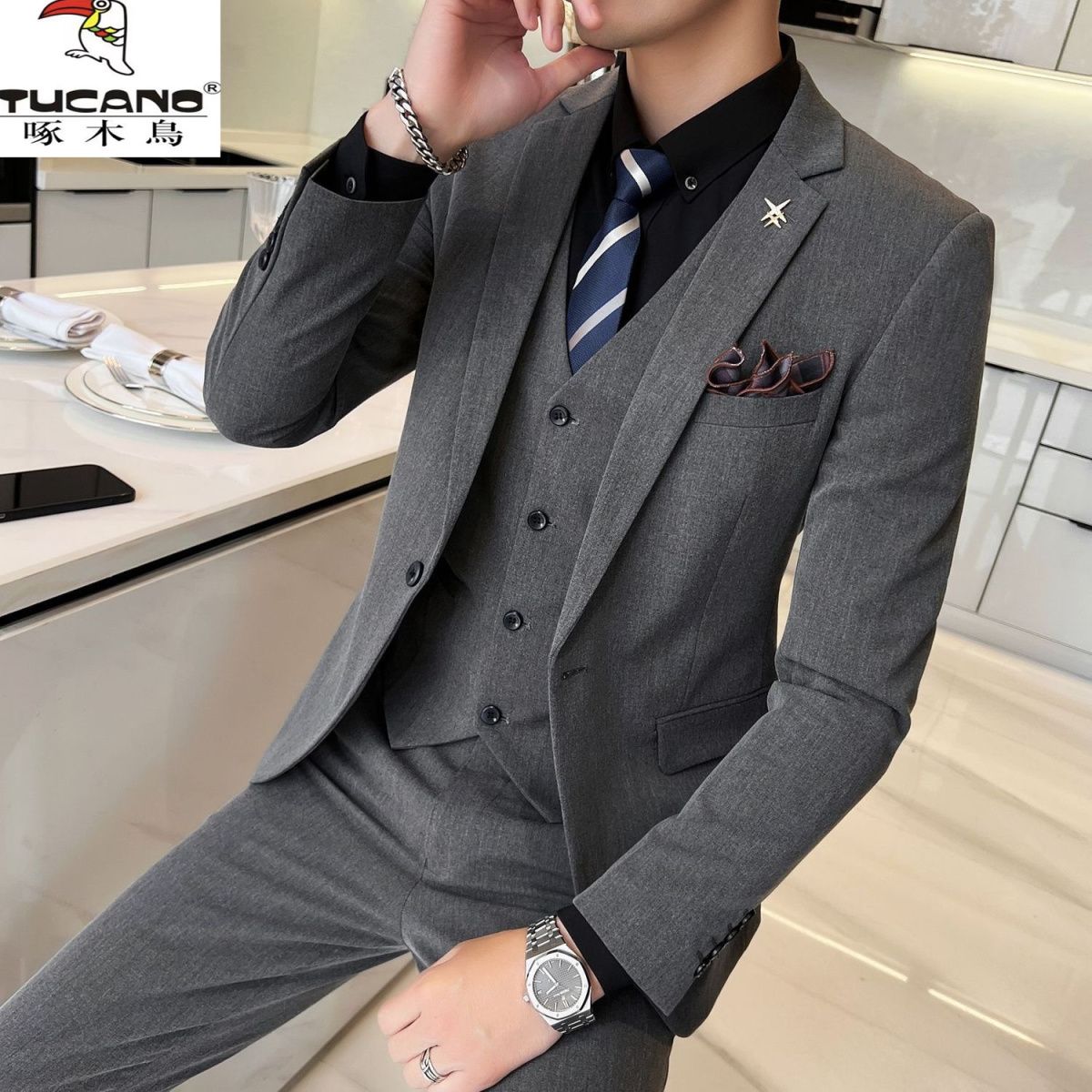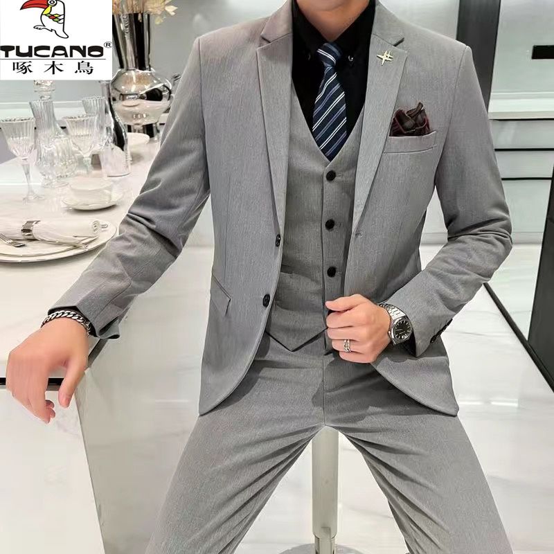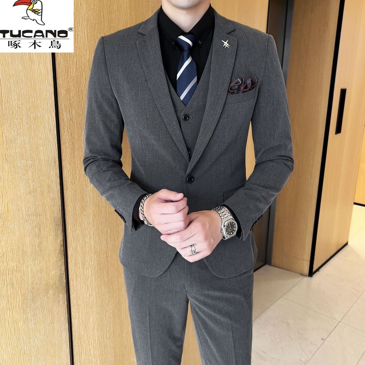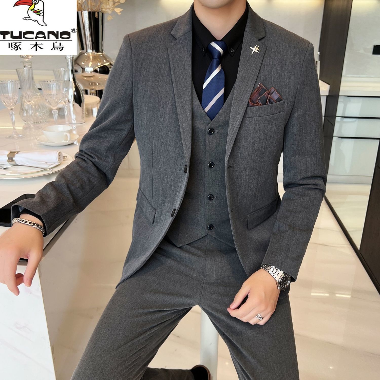 啄木鸟西服套装男2粒扣三件套韩版修身商务正装小西装新郎结婚礼