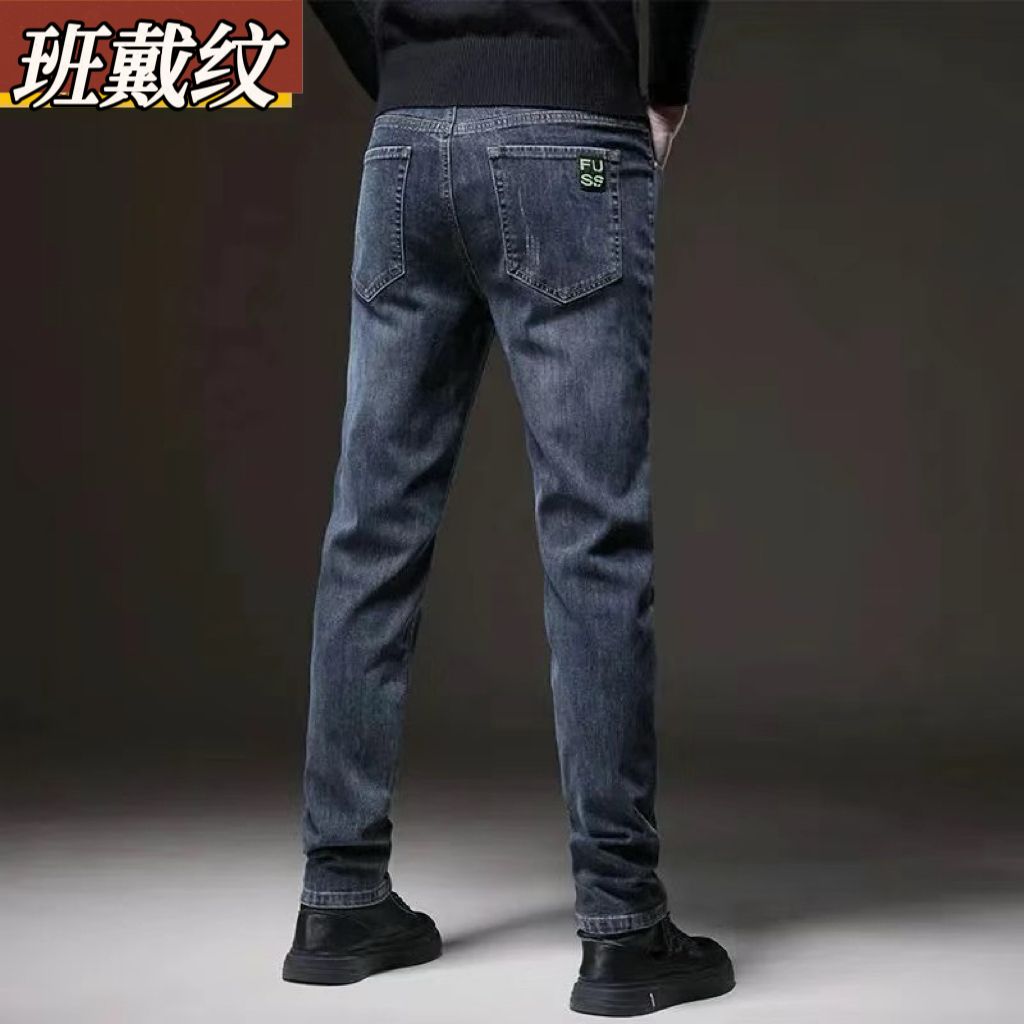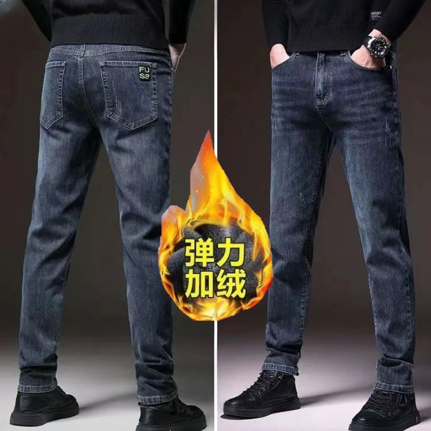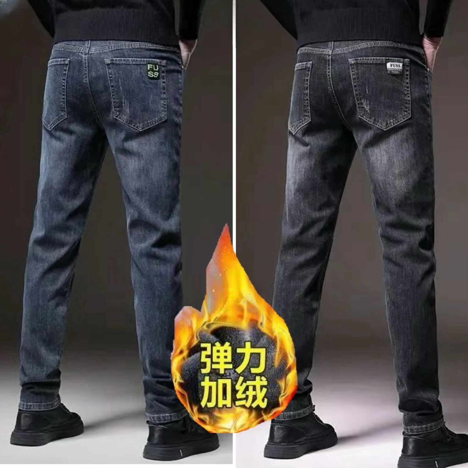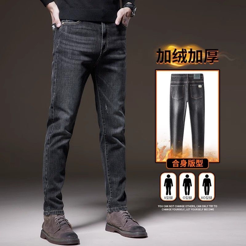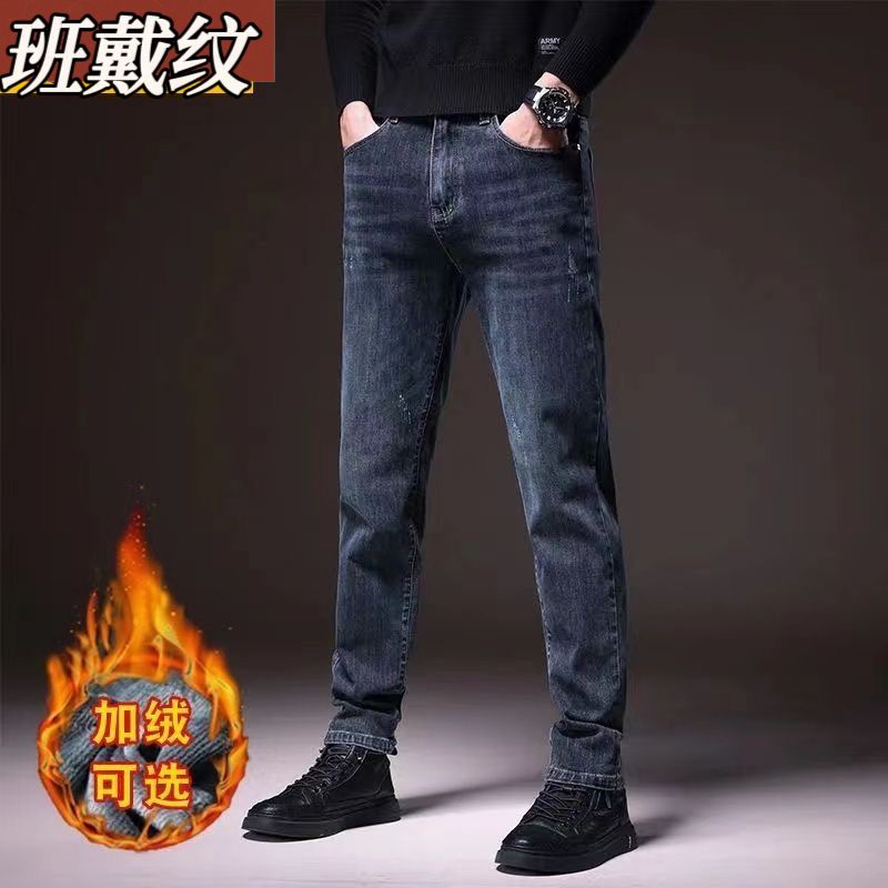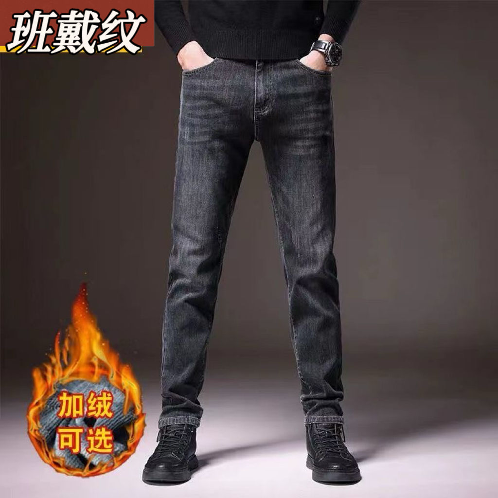班黛纹加绒加厚男士新款牛仔裤宽松裤子修身长裤弹力休闲直筒复古