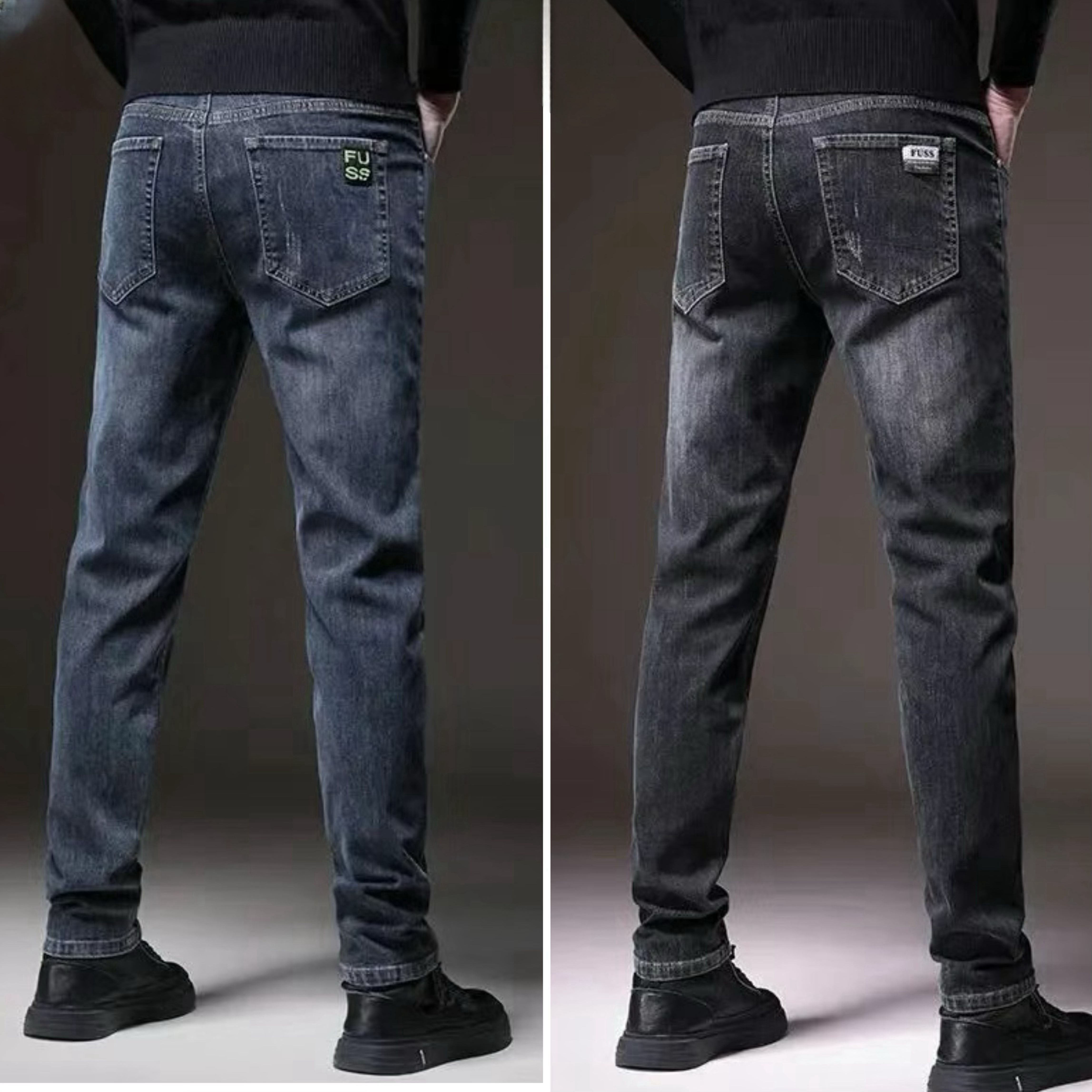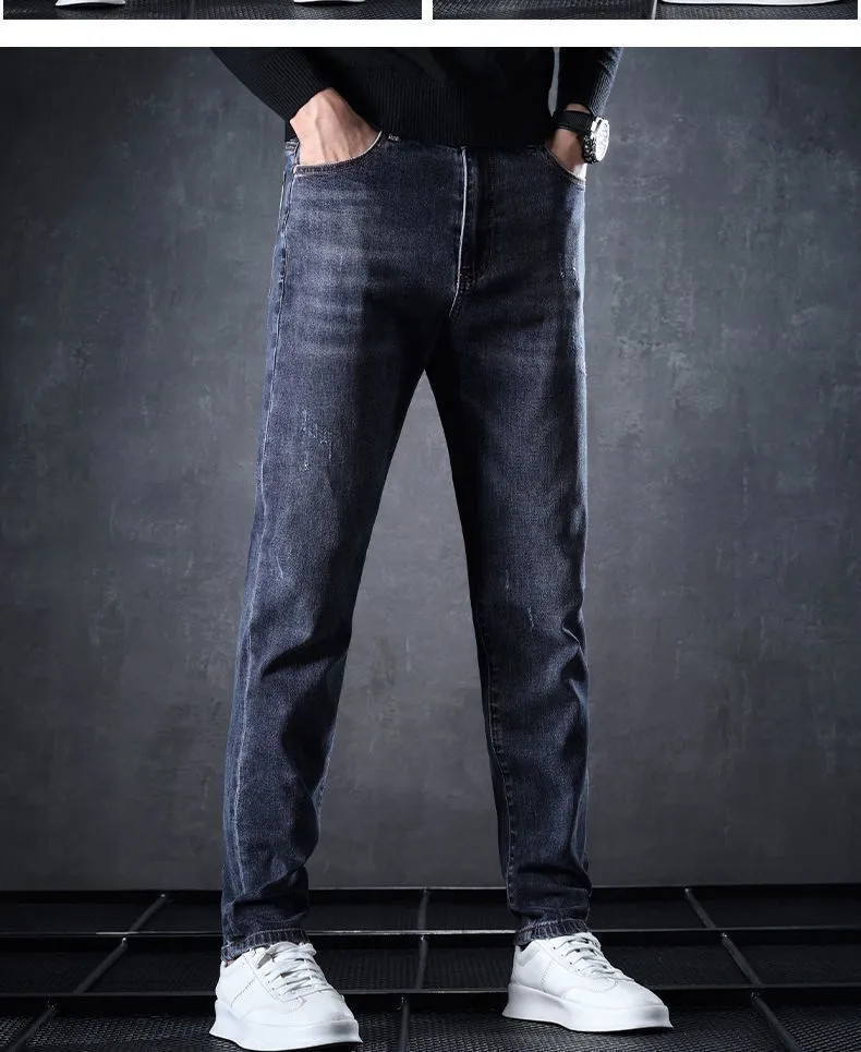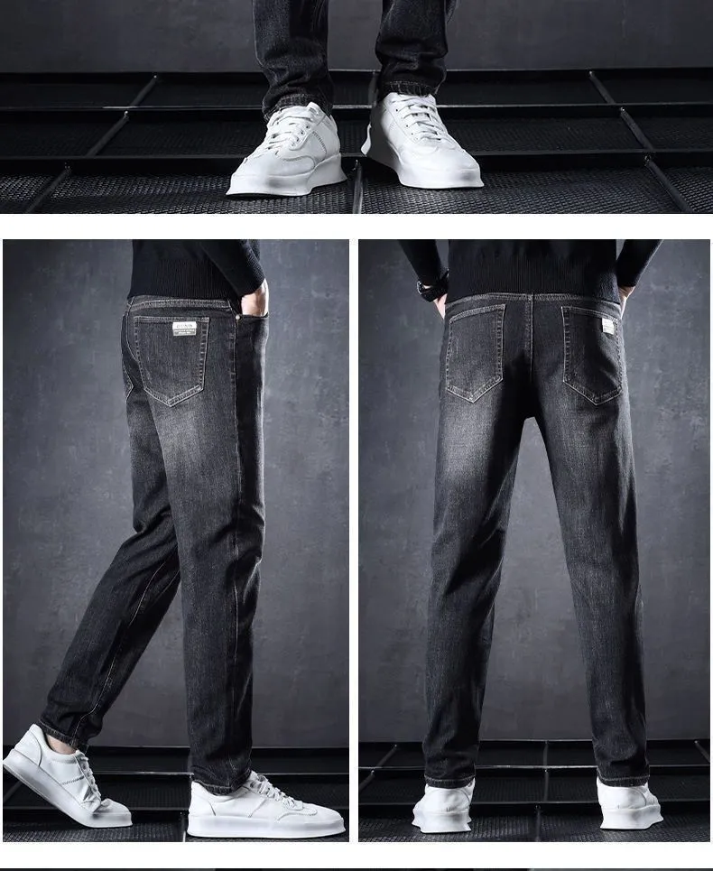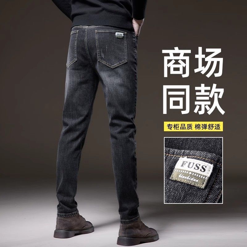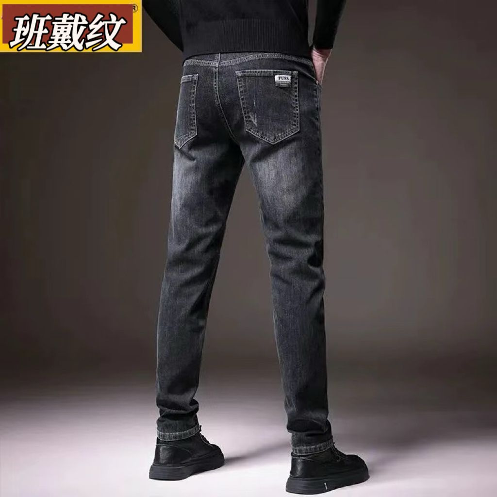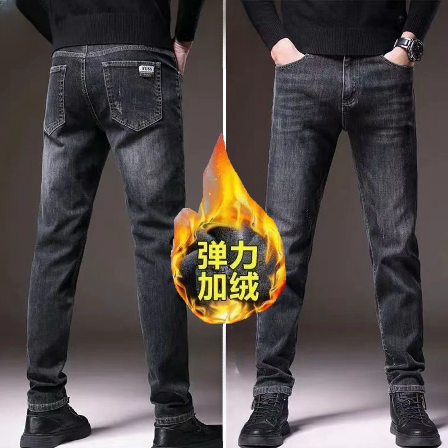 班黛纹加绒加厚男士新款牛仔裤宽松裤子修身长裤弹力休闲直筒复古