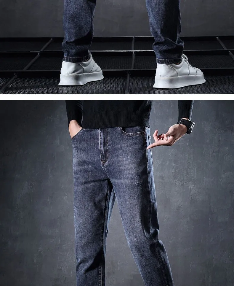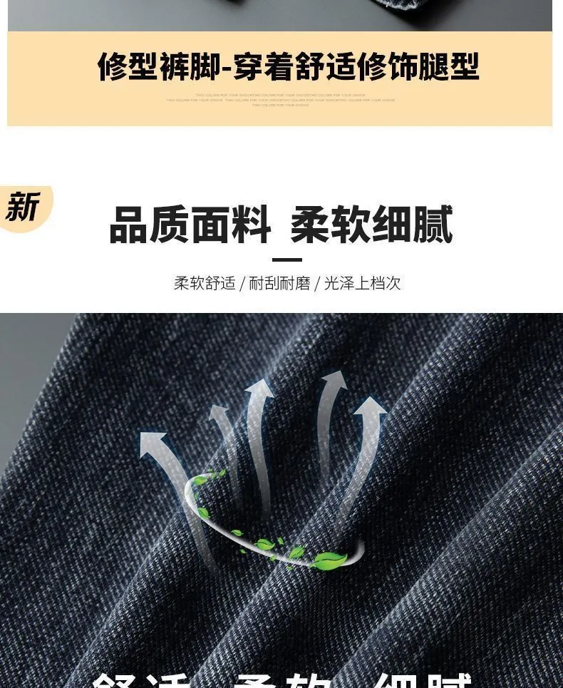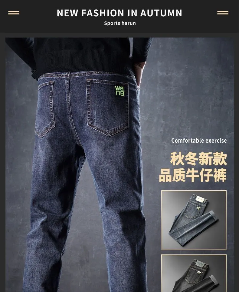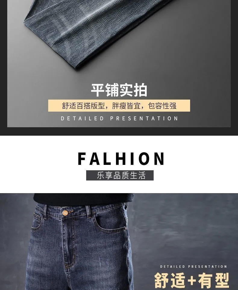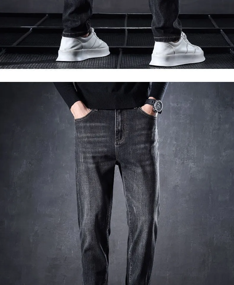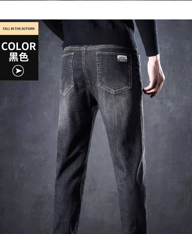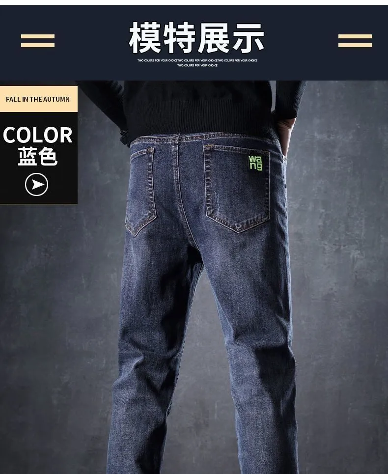 班黛纹加绒加厚男士新款牛仔裤宽松裤子修身长裤弹力休闲直筒复古