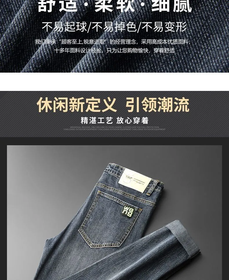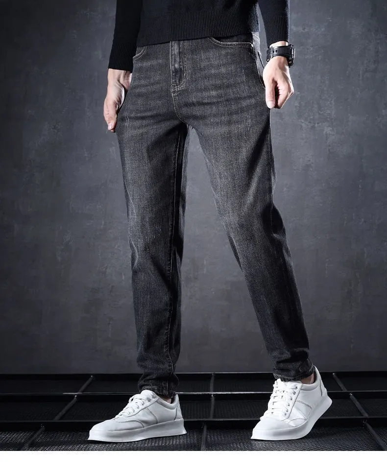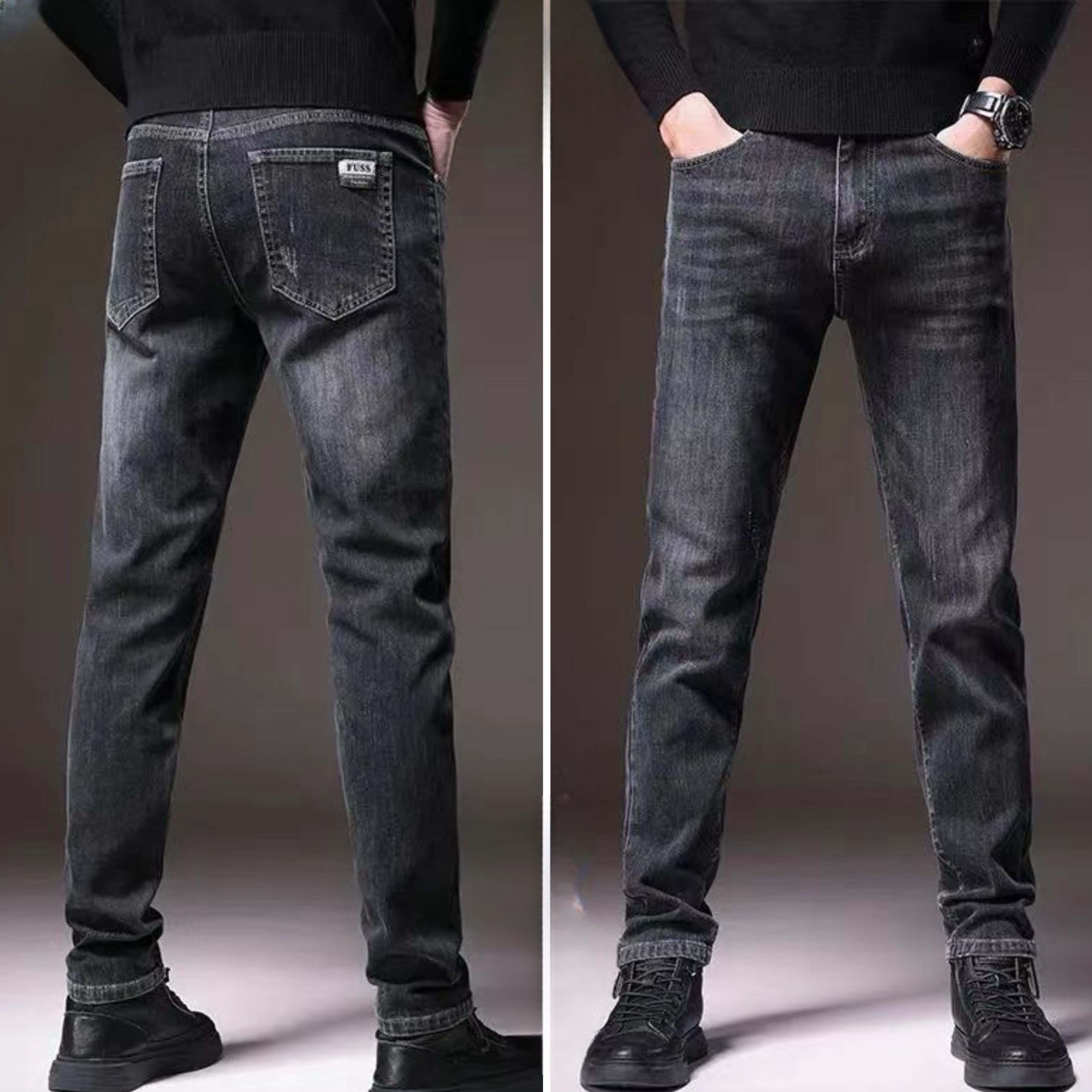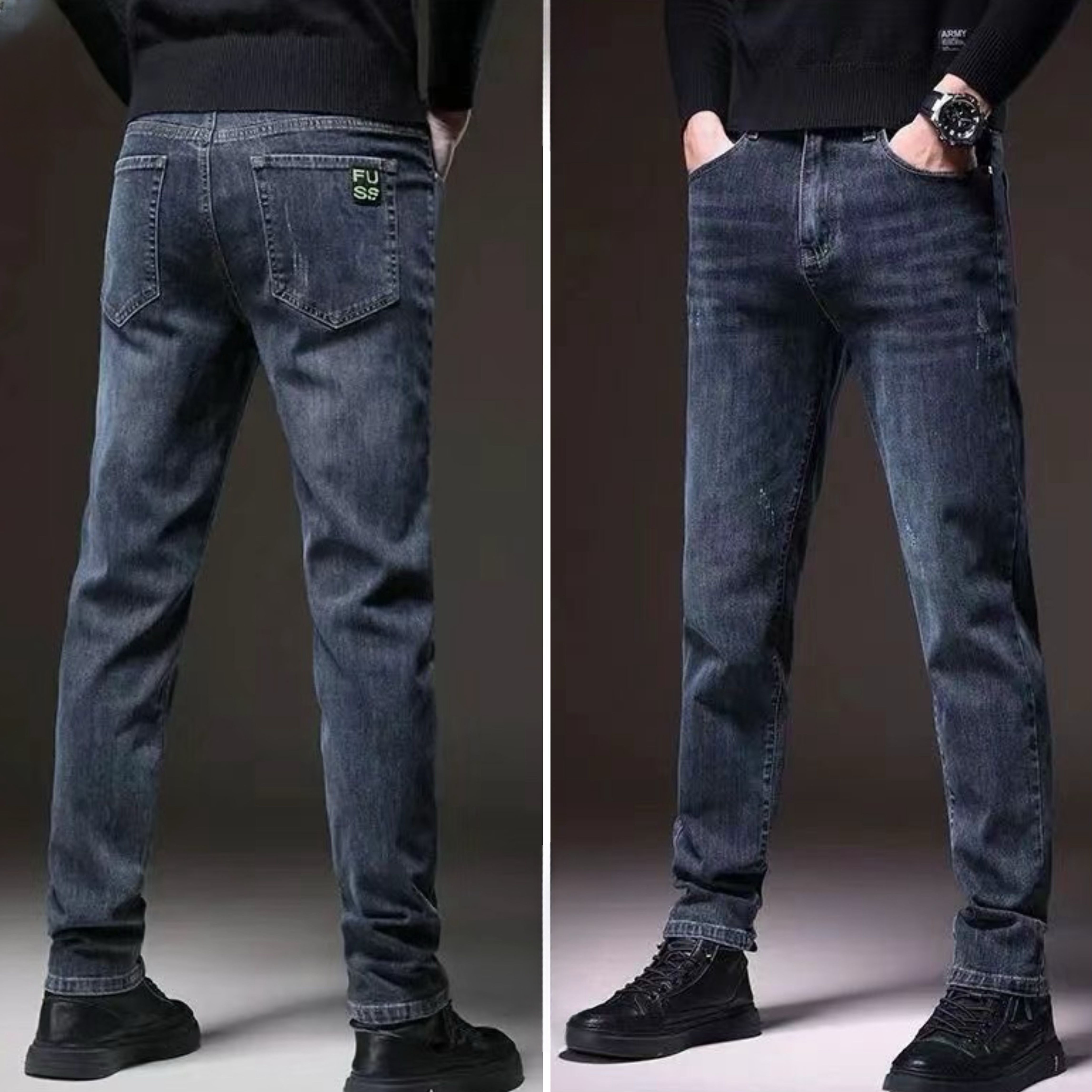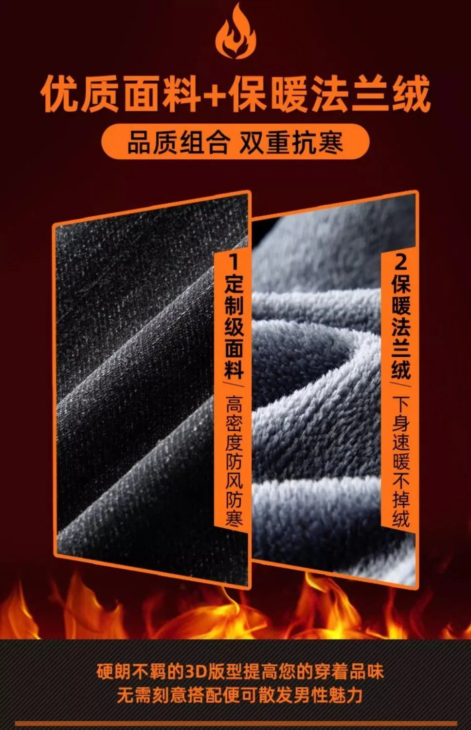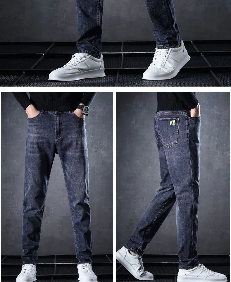 班黛纹加绒加厚男士新款牛仔裤宽松裤子修身长裤弹力休闲直筒复古
