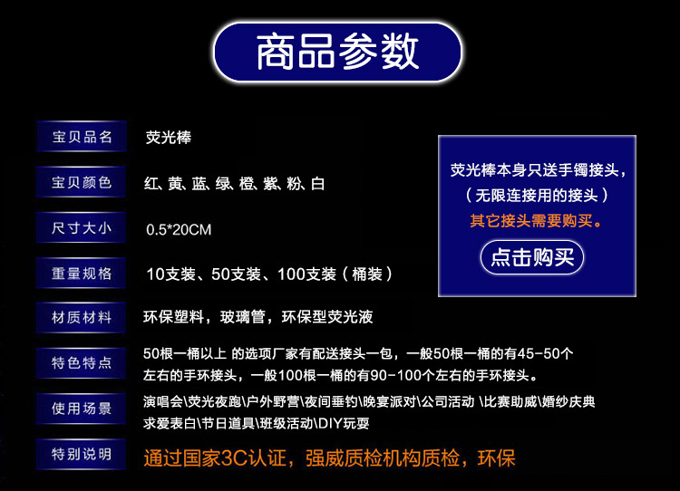 | 10 colors light stick 100 pieces (free bracelet connector)(10色荧光棒100只(送手环接头)) | USD $3.26 | 999999 piece available |